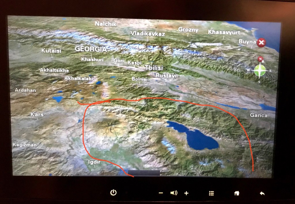 One of my interests is to pore over maps, so instead of watching inflight movies, I like to study the flight map. As I was moving the map around, I noticed something quite interesting. I could not find Armenia.