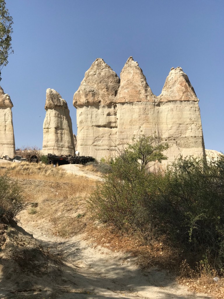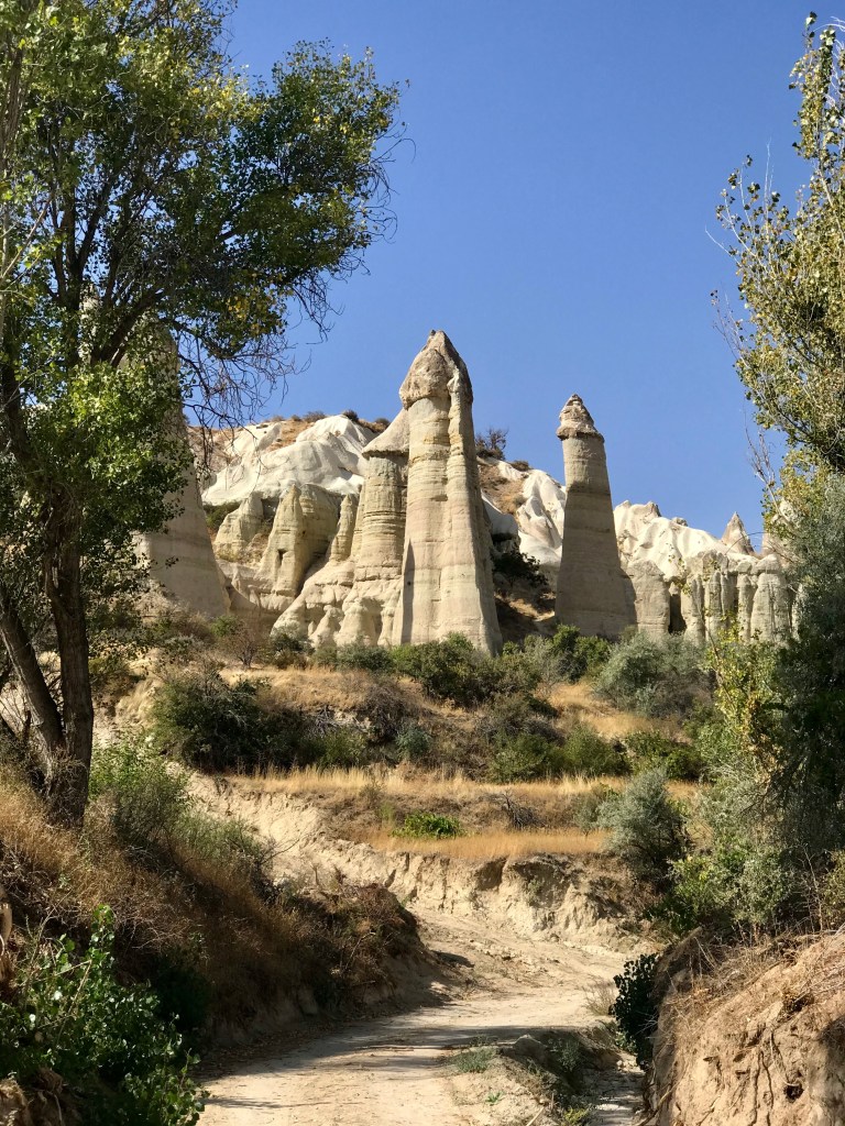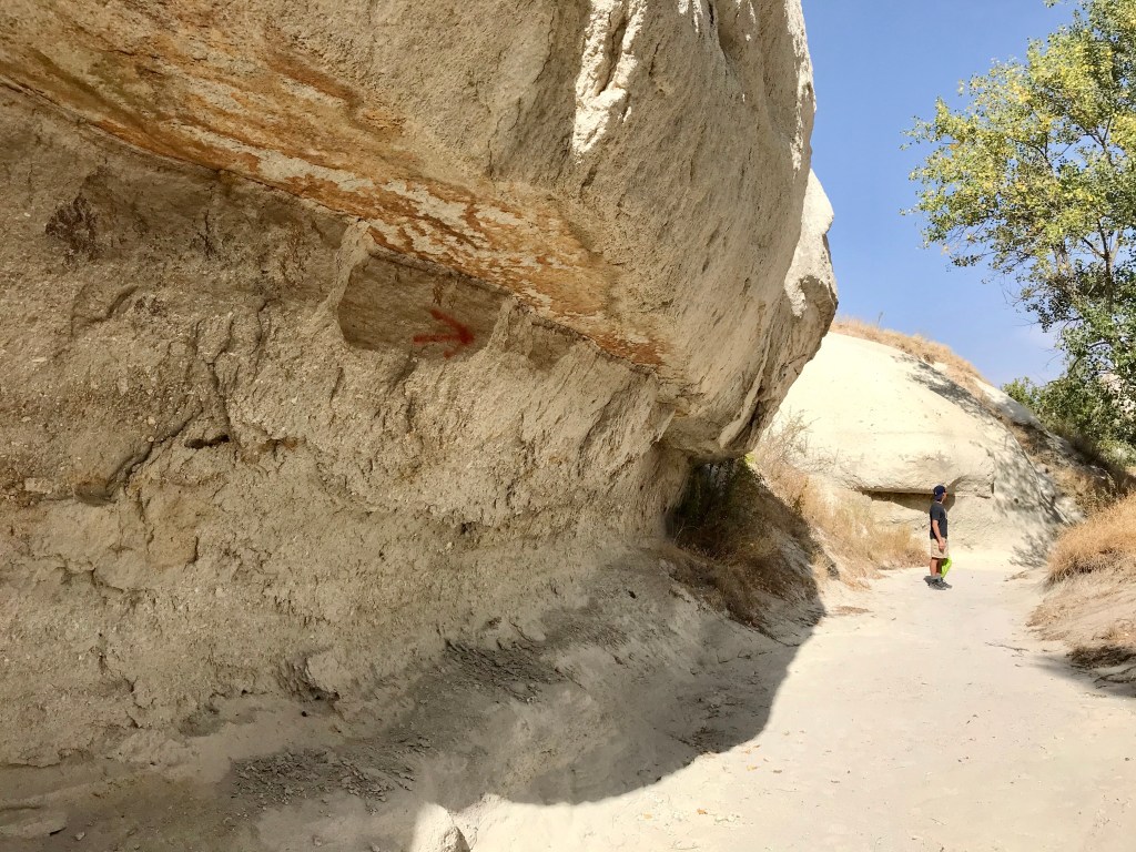 Once at the bottom of Uçhisar, we crossed the main road to get to the Love Valley trailhead. The trail forks out into a wider road on the left and a narrower trail on the right (with a sign “Lov Valley” pointing in that direction). The left leads to the Love Valley Panoramic point, where people drive to go watch the hot air balloons in the mornings, and the right is the hiking trail that ultimately brought us down into the valley.