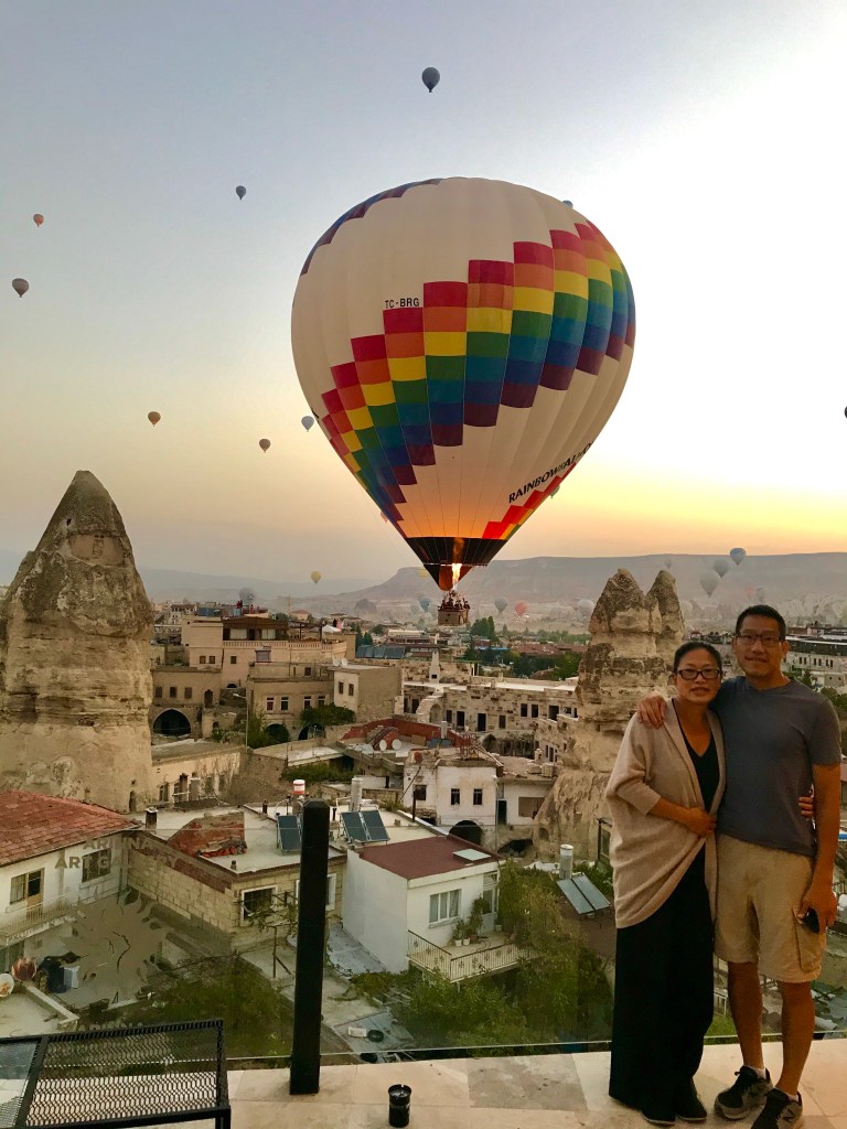 When the alarm went off, I figured I still had time so I went back to sleep. Ten minutes later, Joe heard the the sound of a hot air balloon burner firing. He thought it was strange that he could hear it from so far away. I immediately jumped out of bed, looked out the window, and realized that one of the balloons was right next to the hotel.