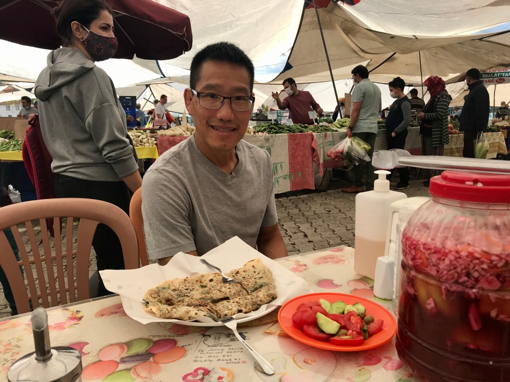 The rain finally stopped late this morning, so we decided to go for a walk around lunchtime. We remembered that today’s the Friday food market, where all the villagers bring in all their produce into town to sell, so we set off for the market.