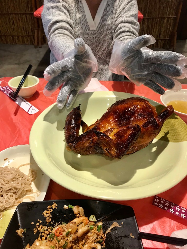 Other than the food, everything else is self serve. You grab your own utensils, as well as boxes & bags for left overs later on.甕缸雞 stands for chicken that’s roasted in these big urns. The chickens are basted and placed vertically on a skewer within the urns, which are heated on wood/charcoal fire.The result is this tasty chicken with crispy skin. Might just be better than Costco’s rotisserie chicken (this coming from a Costco rotisserie chicken addict).They provide you with a pair of heat insulated gloves to be worn under plastic gloves To break up the hot chicken without getting your hands dirty