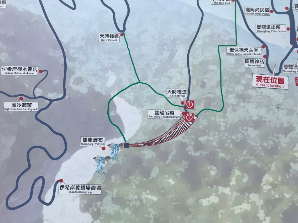 The site we visited today is a mouthful – Double Dragon Waterfall Rainbow Suspension Bridge (雙龍瀑布七彩吊橋). The Double Dragon refers to the double waterfalls, and the rainbow suspension bridge is the longest in Taiwan. The town that it’s located in is named after the two waterfalls – 雙龍 in Nantou (南投) area, about an hour fifteen minute drive from Xitou (溪頭). How we happened upon this place was by pure happenstance. I had wanted to see what was in the area, and as I was scanning the Sun Moon Lake region on Google maps, the photo icon for this place appeared on the map. Always a sucker for waterfalls and suspension bridges, I decided to check it out.