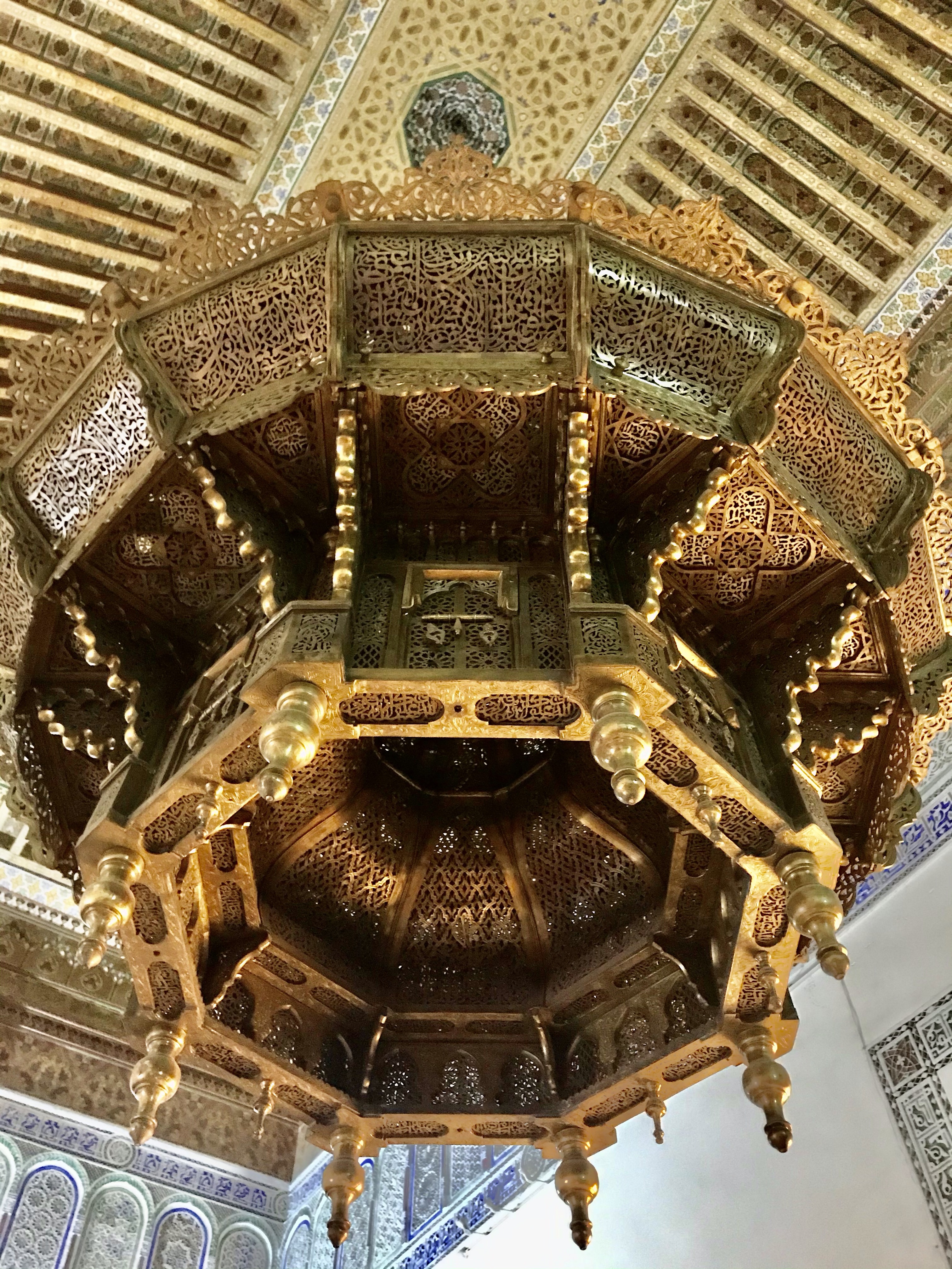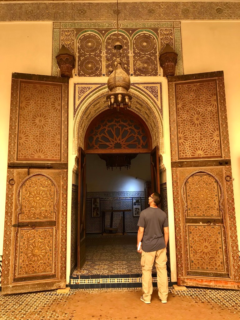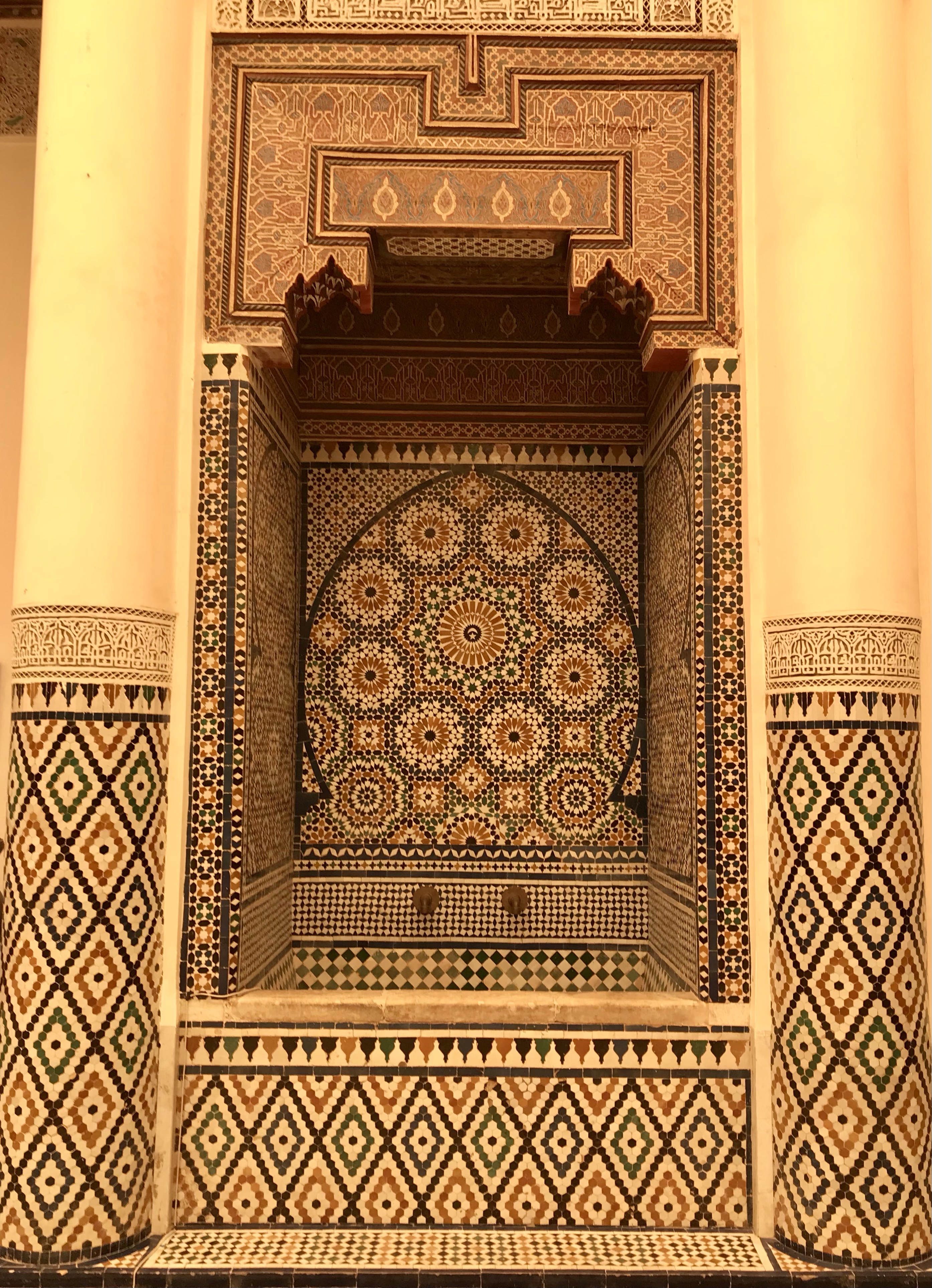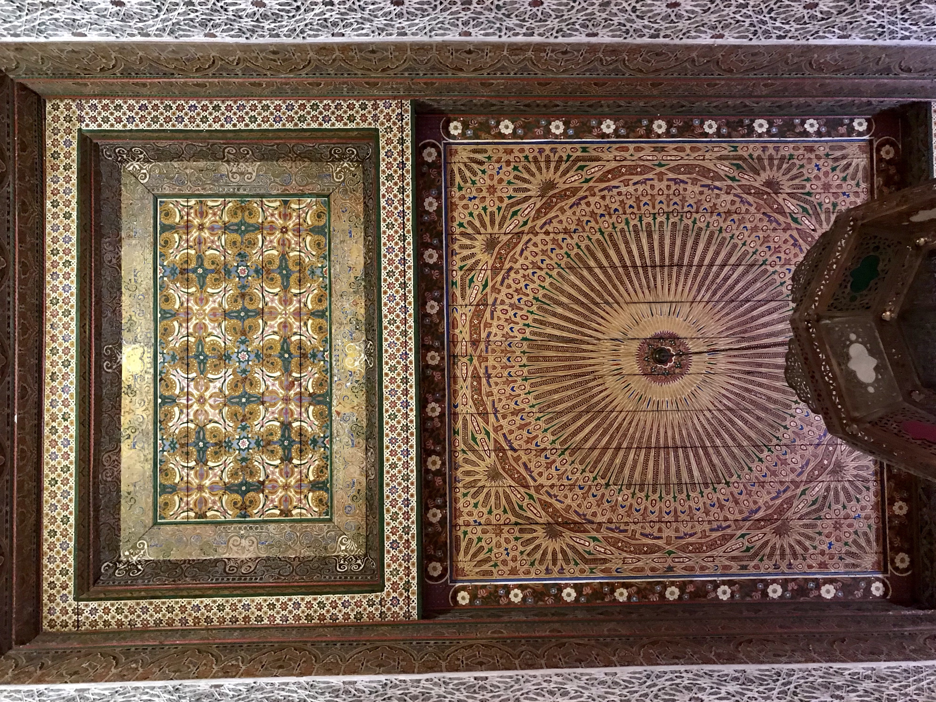 Today was a “free” day without a guide, so we walked around the Medina after lunch. Unfortunately, a lot of sites have been closed due to Covid and renovations, which put a slight damper on our adventures. However, we did manage to find something that was open – Museé de Marrakech. This is not your Metropolitan Museum of Art, Louvre, or the Uffizi Gallery. It is a restored palace riad containing a small hodge podge collection of Contemporary, African, and Arabic paintings, pottery of unknown origins, and Berber jewelry and weapons collections. The highlight of the museum, however, was the interior structure.