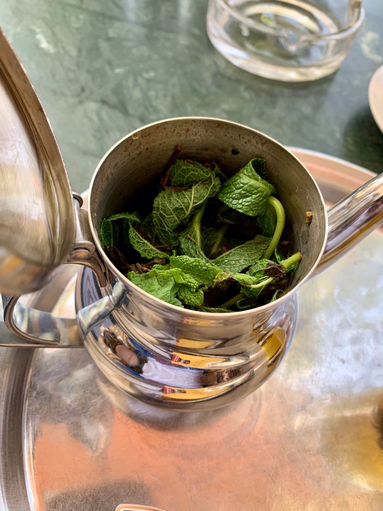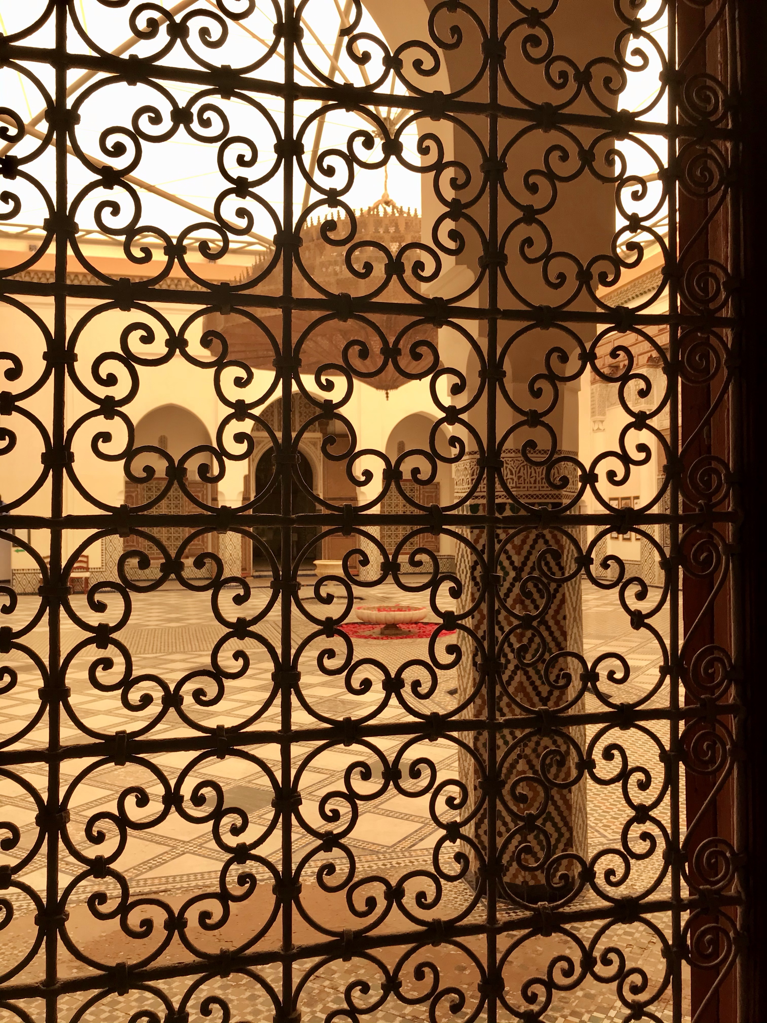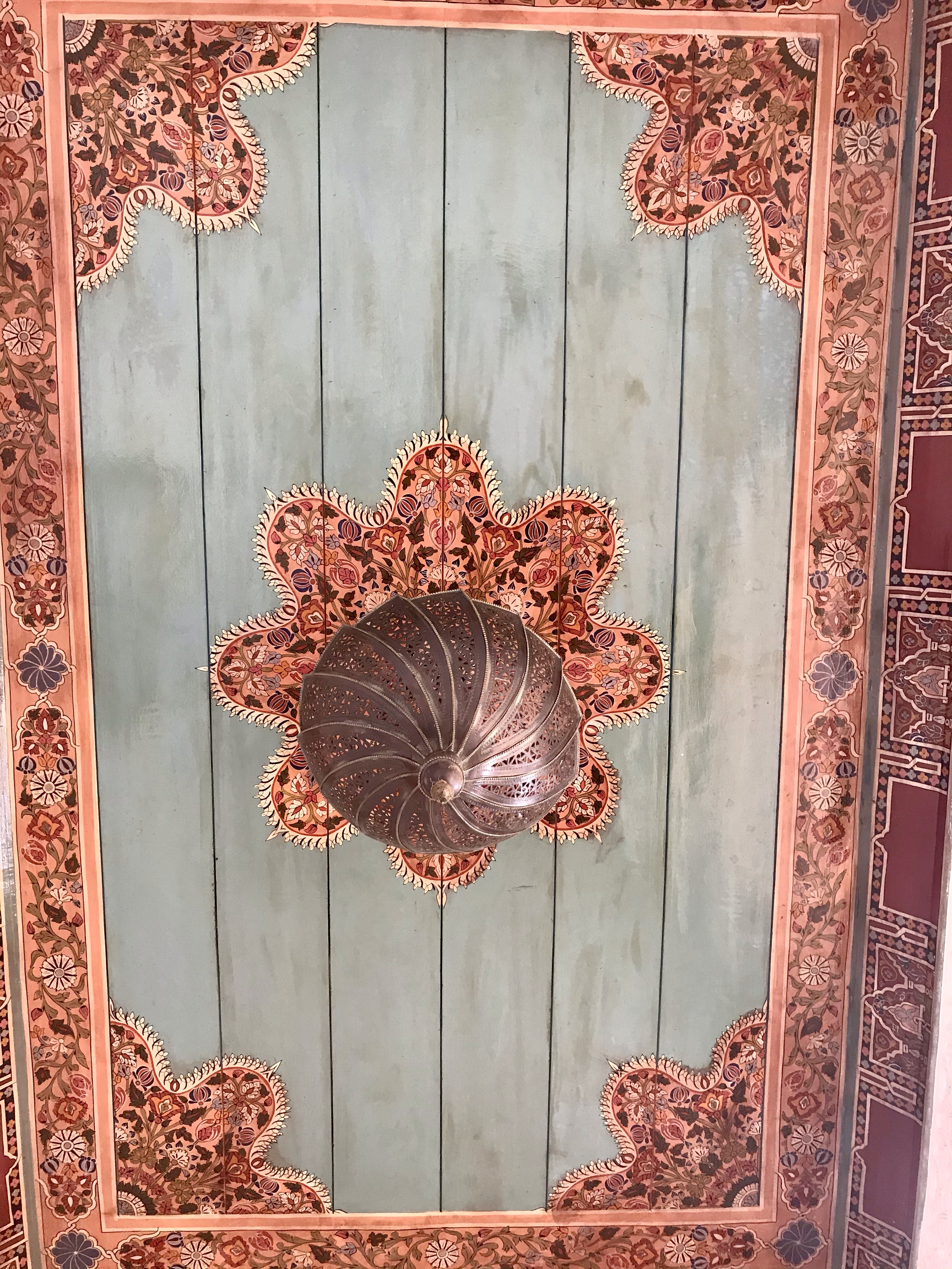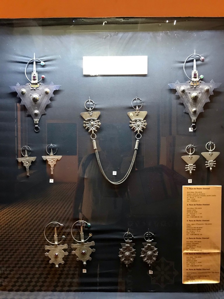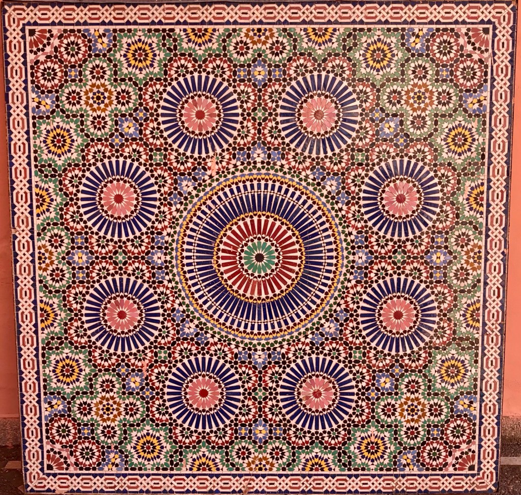 Today was a “free” day without a guide, so we walked around the Medina after lunch. Unfortunately, a lot of sites have been closed due to Covid and renovations, which put a slight damper on our adventures. However, we did manage to find something that was open – Museé de Marrakech. This is not your Metropolitan Museum of Art, Louvre, or the Uffizi Gallery. It is a restored palace riad containing a small hodge podge collection of Contemporary, African, and Arabic paintings, pottery of unknown origins, and Berber jewelry and weapons collections. The highlight of the museum, however, was the interior structure.