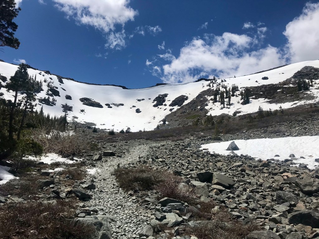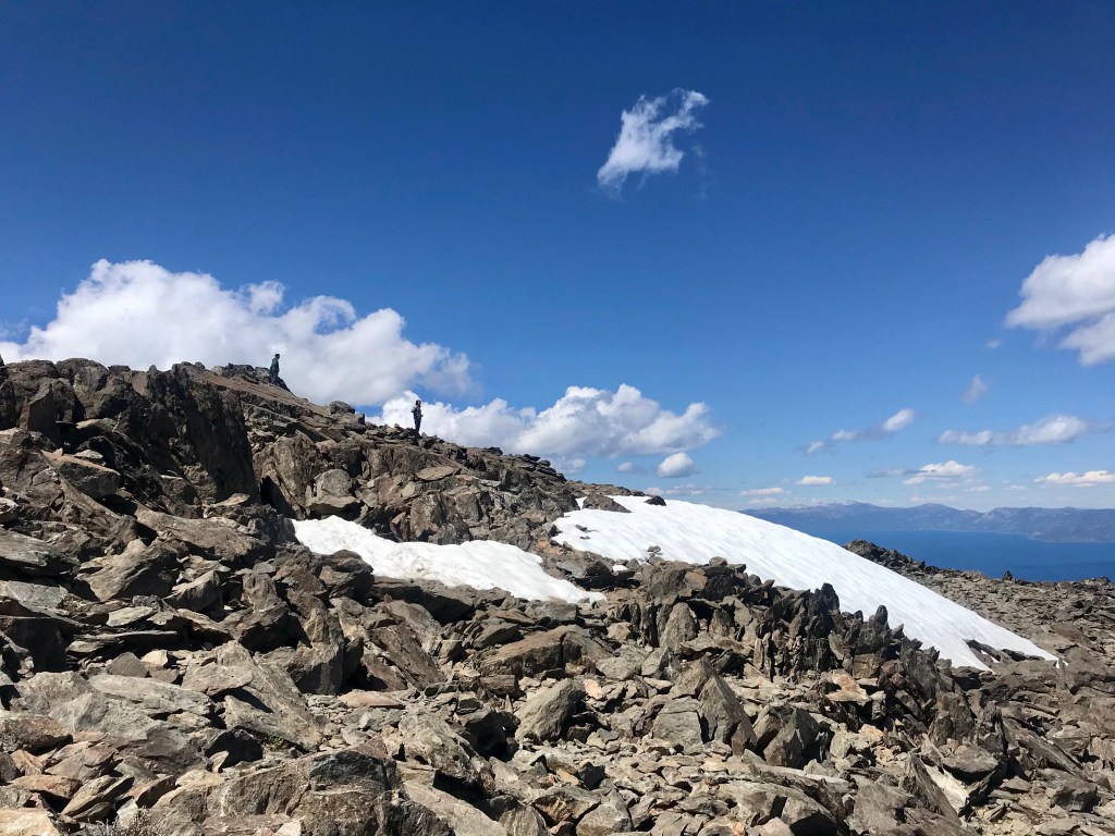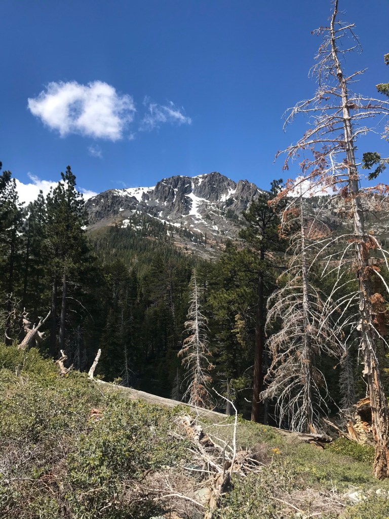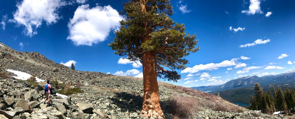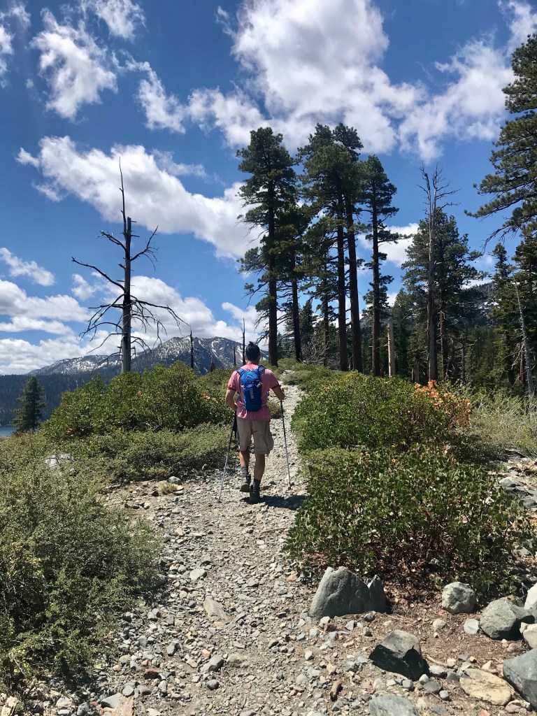 The trail started off with a gradual incline And quickly led us onto the ridge between Fallen Leaf Lake and the eastern aspect of Mt TallacView of Fallen Leaf LakeAnd Mt Tallac. We actually did not realize that this was Mt Tallac at the time, and I had joked with Joe that maybe we were supposed to hike up there. He said it was impossible as it looked to be too far away. Little did we know…Entering into Desolation Wilderness requires a permit.Second lake along the trail, Floating Island Lake.Third lake along the trail – Cathedral Lake. You leave the forested canopy once past this lake.Trail now becomes more exposed But you also start getting a view of Lake Tahoe.At an even higher vantage point, you see Lake Tahoe on the left and Fallen Leaf Lake on the right.This is about when we also started encountering bigger and bigger snow packs.Check out the size of this tree (Joe’s to the left of it)This was probably the hardest section of the hike, but also the most fun with all the rock scrambling.Looking back towards Fallen Leaf Lake See the figures hiking up the snow pack?Yep, that’s what we had to do too. Without microspikes, we dug in our hiking poles at an angle to prevent us from sliding down the side of the mountain.