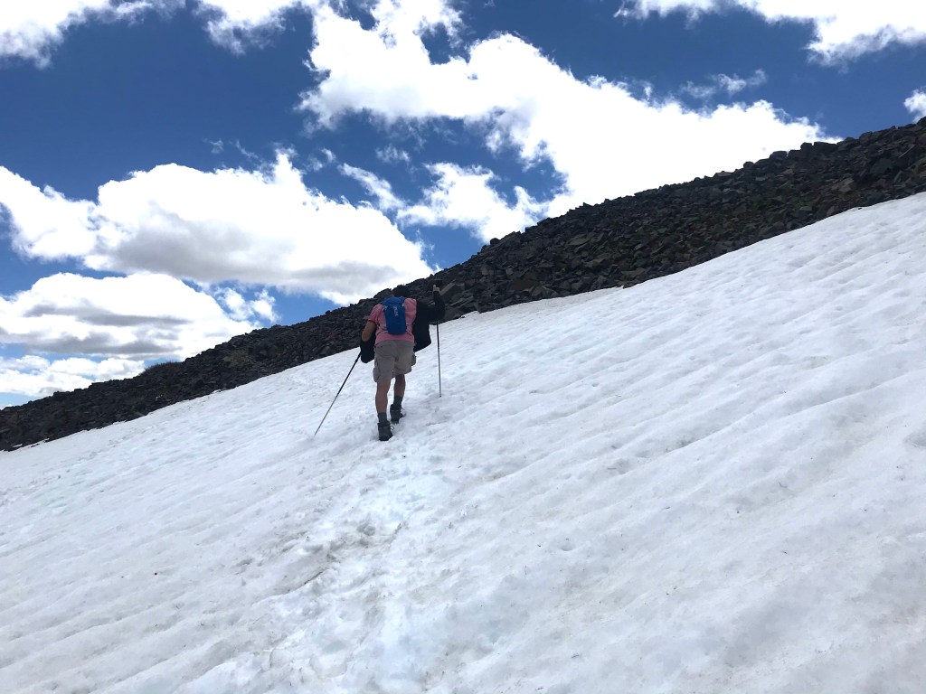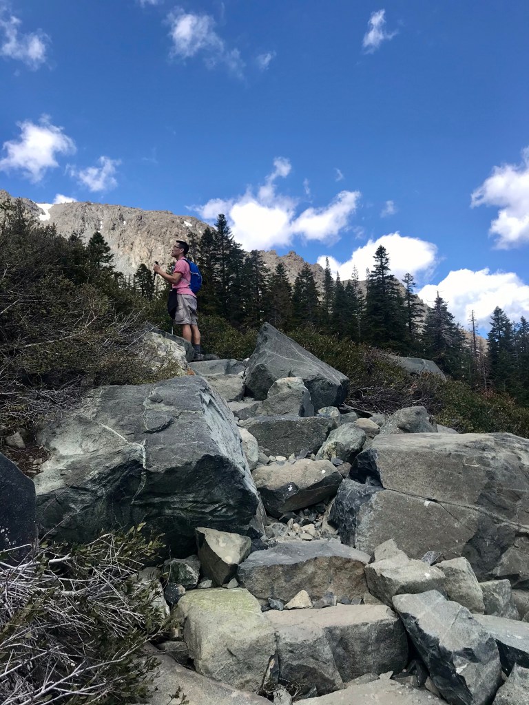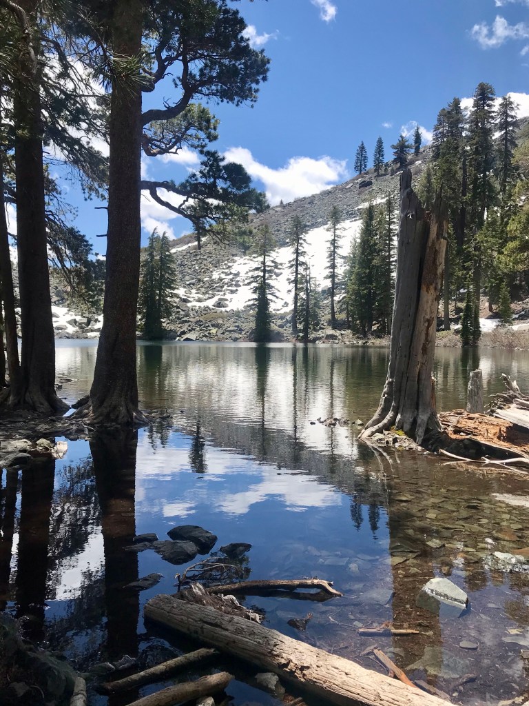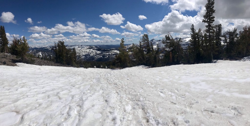 The trail started off with a gradual incline And quickly led us onto the ridge between Fallen Leaf Lake and the eastern aspect of Mt TallacView of Fallen Leaf LakeAnd Mt Tallac. We actually did not realize that this was Mt Tallac at the time, and I had joked with Joe that maybe we were supposed to hike up there. He said it was impossible as it looked to be too far away. Little did we know…Entering into Desolation Wilderness requires a permit.Second lake along the trail, Floating Island Lake.Third lake along the trail – Cathedral Lake. You leave the forested canopy once past this lake.Trail now becomes more exposed But you also start getting a view of Lake Tahoe.At an even higher vantage point, you see Lake Tahoe on the left and Fallen Leaf Lake on the right.This is about when we also started encountering bigger and bigger snow packs.Check out the size of this tree (Joe’s to the left of it)This was probably the hardest section of the hike, but also the most fun with all the rock scrambling.Looking back towards Fallen Leaf Lake See the figures hiking up the snow pack?Yep, that’s what we had to do too. Without microspikes, we dug in our hiking poles at an angle to prevent us from sliding down the side of the mountain.