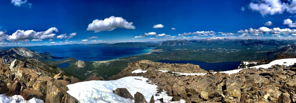 This is where Joe stopped, but I decided to venture forth, as I hate the idea of stopping when I’m so close.Forty minutes later – the top.Perseverance paid off with this stunning view of Lake Tahoe (left), Emerald Bay, Cascade Lake, and Fallen Leaf Lake (right). I was even able to trace the Rubicon trail, which we had hiked yesterday. With Joe waiting, I unfortunately couldn’t linger for too long. On the way back, I practically skied down the bigger snow packs.Two hours after leaving the top, we found ourselves once again hiking along the beautiful ridge between Fallen Leaf Lake and Mt Tallac.