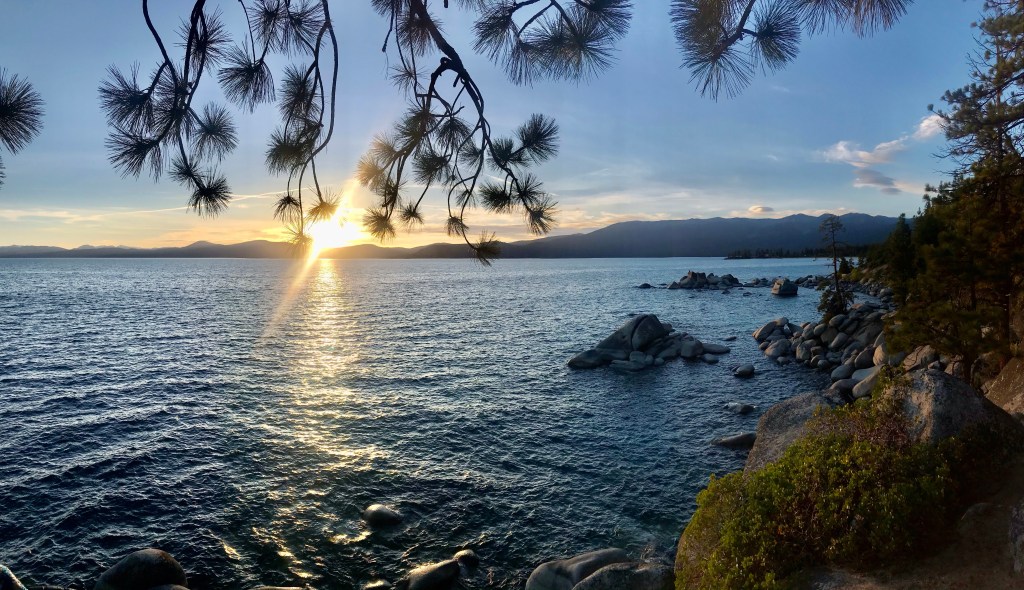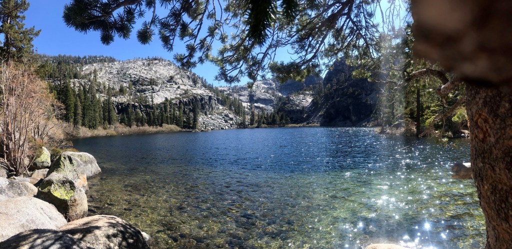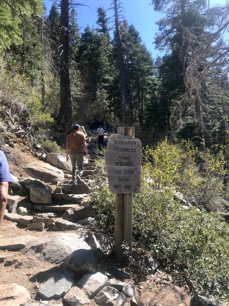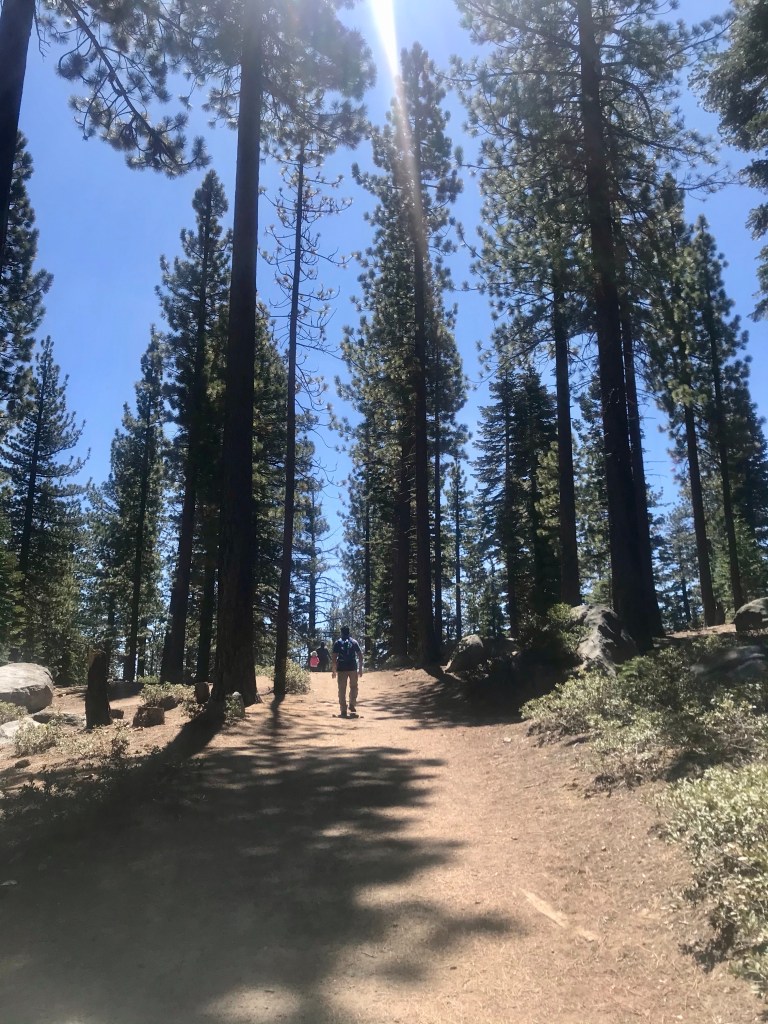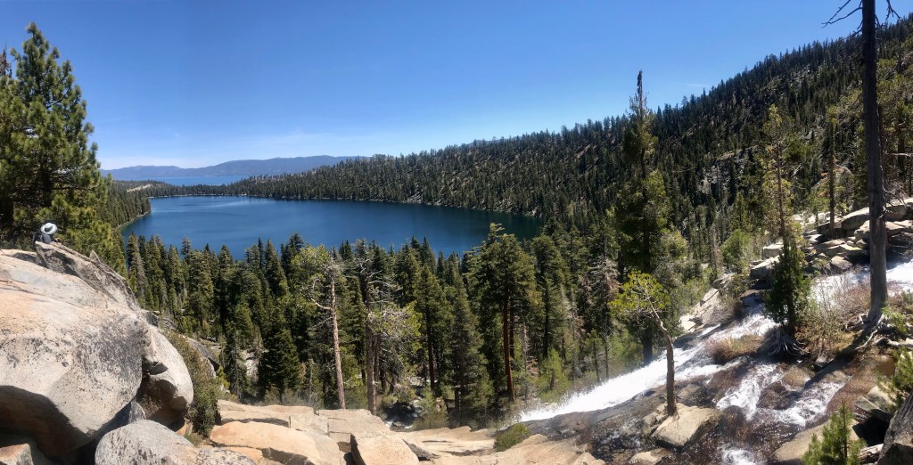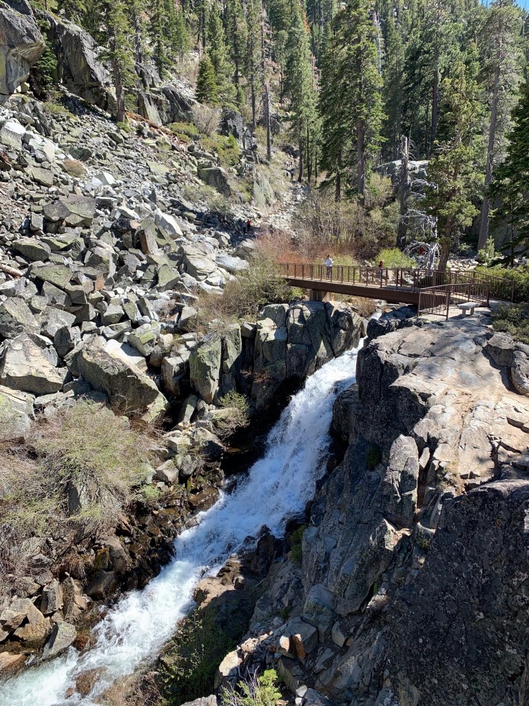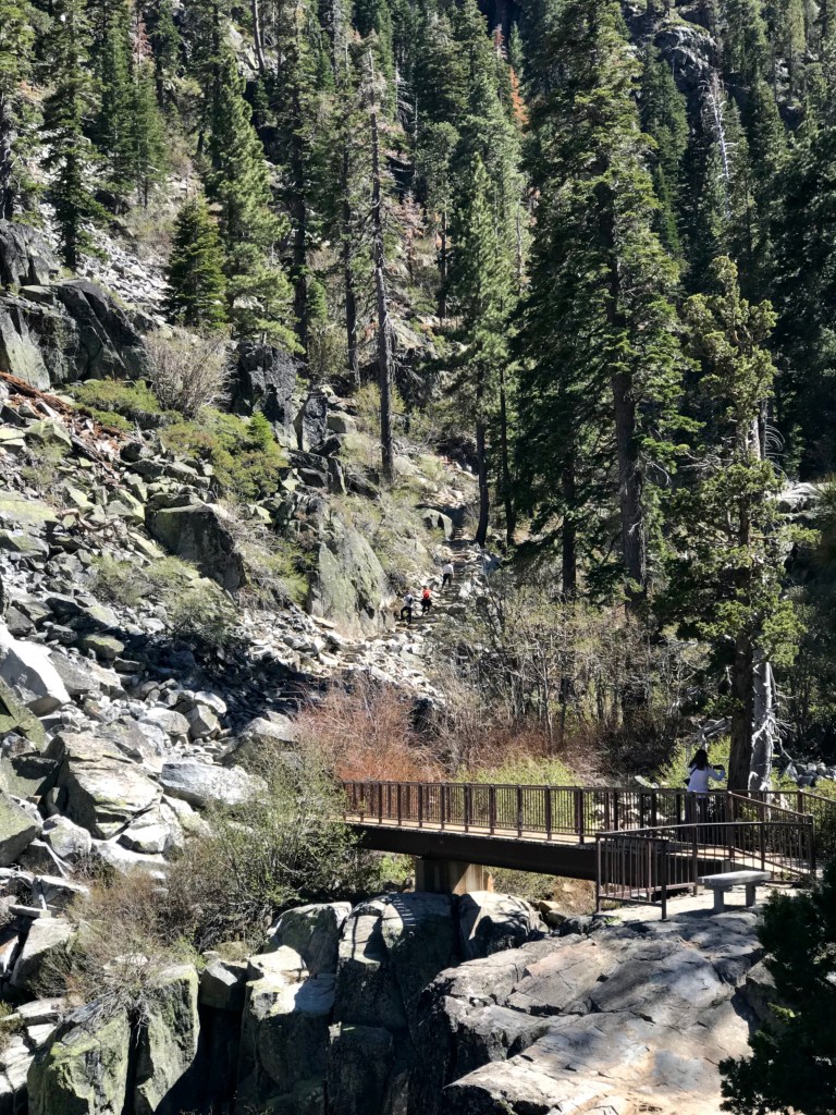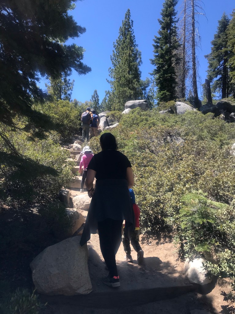The beginning of the hike looked promising with a wide and flat pathBut the trail turned rugged shortly after Perfect hiking trail for us, but the 2-year old needed a bit of assistance navigating this terrain.Both kids were troopers and made it all the way to the top without falling down the side of the path.The view at the top of the trail – from left to right, Lake Tahoe, Cascade Lake, Cascade falls View of the lakes