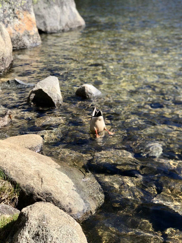 The Upper Eagle Falls The trail up to Eagle Lake is across the bridge above the upper Eagle Falls Entering the Desolation Wilderness shortly after scaling a flight of stone steps More stone steps Love the woodsy areaBeautiful granite mountain rangeWe briefly dipped our feet into the cold waters of Eagle LakeEver wonder what the undercarriage of a duck looks like?
