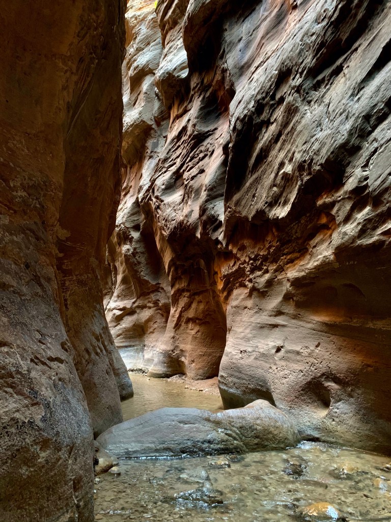 The first mile is relatively wide open, but the canyon walls start closing in the further you go. At around mile 3, you hit the Wall Street and Orderville Canyon bifurcation.