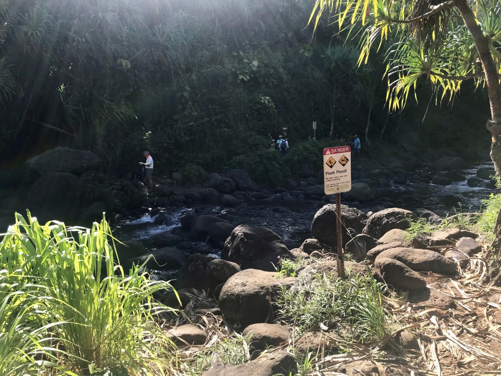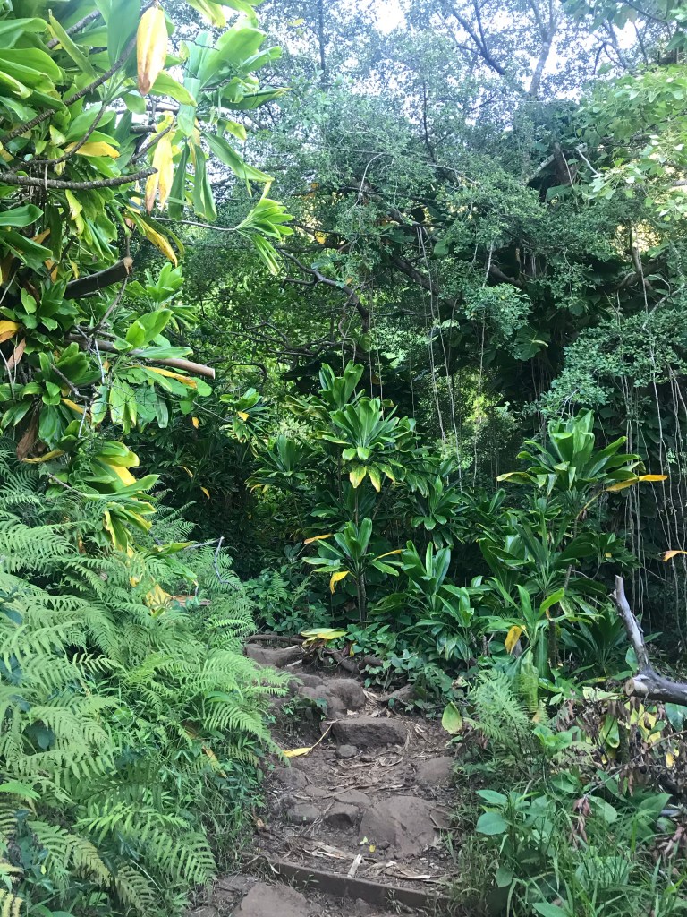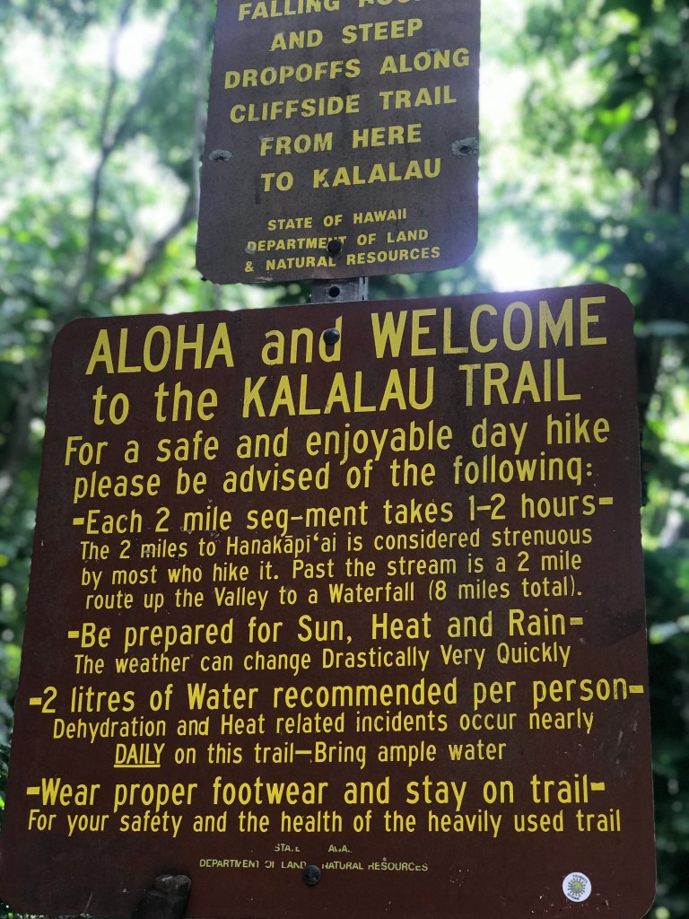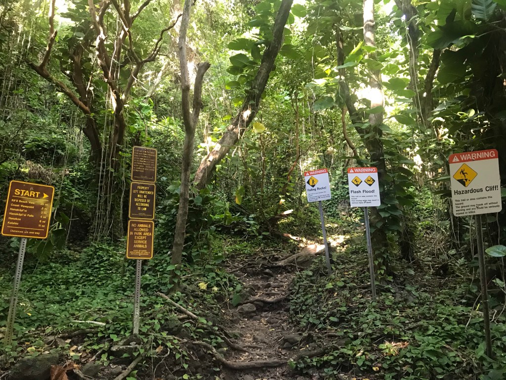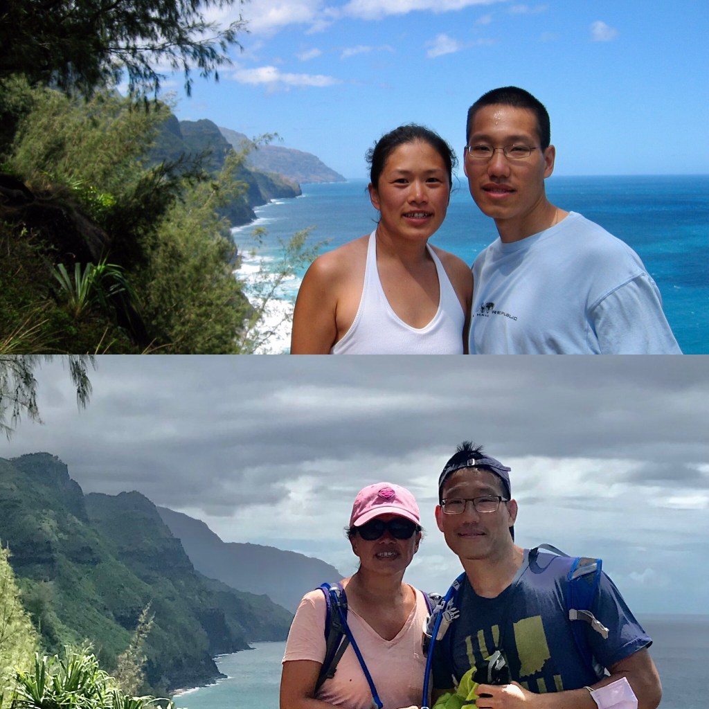 The easy short trail leading to the Ke’e beach and the start of the trail.Warning signs all over the trailhead, cautioning hikers about all the ways we can meet our demise – from falling off the cliff to getting washed away by flash flooding.To dying of dehydration The first half mile to the coast viewpoint is straight upThrough lush greenery The greenery is what I love about Hawai’i. Coastal SoCal is beautiful, but it pales in comparison to HI as most of our landscape is brown.Coast viewpoint Top picture is us at the Coast viewpoint back in 2005, and the bottom is us this time around. Oh how we’ve aged…