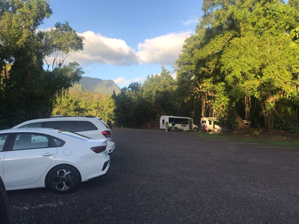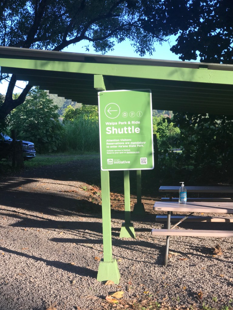 Park & Ride for our 8AM shuttle. We ended up on the earlier 7AM bus since we all had to get past the Hanalei landslide construction zone by 7:30AM, otherwise we’d be stuck on the wrong side of the landslide until 1PM.There’s no way to hike the trail without advanced planning, to which I said to Joe, “There is one trait to all the people we see on the trail today. We’re all anal.”