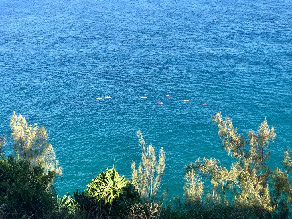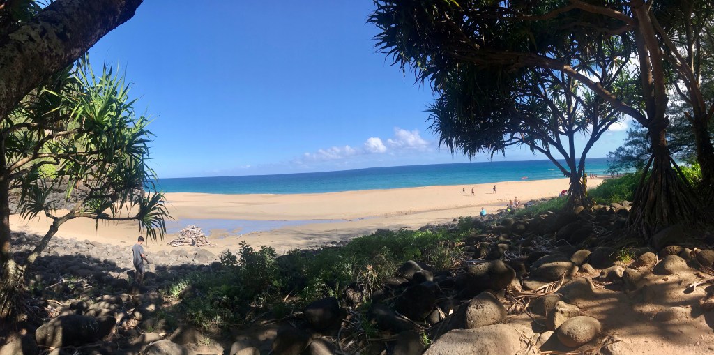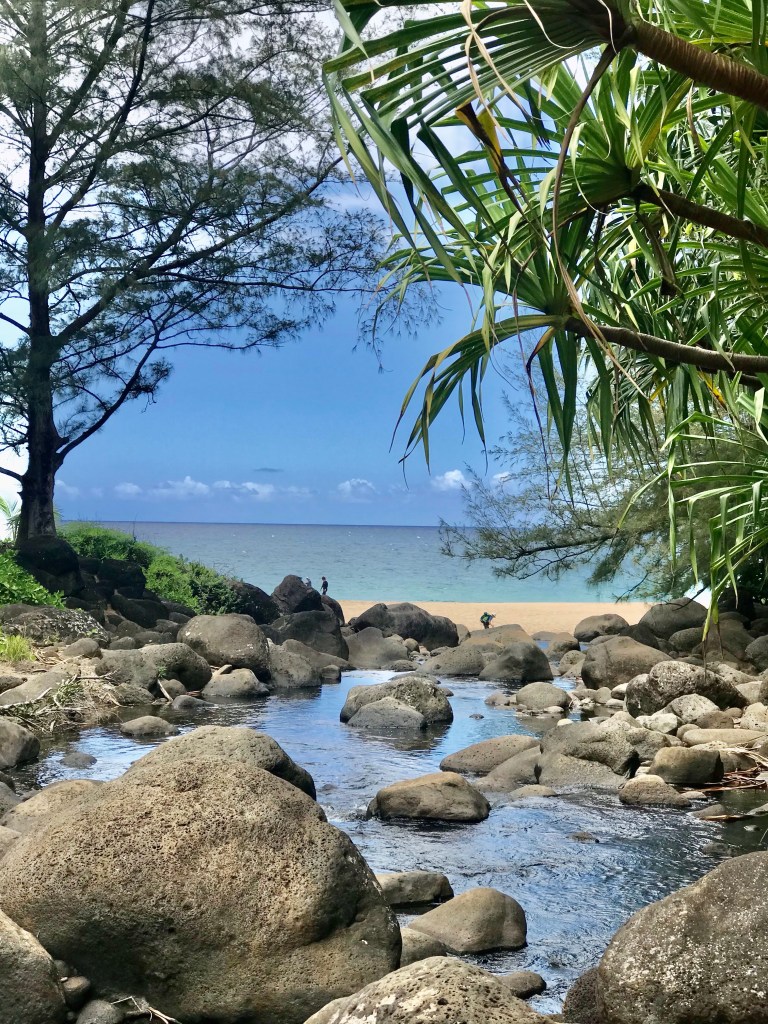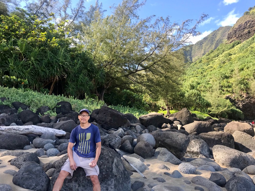 Kayakers getting a view of the beautiful coastline.A view of the Hanakapi’ai Beach, something we didn’t get to see 16 years ago.A stream crossing is required to get to the beach and the Hanakapi’ai Falls trail. Most people either tried hop scotching from rock to rock or took a longer detour to avoid getting wet. The 2 of us just went ahead and walked right in the water. Work smarter, not harder.View of the beachEating our mid morning snack on the beach.
