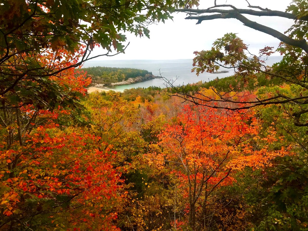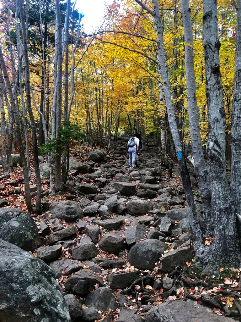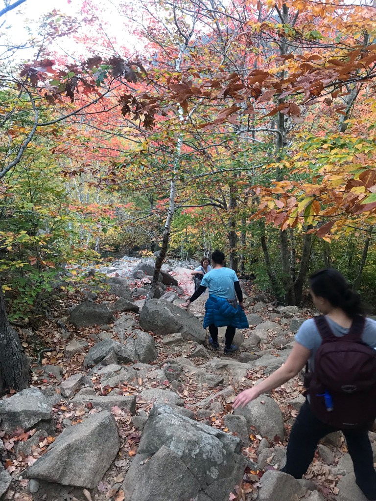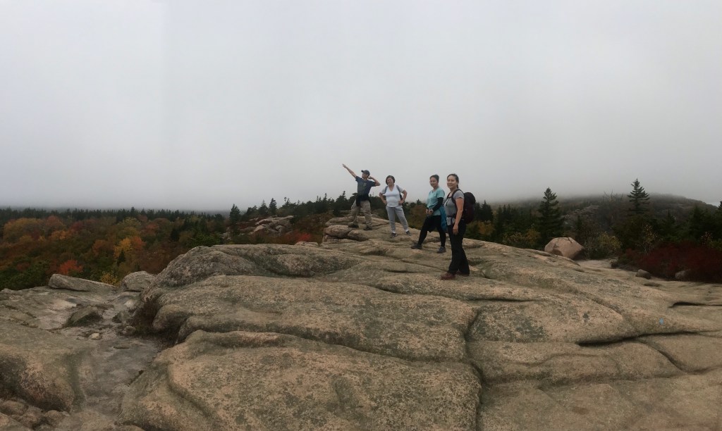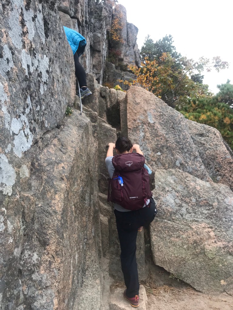 Trail starts off with the usual rocky terrain.Similar warning sign as those found on the Precipice TrailLook up and you’ll see hikers clinging onto the cliff face. That’s where we were headed, and surprisingly, it didn’t faze the two in our group who are mildly afraid of heights.Unlike the Precipice trail, this one rewards you with a stunning view shortly into the trail, and the view just gets better and better as you go up.First set of iron rungsBeautiful fall colors with Sand Beach in the distance. I can only imagine fall being the best time to hike this trail.Everyone with their backs firmly planted against the rock wall.Looking down with a view of the party behind us.Some of the rungs were a little high for those of us who are a bit height challenged.Standing at 520ft, Beehive was the lowest of all the summits we’d reached this past week.The foggy topMaking our way back down