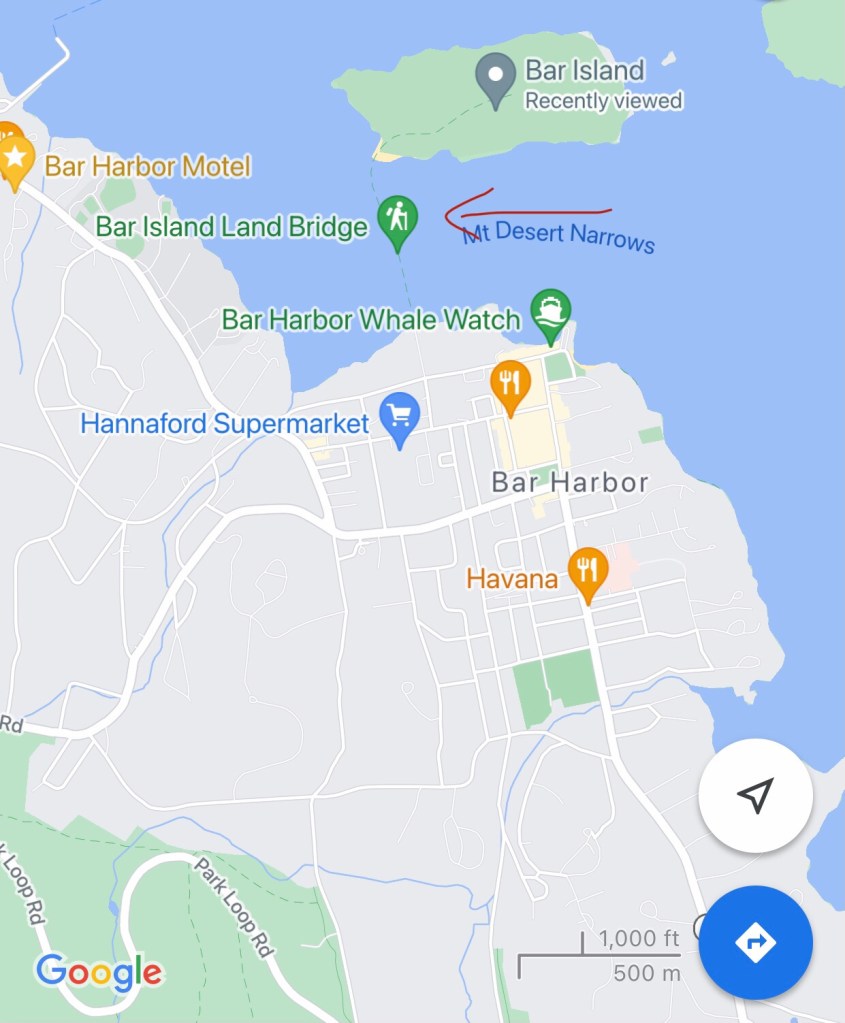 The Bar Island path connects the town of Bar Harbor to the tidal island of Bar Island.The path is passable during low tide only, and you want to avoid getting stranded on the island.A handy tidal time table helps you plan your hike.We were actually there an hour after low tide, so it was the perfect time to cross the gravel bar.Bar island has a nice gentle hiking path amongst the pine and birch trees.
