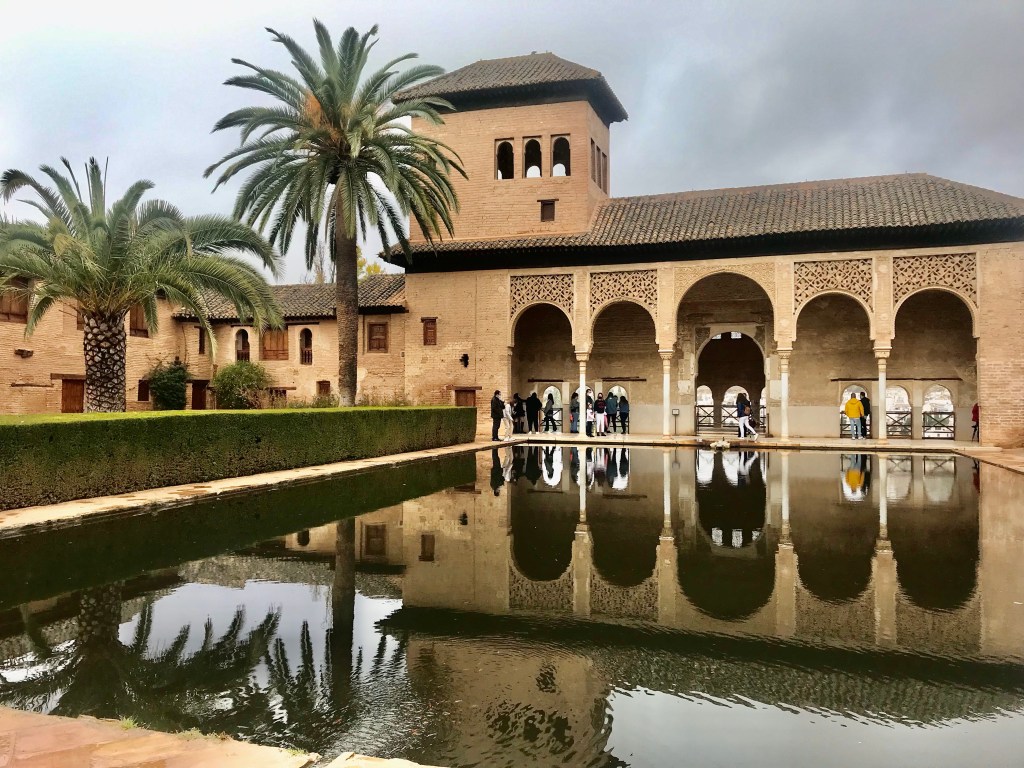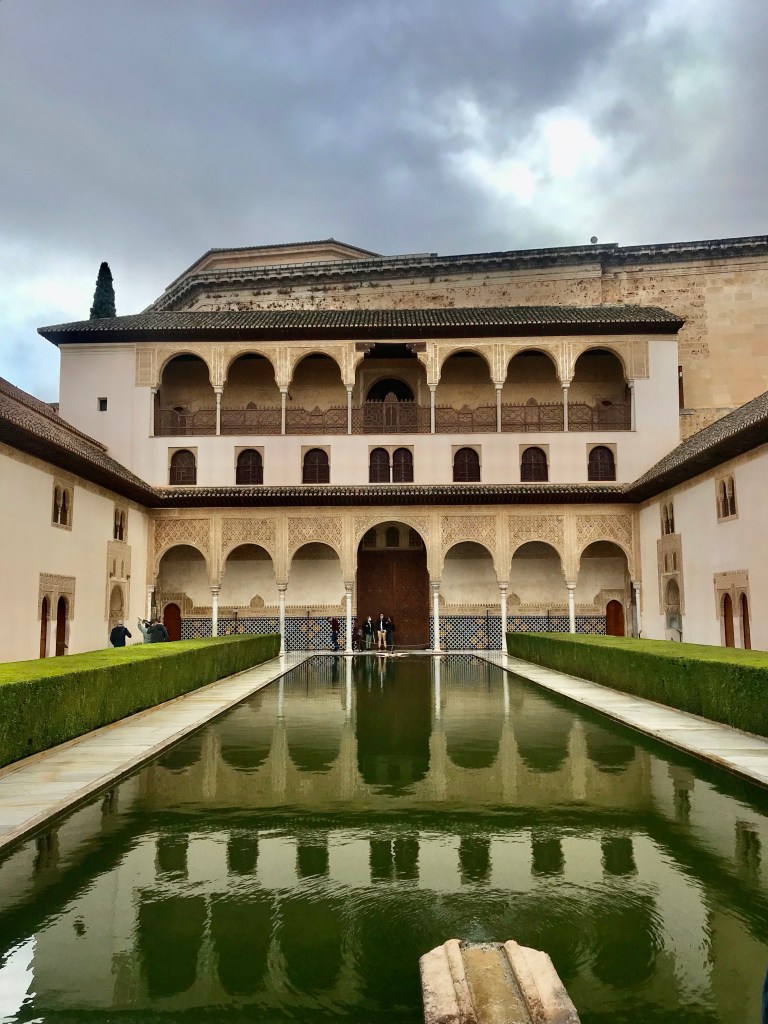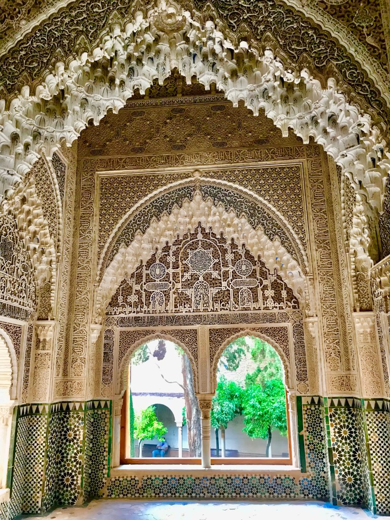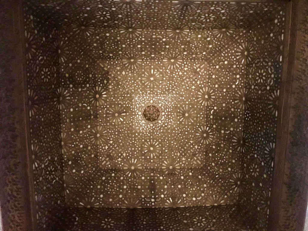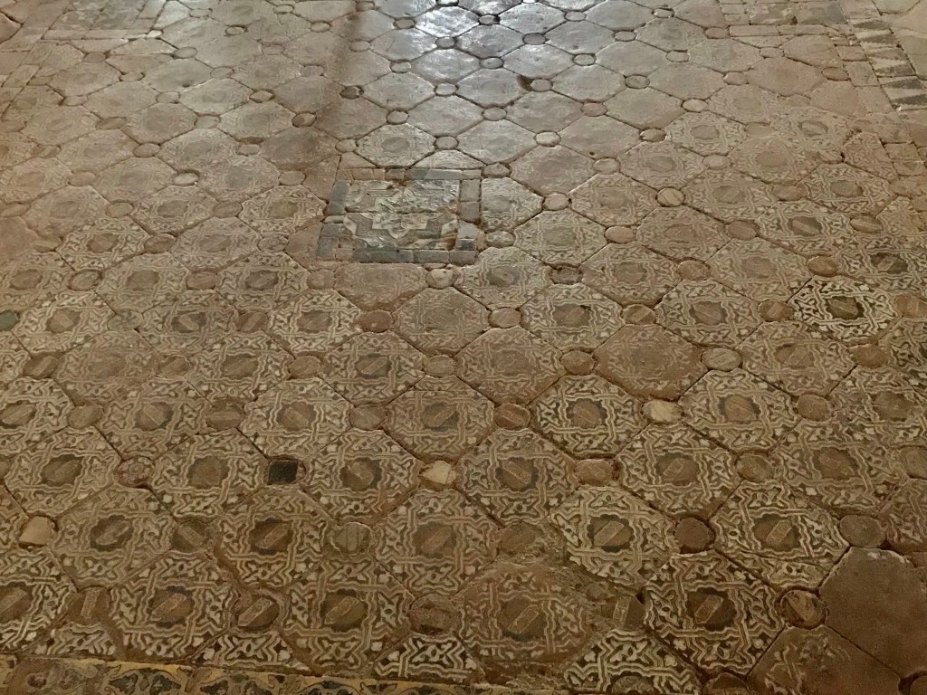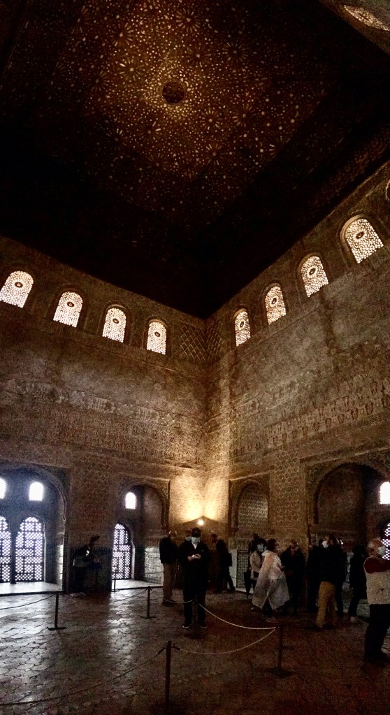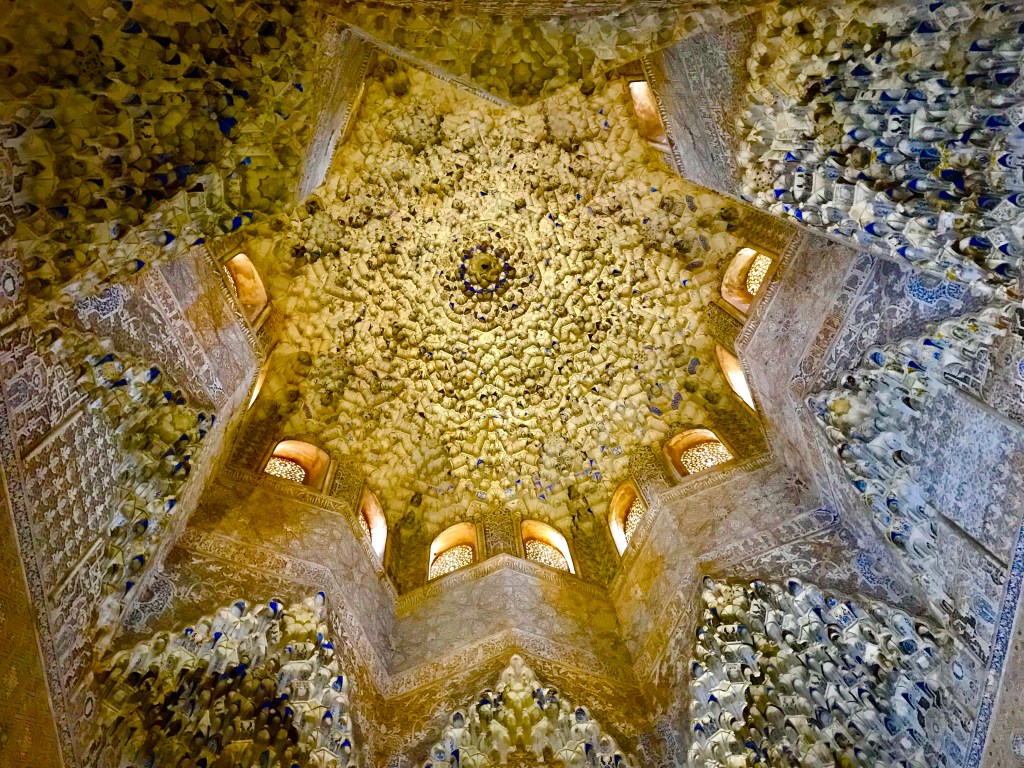 The courtyard in the MexuarOnce past the Mexuar, you enter the Court of the Myrtles. The sultan wives’ living quarters are on the upper levels flanking the fountain.On the ground floor is the imposing Ambassador’s Hall. This is where the Sultan receives guests. This is the same room where the last Nasrid sultan signed the terms of his surrender, and also where Isabella and Ferdinand heard Columbus’ final pitch for his voyage.The starry domeOriginal tiles from the 16th century in the middle of the roomThe phrase “Only Allah is victorious” in calligraphy is repeated 9,000 times throughout the palace.