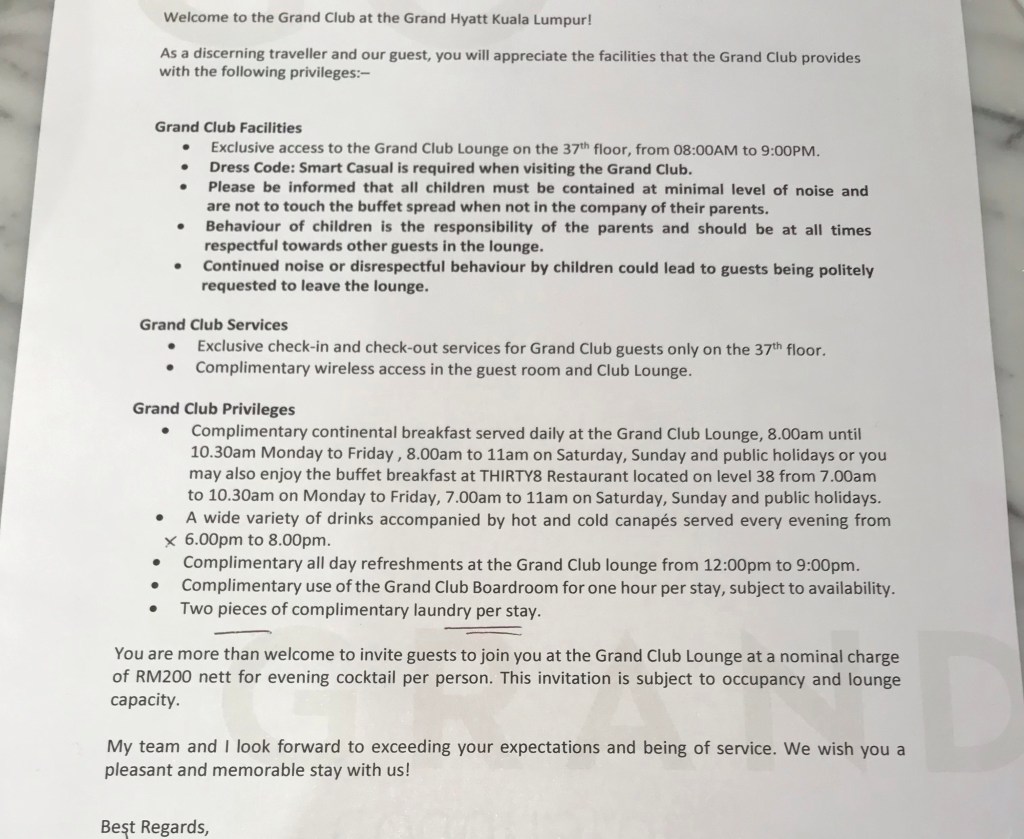 The 4 nights we spent in Kuala Lumpur were split between Mandarin Oriental and the Grand Hyatt, located right next door. The Amex FHR booking for MO provided amenities such as free breakfast, welcome gift, room upgrade, $100 dining/spa credit, and 4-pm checkout, while the Hyatt globalist status had very similar, but better, benefits. Upon arrival at the GH, we were whisked away from general check-in, and led to the Club lounge floor for private check-in. I had hoped for a suite upgrade. Unfortunately, with the long weekend there were no suites available. However, we did get an upgrade to a tower view room, similar to what we had gotten at MO.