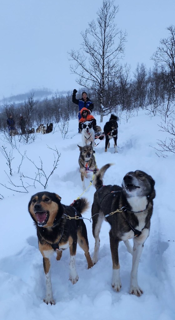 All guests had an option to do one of 3 activities after breakfast – dog sledding, reindeer sledding, and snow mobiling. Since we had already done the reindeer sledding at the Sami tent, I had signed us up for dog sledding prior to the trip. The last time Joe and I went dog sledding in Alaska, we were both seated with the guide as the musher, so I figured it would be an easy activity for my slightly athletically disinclined friends.