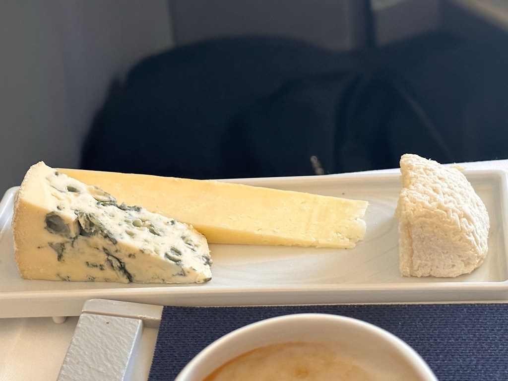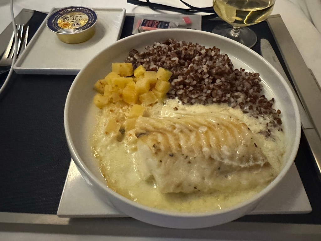 Shrimp and mangoBeet mousse.Scallop mousseline and smoked salmonShrimp tartare, pea cream with lemon and gingerI really liked the shrimp tartare appetizer Cod, red rice, beurre blanc sauce and turnipBeef cheeks with mushroom and figs, and butternut squash.Presentation could be better.Crottin de Chavignol, Fourme d’Ambert, and Cantal cheesesWhat Air France does well is its cheesesCoffee ice cream And desserts