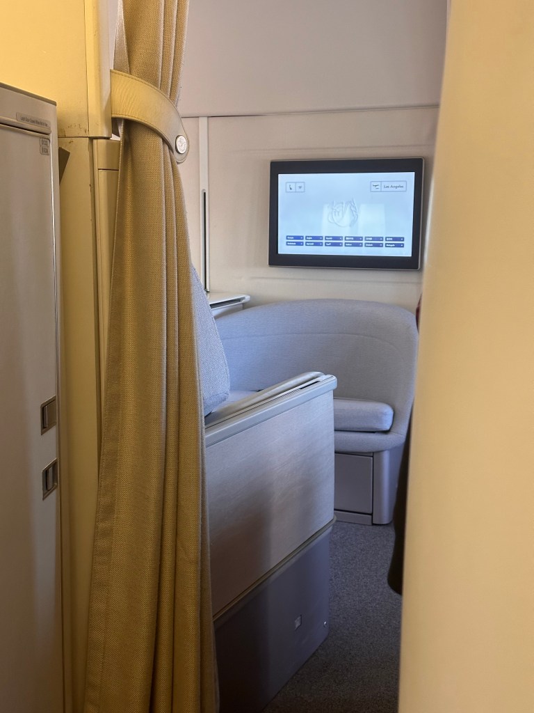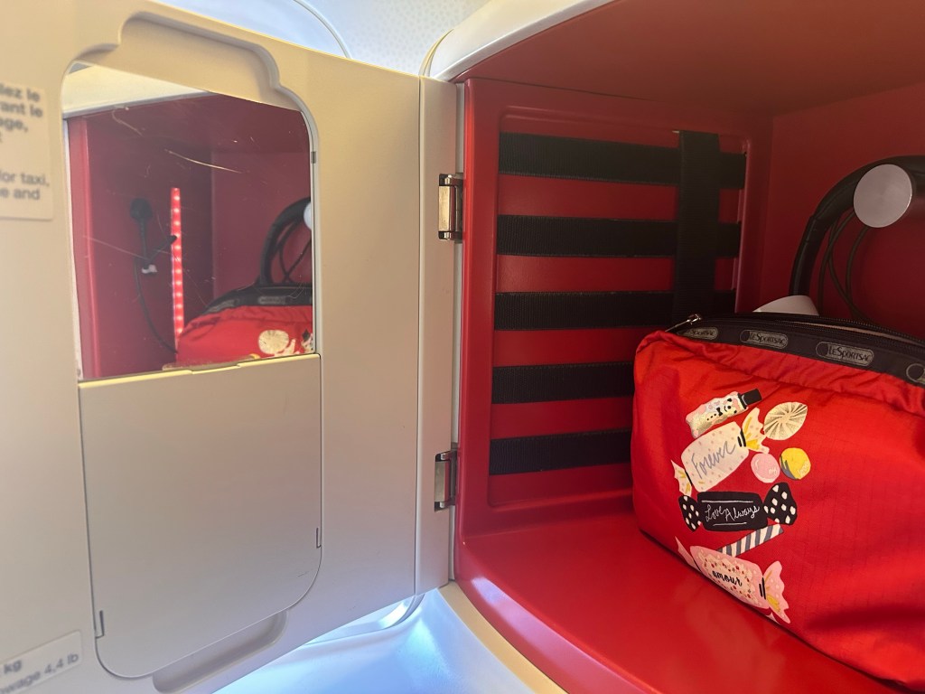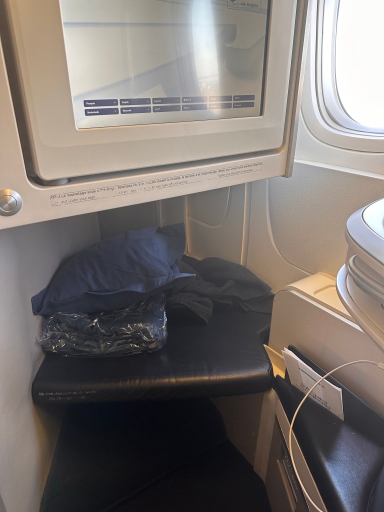 The seating arrangement is similar to EVA’s reverse herringbone.However, the footwell is much more spacious on Air France.And there’s more storage space for all your stuff. The mirror is a nice touch. EVA’s biggest downside is the lack of extra space around the seat.Another nice touch is the heart shaped chocolate for a flight departing on Valentines Day.A peek at the first class La Premiere cabin. With only 4 seats in first class, there’s enough room for each seat to be converted into a twin bed.A very classy looking amenity kit, but with a bare amount of Clarins product.