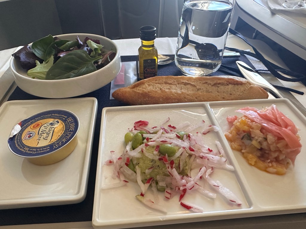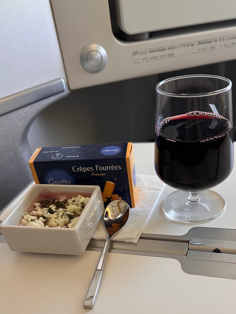 What I was most excited about the flight was the food. AirFrance works with internationally renowned chefs to provide their award-winning dining experience. Perhaps my expectations were too high, because I was a little let down. The food was good, but I thought it was on par with EVA’s. The meal on the flight leaving Paris definitely tasted much better than the one leaving LA.