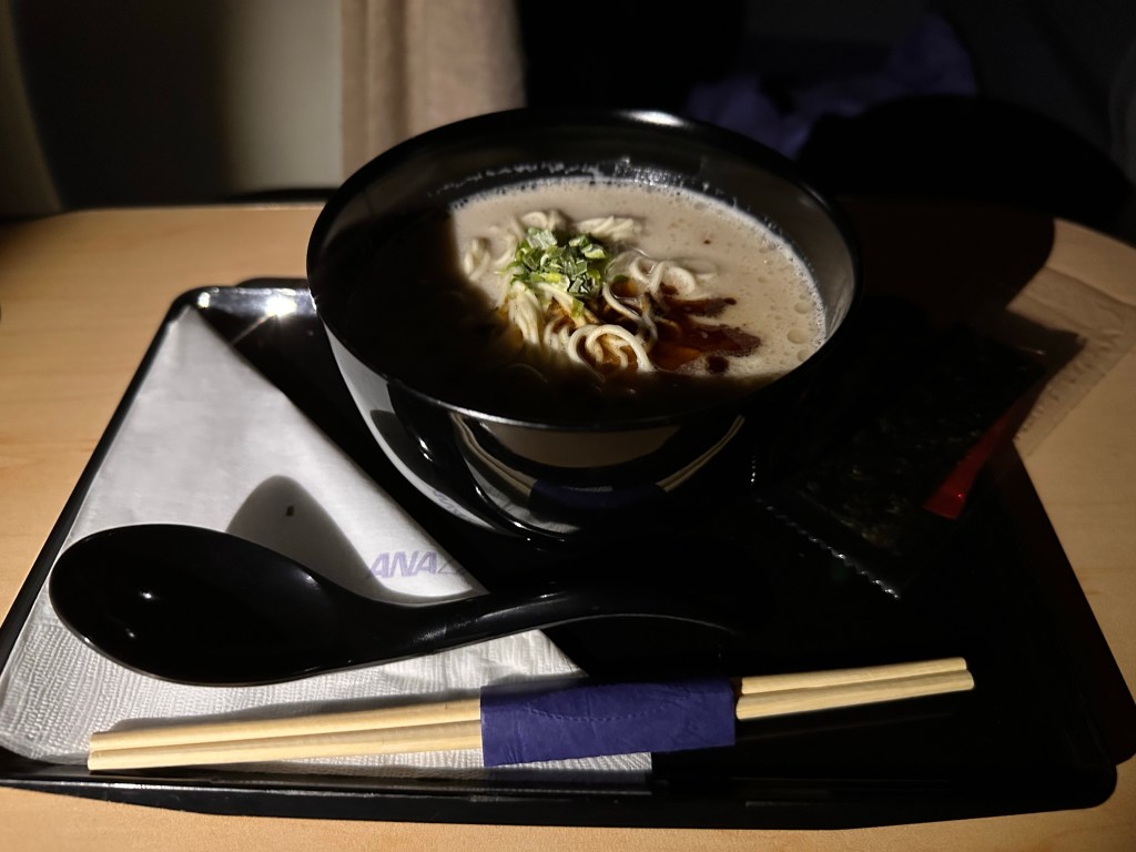 A large table provides ample space to put all your belongings.ANA has the widest seats and footwells. Unfortunately, the seats aren’t the most comfortable. That prize goes to EVA.With the staggered configuration, window seats A and K have the most privacy in the business class cabin.Who has bidets in their lavatories? ANA! That by itself helped ANA edge EVA out of first place.ANA’s amenity kit isn’t the best, and it only supplied PJs for rent. EVA won in this category by having the most complete set of goodies including the comfortable Jason Wu PJs that I actually wear to bed at home (Qatar’s PJs are scratchy and have been relegated to be used while gardening). Air France is the worst as it doesn’t even provide slippers.IPPUDO ramen was a bit disappointing.The food was average but seasoned perfectly, unlike Qatar’s overly salted dishes. EVA had the best food and presentation – all courses were served individually without being presented on a tray.