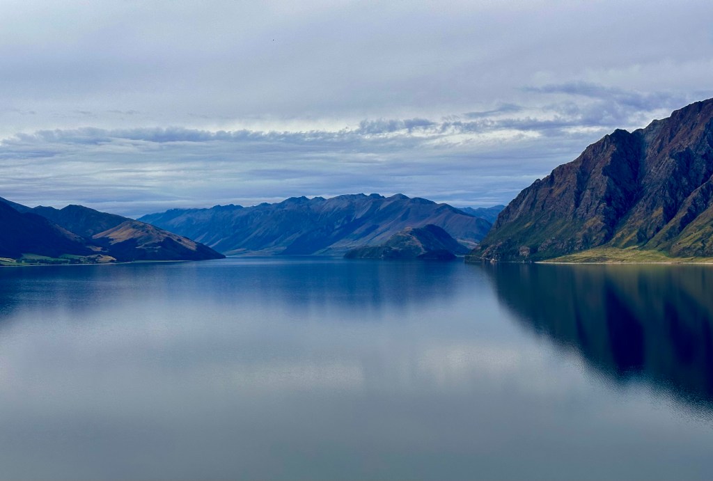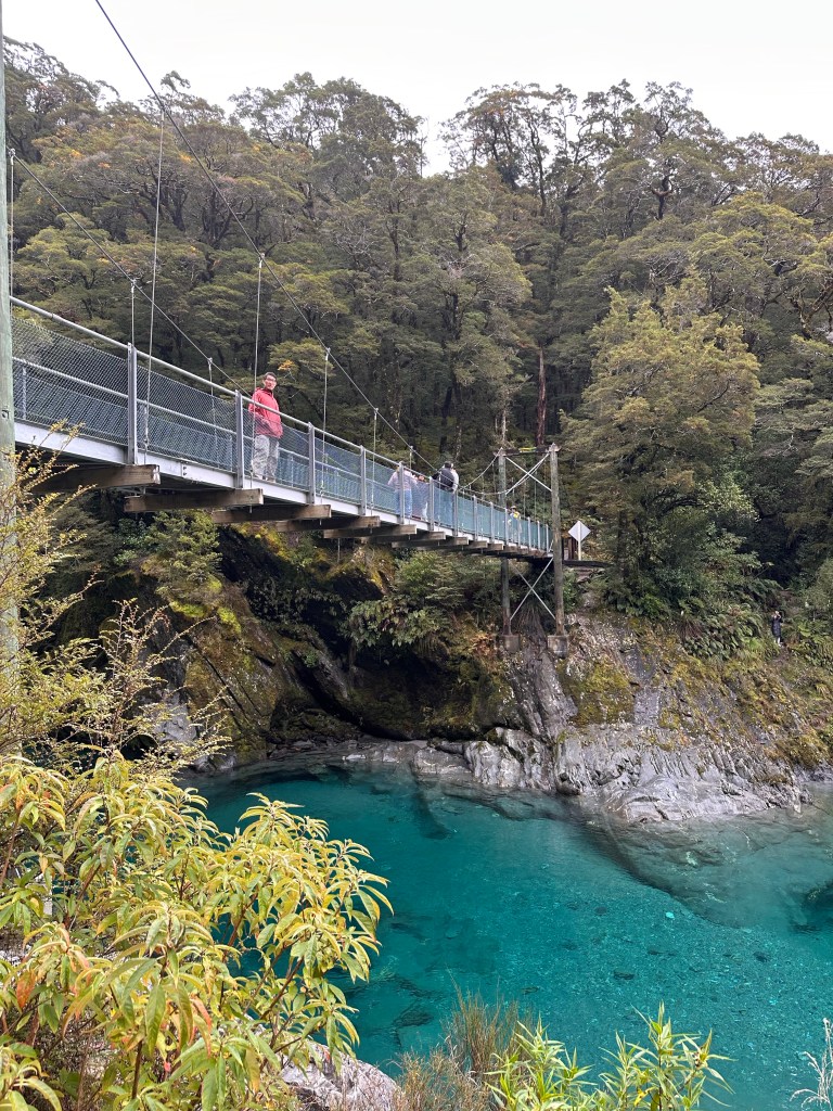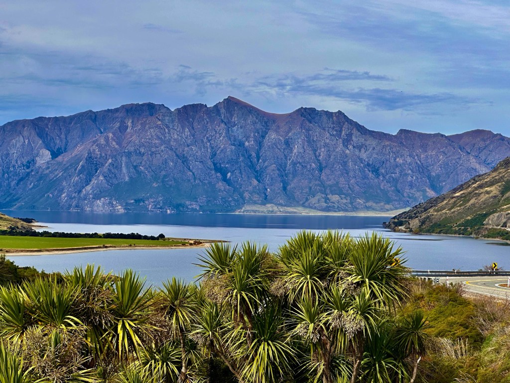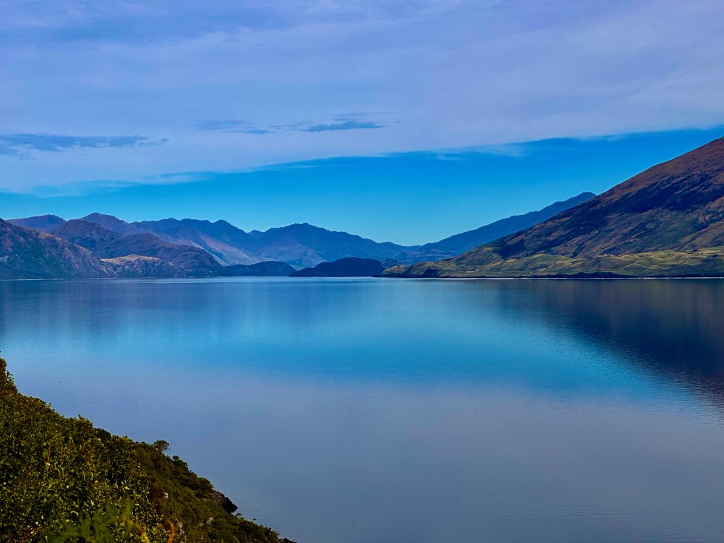 Suspension bridge above the Makarora river.Unbelievably clear and blue waters, caused by scattered light from the rock flour particulates (rocks repeatedly crushed by glaciers) suspended in water. This is why all glacier fed lakes are a bright blue/green color.Colorful mushrooms along the Blue Pools trail. Cortinarius violaceous (left), Orange peel mushroom (right), named because it looks like discarded orange peels on the ground.Lake Wānaka The road to Queenstown passes between two lakes – Lake Wānaka and Lake Hawea. The “Neck”, is the narrowest distance between the two lakes, and offers you a view of both.Lake HaweaAs we drove from the West Coast to Queenstown, it felt like we had traveled from Alaska to Hawaii, Wyoming, and now through Colorado.