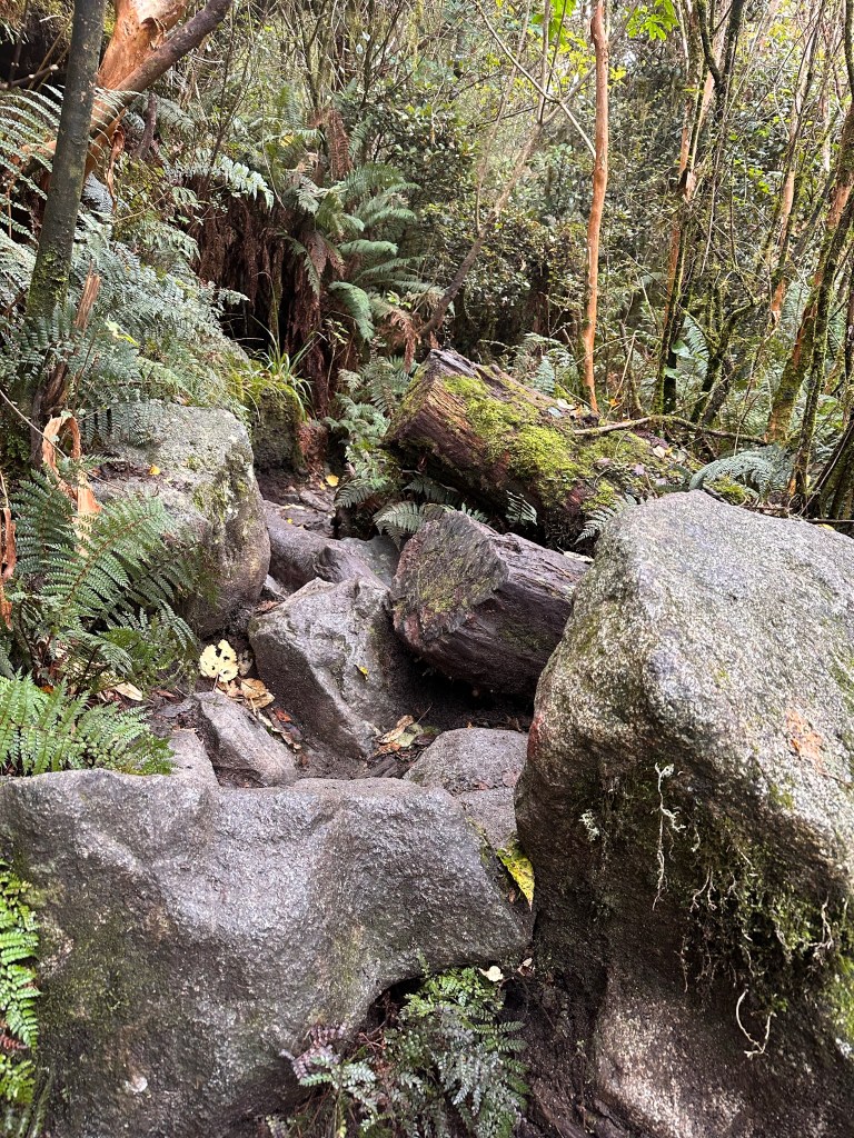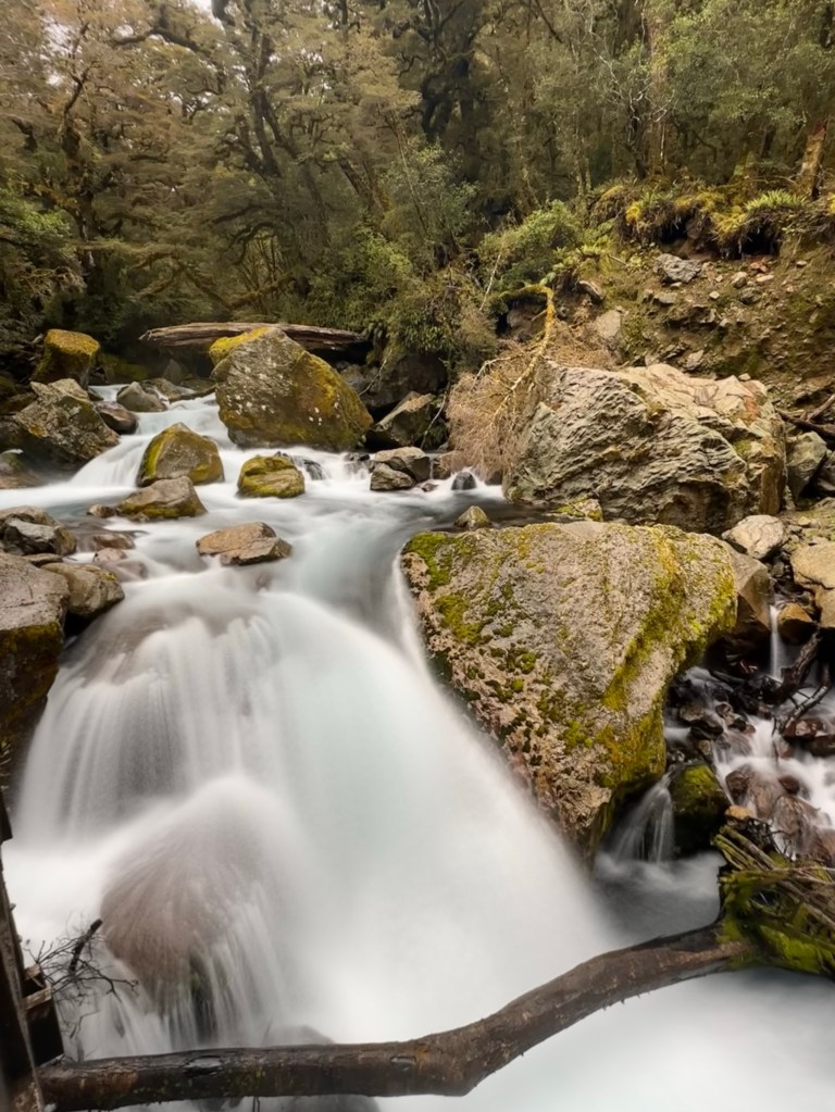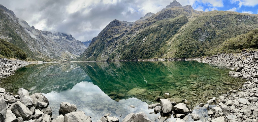 Again no distance information, but we estimated 4 miles round trip.Swing bridge across the Marian creek.Marian creekEasy paved path leading up to the viewing platform a half mile in.This is where you’ll find most people milling about.A series of small, but loud and powerful water cascades.Past the second viewing platform is when the real hike begins.There are some straightforward sectionsBut the majority of the trail is more or less technical, with an elevation gain of 1,400 ft over 1.5 miles through the hanging valley.Long legs are a plus, but I make do with what I’ve got.We made it above the tree line and to the lake in under an hour and a half.Lake Marian is an alpine lake surrounded by Mt. Christina, Mt. Crosscut, and Mt. Lyttle that make up the Darran Mountains.The lake is fed from a cirque atop the Mt. Crosscut peak.