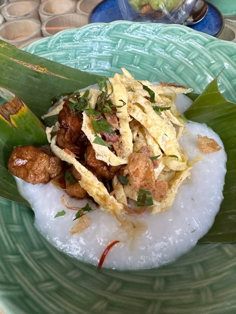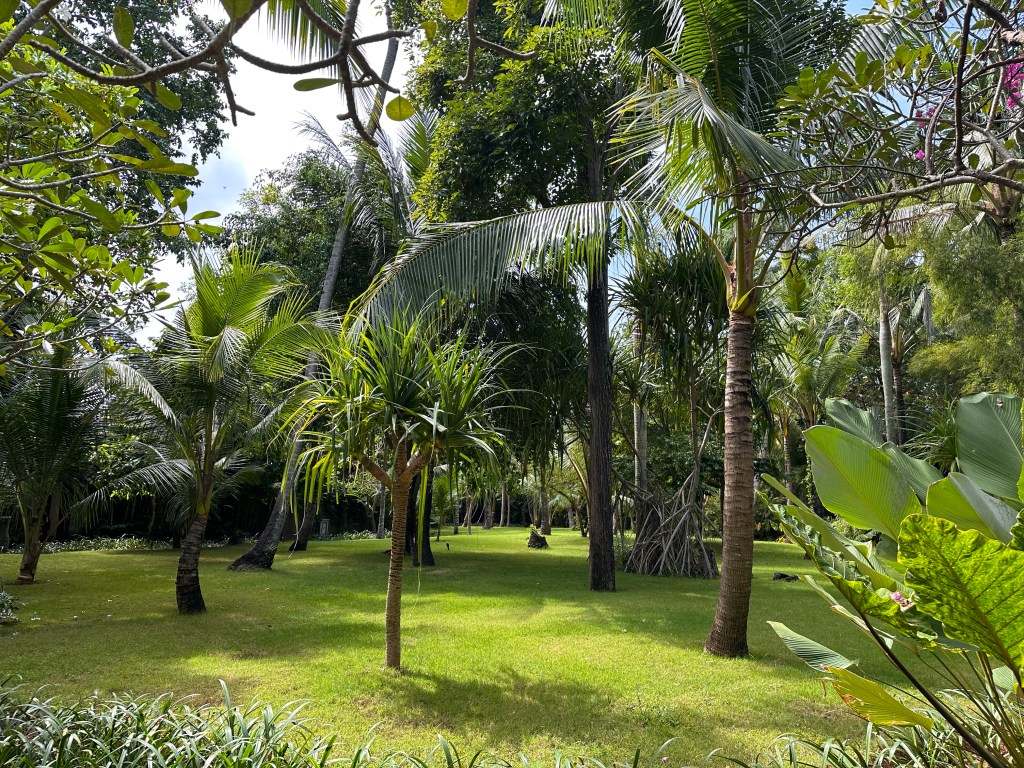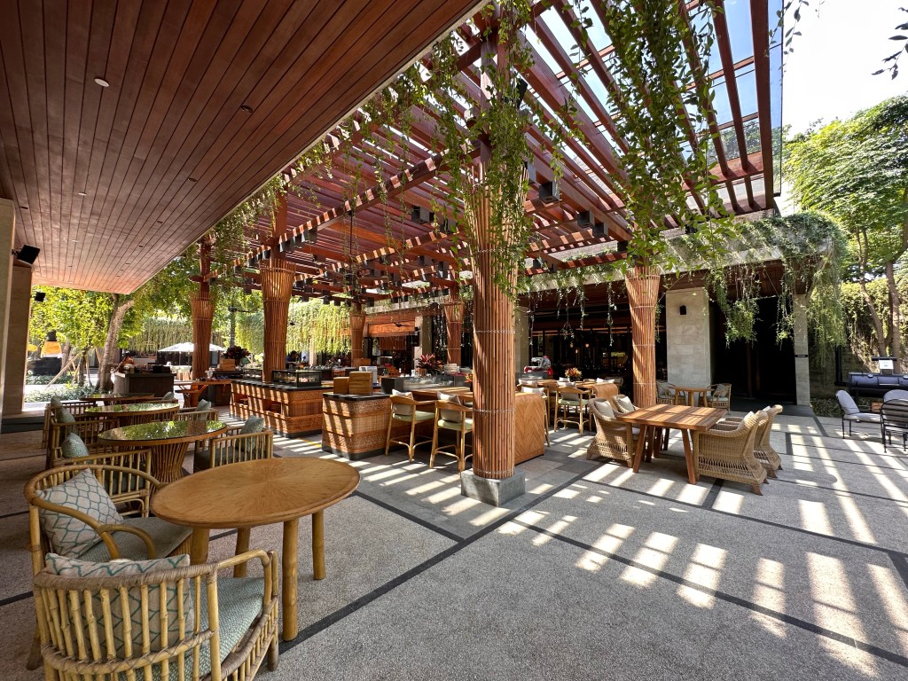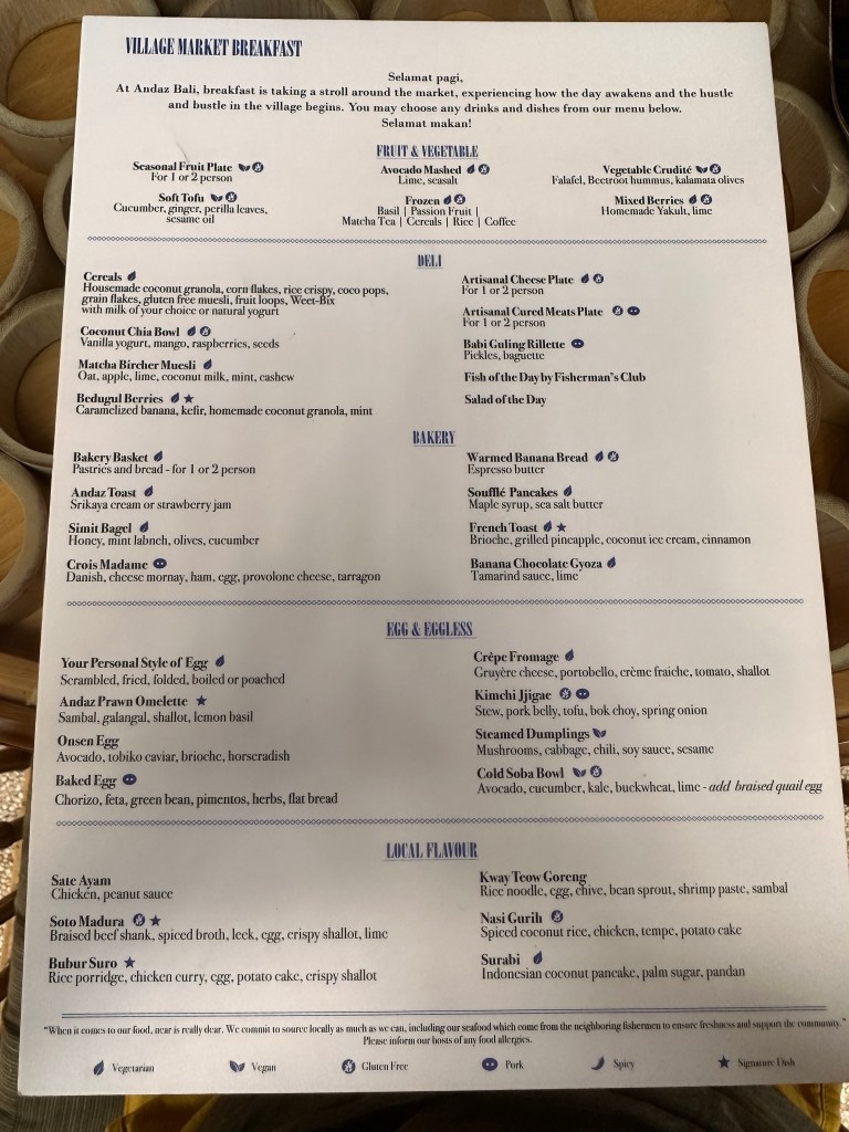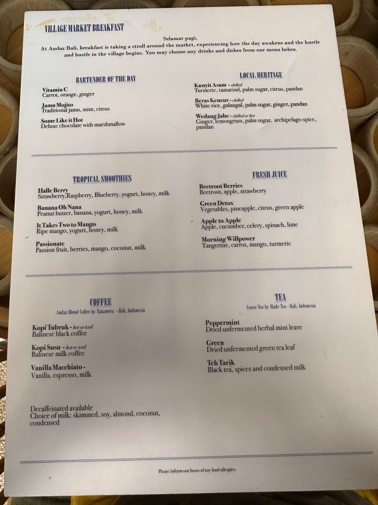 The village square is where all the activities, including breakfast, take place. Breakfast is served a la carte, and is hands down the best hotel breakfast we’ve had on this trip so far. You can order as much or as little as you want. Definitely a much more civilized approach compared to the breakfast buffet setup at the other hotels.Breakfast menuBubur SuroOnsen eggBedugul berriesSteamed dumplings Croissant madameSoufflé pancake Just a few items we remembered to take pictures of.One of the restaurant venues Andaz’s grounds are more appealing than that of HR’s.Feels like HawaiiTwelve one-bedroom villas surround this pond, tucked away from the rest of the grounds. There are also 4 two-bedroom beachfront villas, for a total of 149 rooms on this relatively small boutique property.Beautiful silver colored koi in the pondSome of the flowers you’ll see around the property.