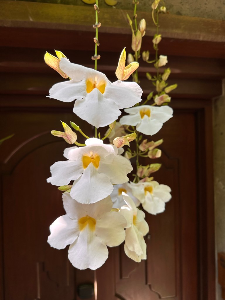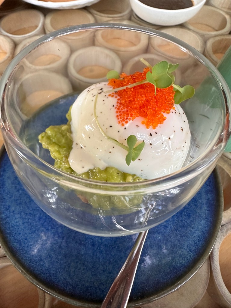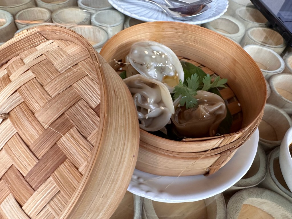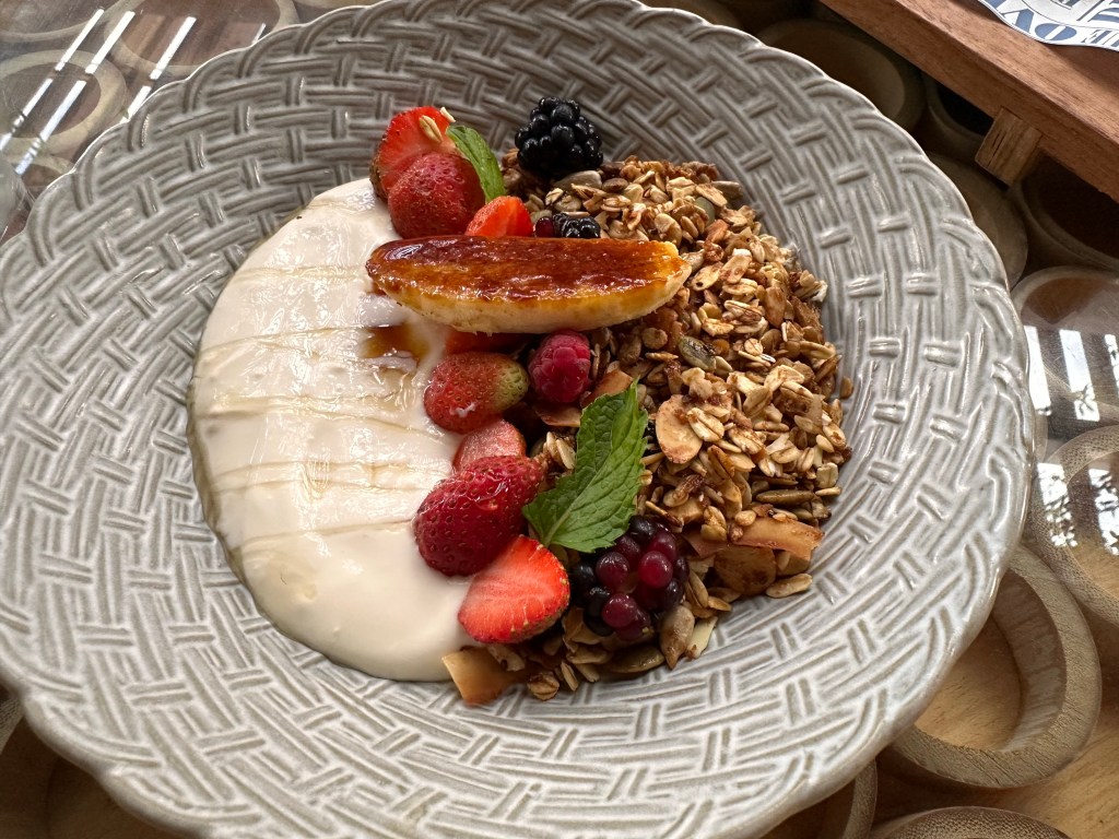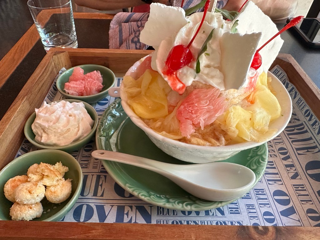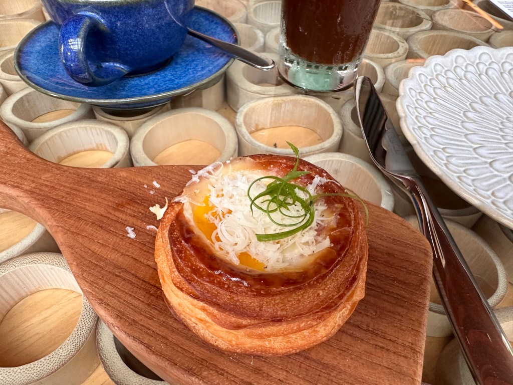 The village square is where all the activities, including breakfast, take place. Breakfast is served a la carte, and is hands down the best hotel breakfast we’ve had on this trip so far. You can order as much or as little as you want. Definitely a much more civilized approach compared to the breakfast buffet setup at the other hotels.Breakfast menuBubur SuroOnsen eggBedugul berriesSteamed dumplings Croissant madameSoufflé pancake Just a few items we remembered to take pictures of.One of the restaurant venues Andaz’s grounds are more appealing than that of HR’s.Feels like HawaiiTwelve one-bedroom villas surround this pond, tucked away from the rest of the grounds. There are also 4 two-bedroom beachfront villas, for a total of 149 rooms on this relatively small boutique property.Beautiful silver colored koi in the pondSome of the flowers you’ll see around the property.