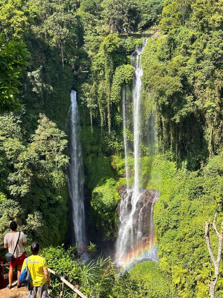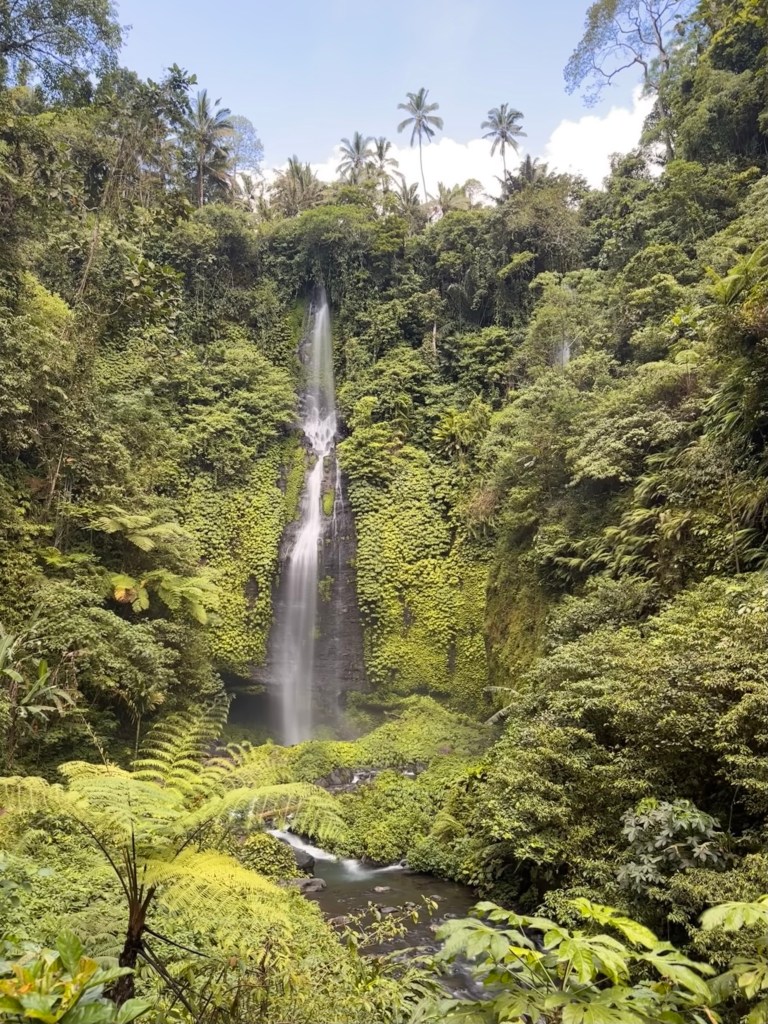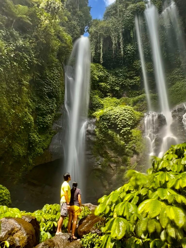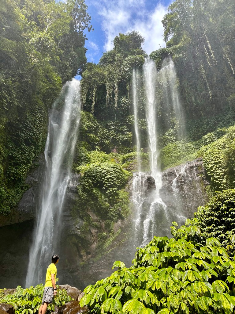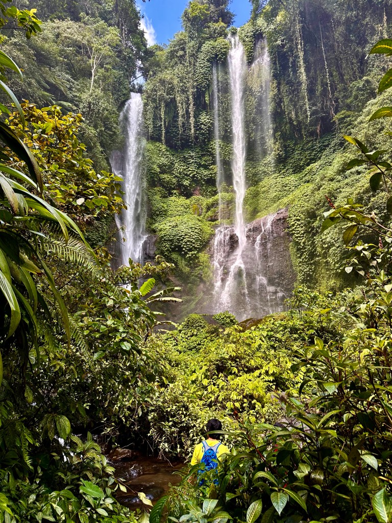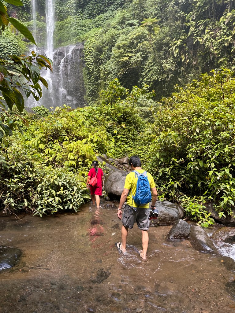 The first 10 minutes is on a paved local road to the second ticket booth. Those with scooters can ride all the way to this point and shave time off walking in the hot sun.Rice terraces alongside the road The path narrows past the second booth.Outside the cities and towns, Bali is stunningly green and lush.Another 10 minutes gets you to the first viewing platform of Sekumpul. From here on out, it’s all steps down to the bottom.View of Sekumpul from a lower vantage point.A preview of what to expect on the way back 🥵 Rudimentary signpostsThis stream crossing meant shedding our sneakers and hiking in our flip flops for the rest of the way.Hidden falls so named because it can’t be seen from above.Cascading down 230 ft. For those who don’t mind getting wet, this is a good spot for a swim to cool down.Looking back towards the trail. So lush!Then it was onwards to Sekumpul.Can’t fault me for imagining that a dinosaur could just be around the corner.Stream crossings helped cool us down just a tad.Have I mentioned “lush”?We humans are so insignificant.A rare photo of the two of us Having a guide ultimately proved useful. We would have had a hard time finding Fiji Waterfall from where we were.Ticket booth for Fiji waterfall More stream crossingsA glimpse of Fiji waterfallAs we got closer, we were pleasantly surprised to see that there were in fact four separate falls.Definitely worth the extra hike and time in the sun.Back up top – we realized that while we were busy heading down earlier, we had completely missed this view – Sekumpul on the left and Fiji tucked all the way in the (center) back.If there is such a thing as heaven on earth, this would be it.