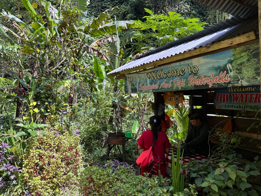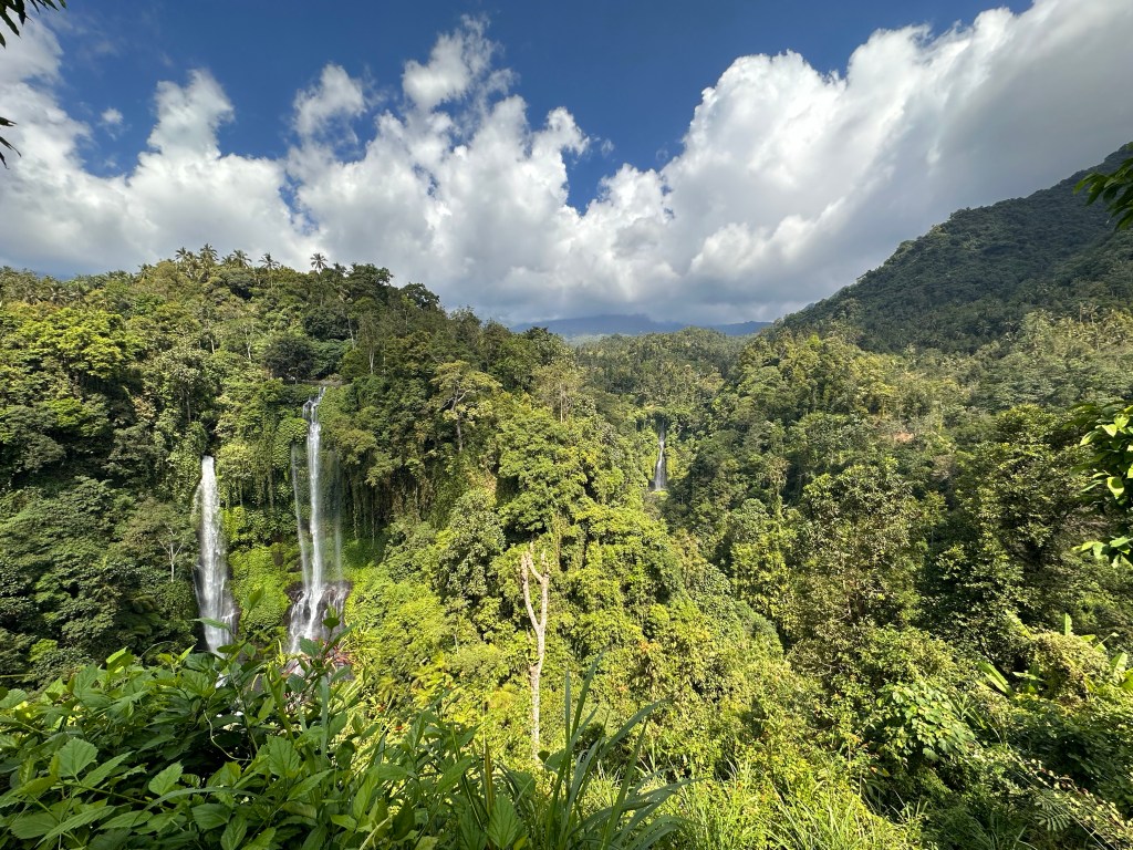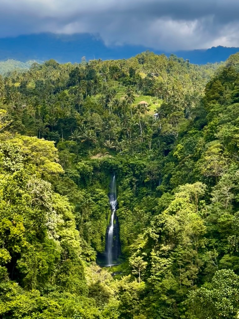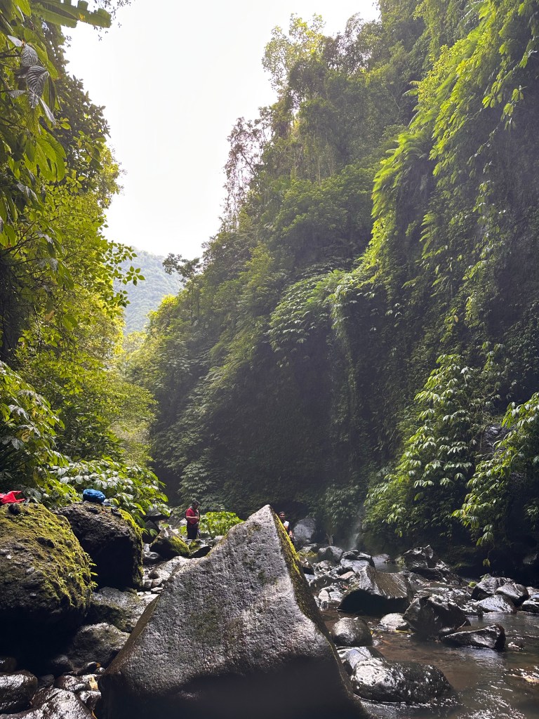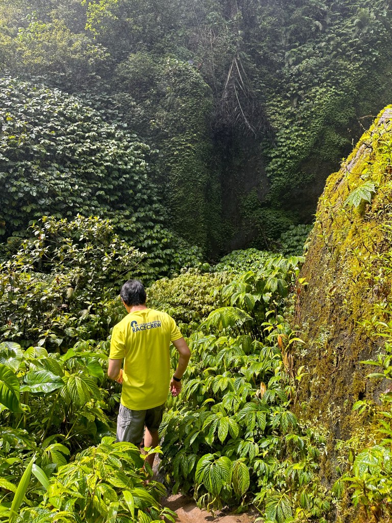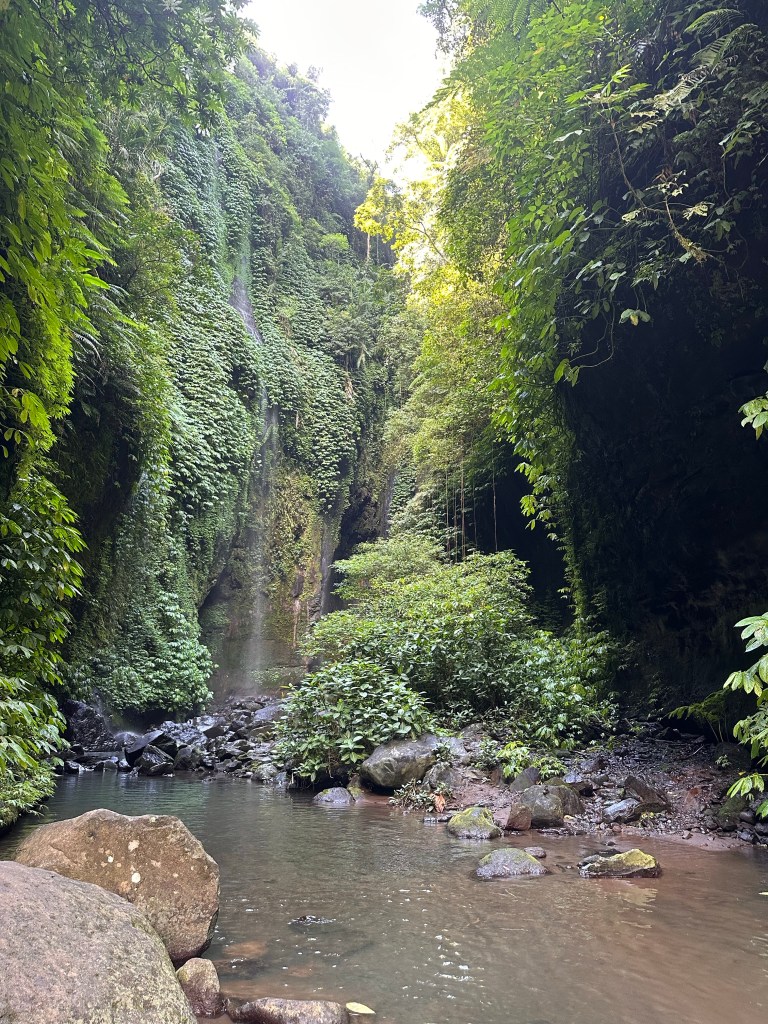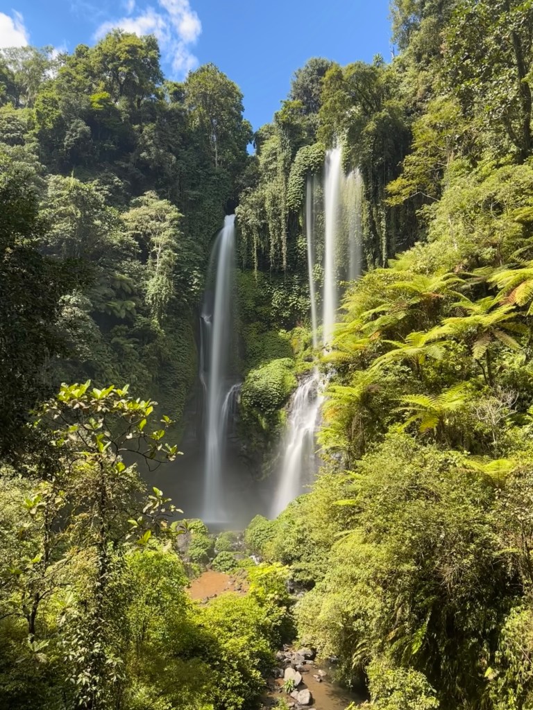 The first 10 minutes is on a paved local road to the second ticket booth. Those with scooters can ride all the way to this point and shave time off walking in the hot sun.Rice terraces alongside the road The path narrows past the second booth.Outside the cities and towns, Bali is stunningly green and lush.Another 10 minutes gets you to the first viewing platform of Sekumpul. From here on out, it’s all steps down to the bottom.View of Sekumpul from a lower vantage point.A preview of what to expect on the way back 🥵 Rudimentary signpostsThis stream crossing meant shedding our sneakers and hiking in our flip flops for the rest of the way.Hidden falls so named because it can’t be seen from above.Cascading down 230 ft. For those who don’t mind getting wet, this is a good spot for a swim to cool down.Looking back towards the trail. So lush!Then it was onwards to Sekumpul.Can’t fault me for imagining that a dinosaur could just be around the corner.Stream crossings helped cool us down just a tad.Have I mentioned “lush”?We humans are so insignificant.A rare photo of the two of us Having a guide ultimately proved useful. We would have had a hard time finding Fiji Waterfall from where we were.Ticket booth for Fiji waterfall More stream crossingsA glimpse of Fiji waterfallAs we got closer, we were pleasantly surprised to see that there were in fact four separate falls.Definitely worth the extra hike and time in the sun.Back up top – we realized that while we were busy heading down earlier, we had completely missed this view – Sekumpul on the left and Fiji tucked all the way in the (center) back.If there is such a thing as heaven on earth, this would be it.
