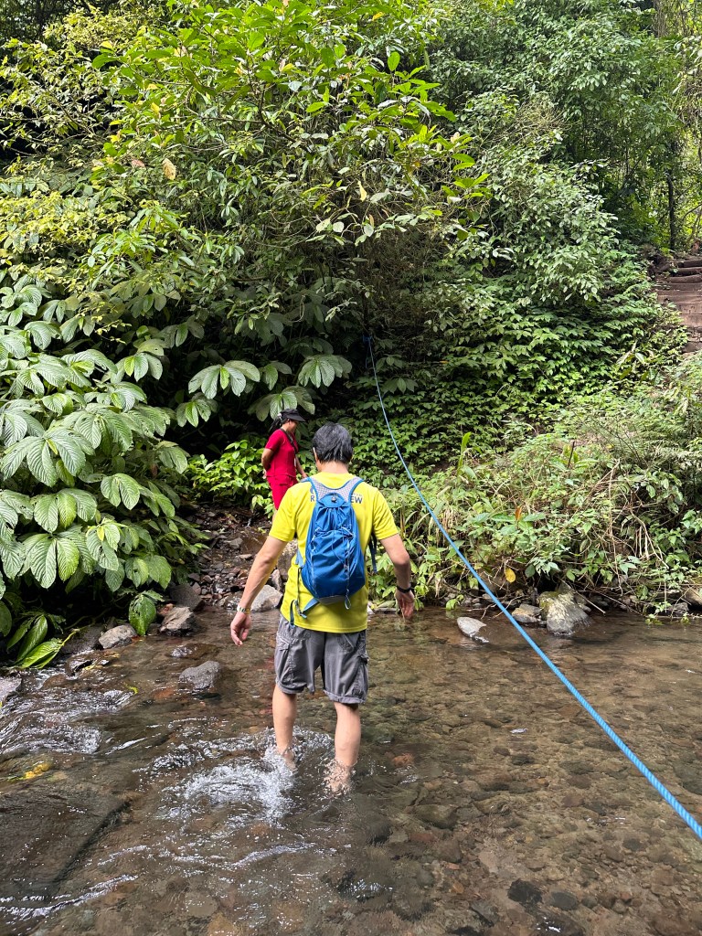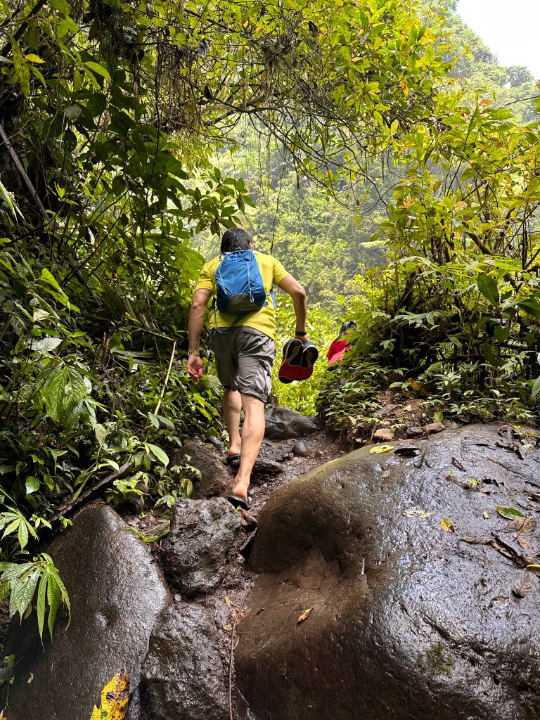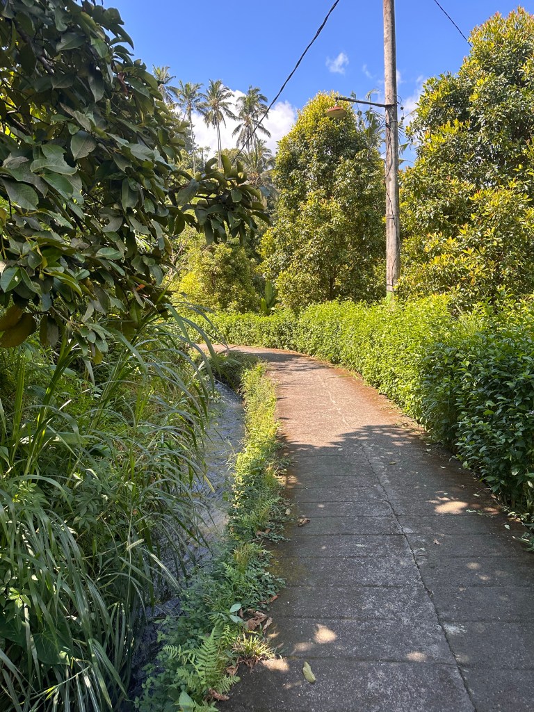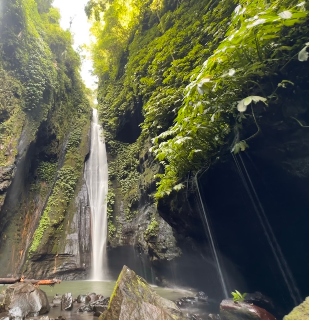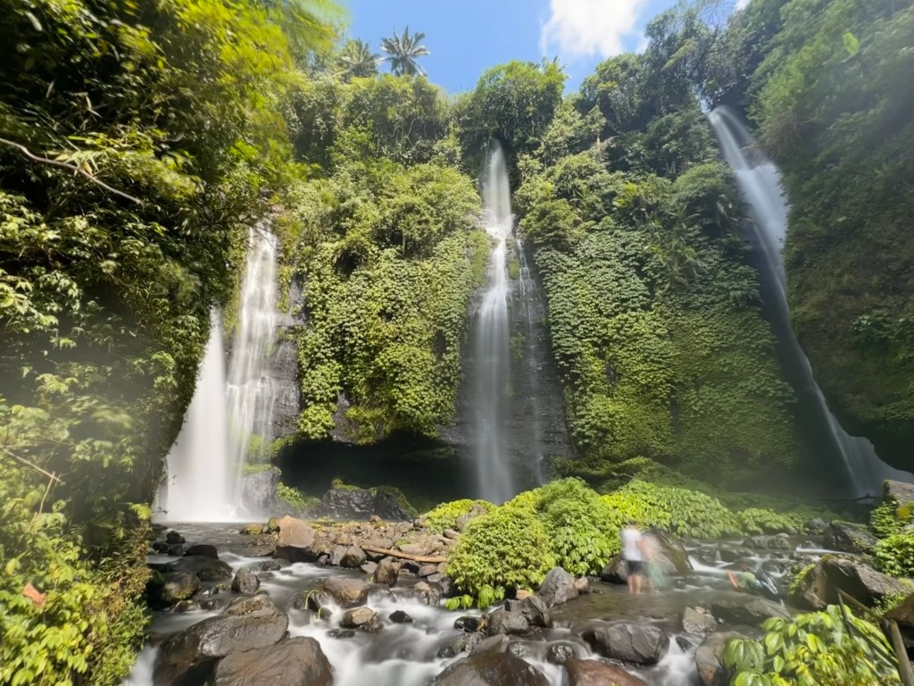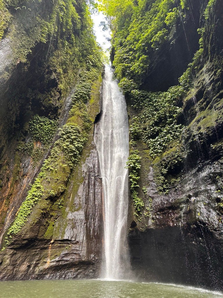 The first 10 minutes is on a paved local road to the second ticket booth. Those with scooters can ride all the way to this point and shave time off walking in the hot sun.Rice terraces alongside the road The path narrows past the second booth.Outside the cities and towns, Bali is stunningly green and lush.Another 10 minutes gets you to the first viewing platform of Sekumpul. From here on out, it’s all steps down to the bottom.View of Sekumpul from a lower vantage point.A preview of what to expect on the way back 🥵 Rudimentary signpostsThis stream crossing meant shedding our sneakers and hiking in our flip flops for the rest of the way.Hidden falls so named because it can’t be seen from above.Cascading down 230 ft. For those who don’t mind getting wet, this is a good spot for a swim to cool down.Looking back towards the trail. So lush!Then it was onwards to Sekumpul.Can’t fault me for imagining that a dinosaur could just be around the corner.Stream crossings helped cool us down just a tad.Have I mentioned “lush”?We humans are so insignificant.A rare photo of the two of us Having a guide ultimately proved useful. We would have had a hard time finding Fiji Waterfall from where we were.Ticket booth for Fiji waterfall More stream crossingsA glimpse of Fiji waterfallAs we got closer, we were pleasantly surprised to see that there were in fact four separate falls.Definitely worth the extra hike and time in the sun.Back up top – we realized that while we were busy heading down earlier, we had completely missed this view – Sekumpul on the left and Fiji tucked all the way in the (center) back.If there is such a thing as heaven on earth, this would be it.