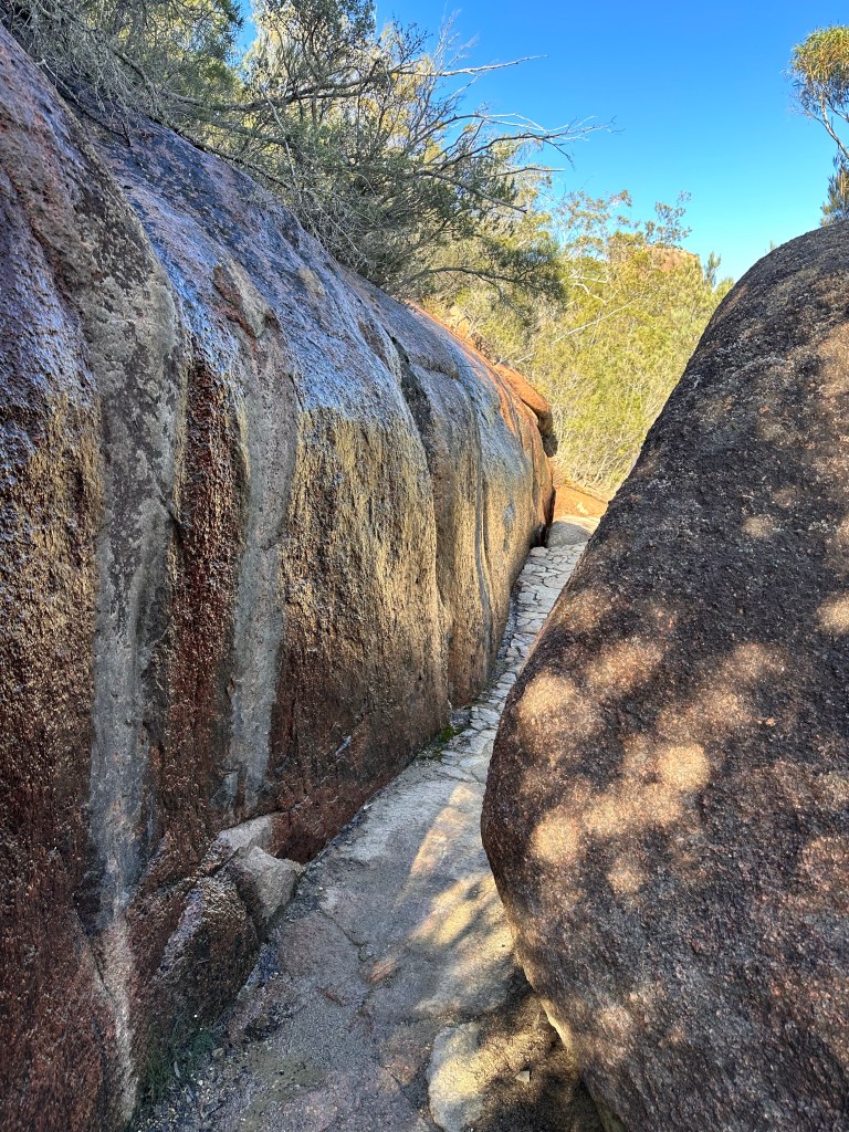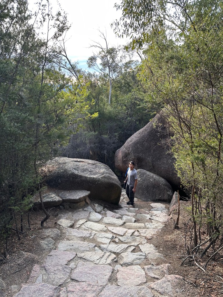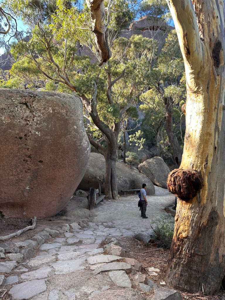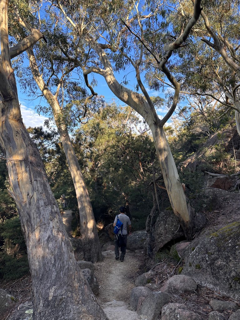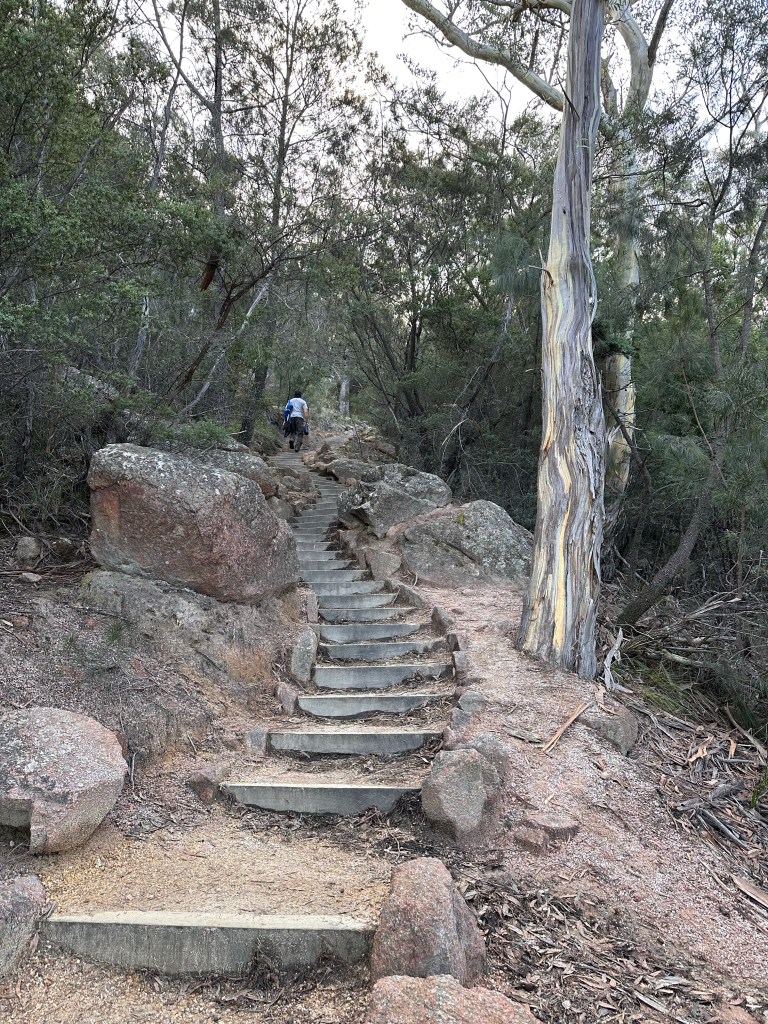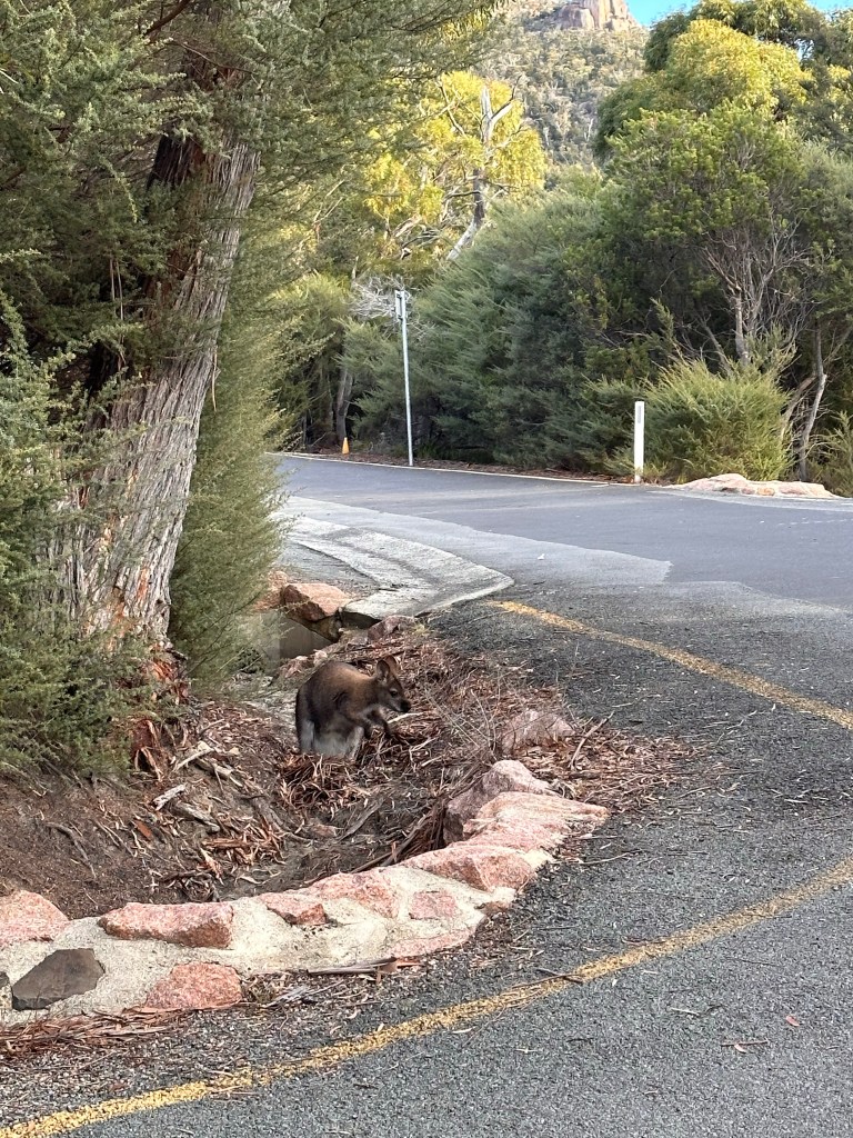 Several options to choose from. We chose to hike to the lookout and beach given the lack of time.The scenery at the start of the trail almost looks like the American Southwest.Lots of stone stepsWell graded trailWith visually interesting spots.View from the lookout- Wineglass Bay Beach on the left and Hazard beach on the right.Past the lookout is the straight descent down to the beach. Not exactly 1000 stairs, more like 891. Yes, we counted.Starting our descentHiking through eucalyptus forest.Trail branches at the bottom. You bet I would have done the longer loop had we had more time.A beautiful white sand beachToo cold to get into, but likely a popular spot during the summer..Heading back was surprisingly easy. Doable in the colder months, but I can see this being challenging in the warmer months.The return route past Cole’s Bay lookout is different than the one we hiked up, which made the return trip a bit more interesting.A bonus while leaving the parking lot, a Bennetts wallaby. Then it was a race against sunset to make it back to Hobart without hitting any wildlife on the road, and I’m relieved to report that there were no casualties.