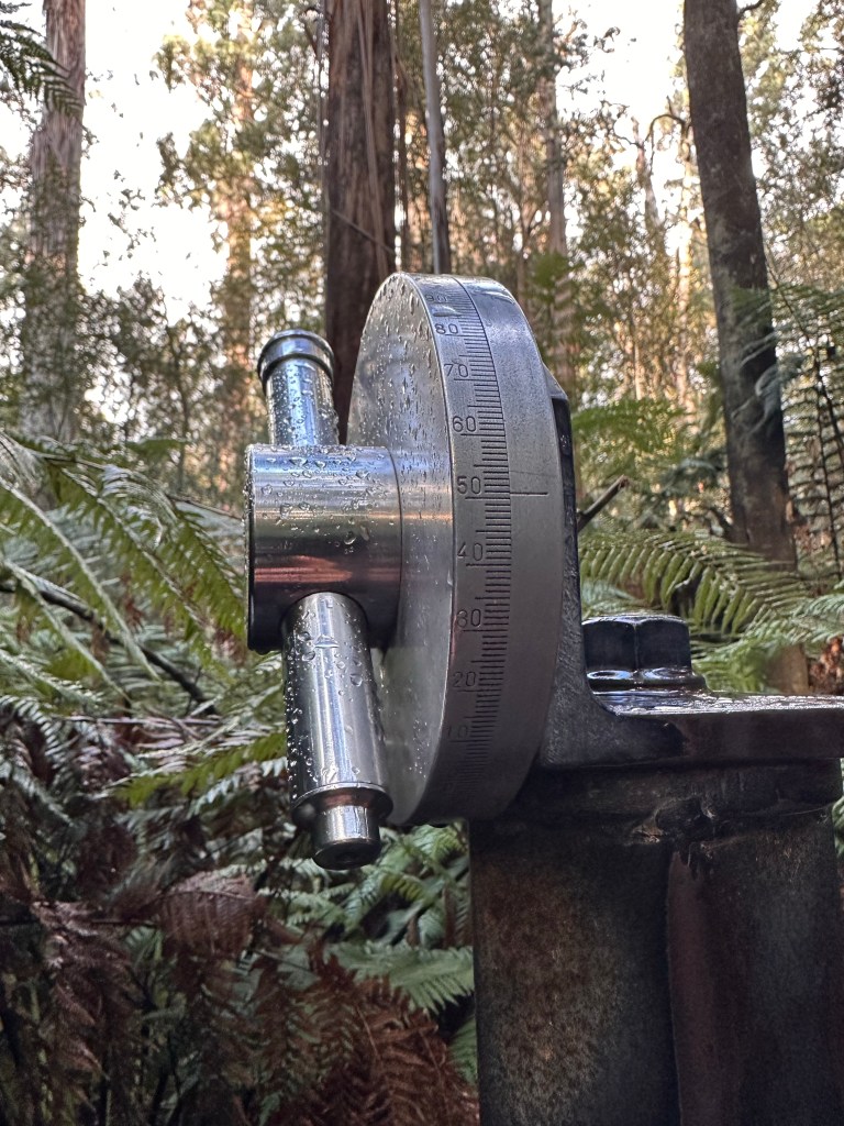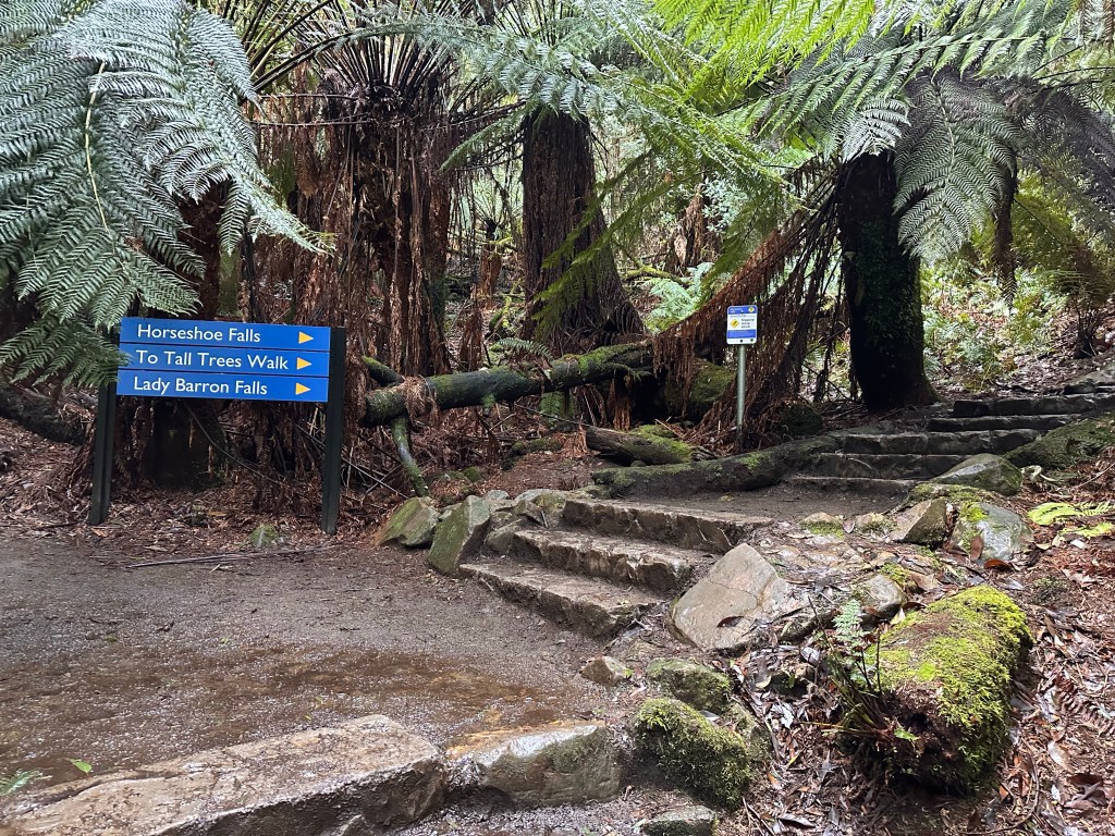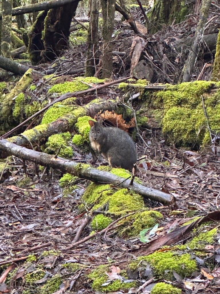 The trail starts at the visitor center, and is an easy flat walkthrough rainforest to Russell falls.A series of stone stepsand wooden stairs lead you toHorseshoe falls.The Tall Trees walk between Horseshoe and Lady Barron is through an eucalyptus forest. What has struck us during our time in Tasmania is that there are no koalas despite there being eucalyptus trees all around. Apparently, Koalas are only endemic in certain parts of mainland Australia, and introduction of koalas into Tasmania would pose a risk to the native Tasman habitat.Tasmanian pademelons, on the other hand, are everywhere.Sometimes hiking isn’t just aimlessly walking and admiring nature. Once in a while you get to learn a thing or two. Take the clinometer, for example. This instrument incorporates some basic trigonometry to help determine the height of a tree. Here’s how it works, 1) place the clinometer at a known distance (A) from the base of a tree; 2) look through the eyepiece and line it up with the top of the tree, this gives you θ (the numbers on the instrument); 3) recall SOH, CAH, TOA in trigonometry, in this case it would be tan(θ) = height of tree (O)/A, and voila! Who knew 9th grade math would come back to haunt me after all these years…Past the Tall Trees, the path winds back down through the rainforest to Lady Barron falls.Finally, a 40-minute walk back to the visitors center completes this 2-hour loop.
