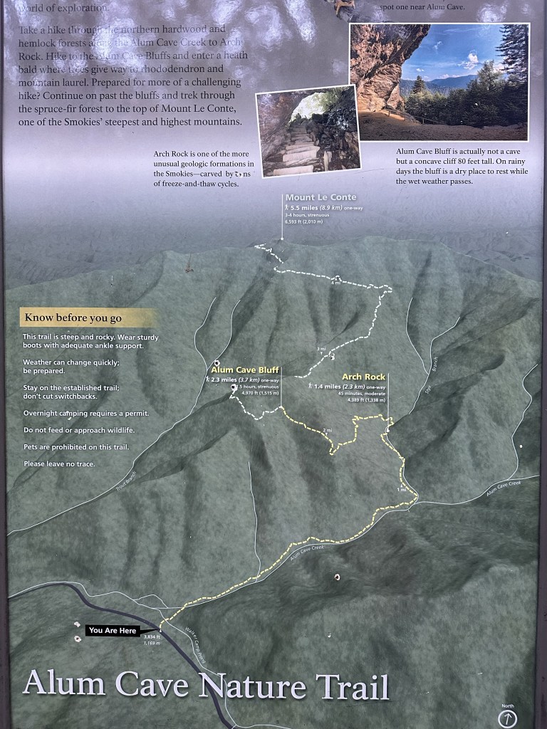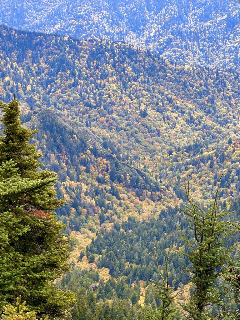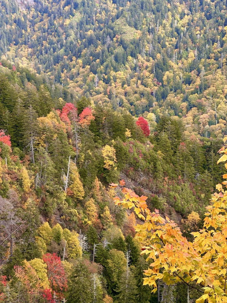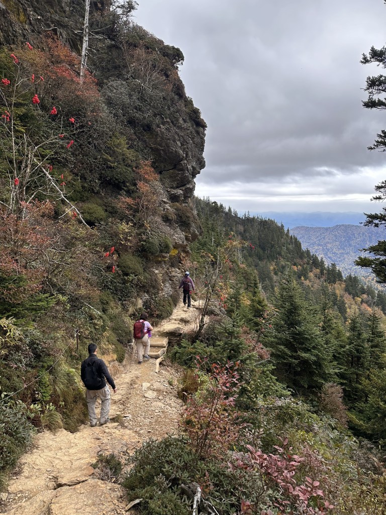 There are 6 different trails that lead up to Mount Le Conte. We chose the shortest, thus steepest, and the most scenic route – Alum Cave Nature Trail.Crossing the Alum Cave Creek.At Arch RockFall colors started a bit late this year, with a smattering of them along the trail.Bright redsNot quite as impressive as what we saw at Acadia National Park 2 years ago, but sure beats nothing at all.View at Alum CaveFor some, Alum Cave is their final destination.Past the cave, the trail gets a bit steeper and rockier.Reminds me of the Precipice trail in Acadia.Looks scarier than it is.View along the trail.The final push to the Cliff Tops Viewpoint. Mom and dad are to never see nor hear about this Vicky.View at the top – Great Smoky Mountains gets its name for the layers of vapors shrouding the ridge lines. The volatile organic compounds emitted by all the trees create this moody look. Some compounds contain a blue tint, giving the Blue Ridge Mountains their iconic color.