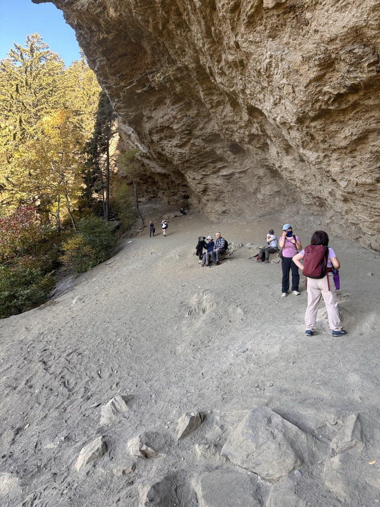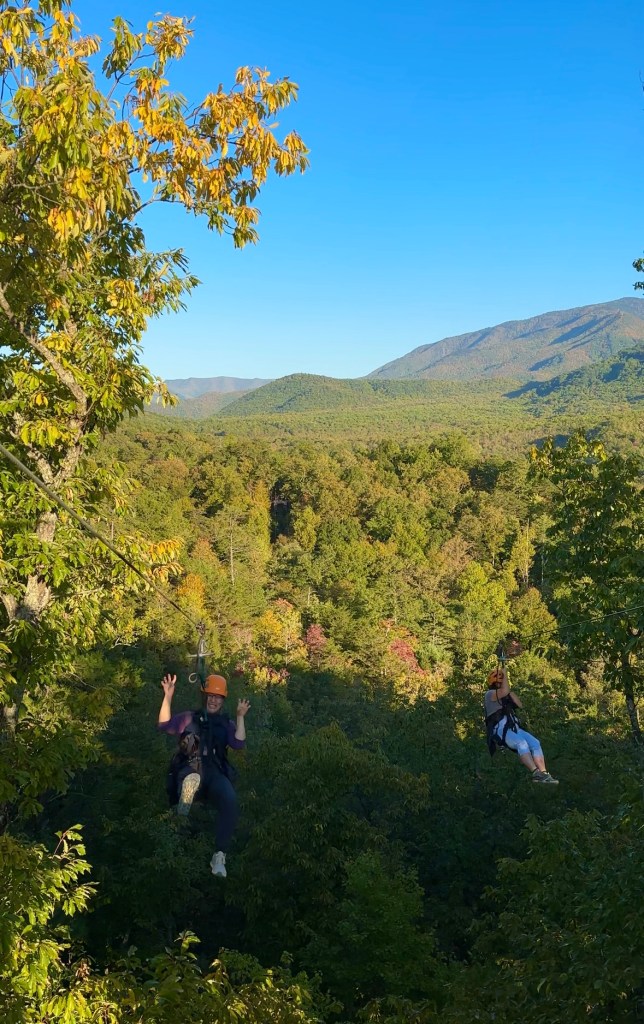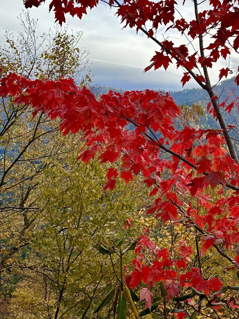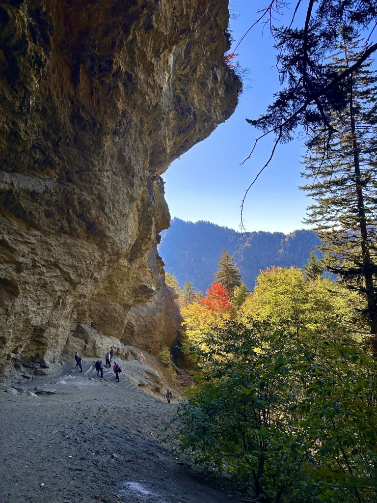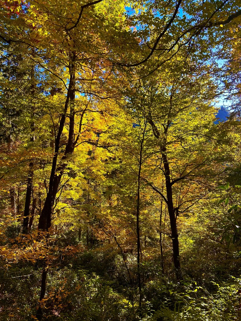 There are 6 different trails that lead up to Mount Le Conte. We chose the shortest, thus steepest, and the most scenic route – Alum Cave Nature Trail.Crossing the Alum Cave Creek.At Arch RockFall colors started a bit late this year, with a smattering of them along the trail.Bright redsNot quite as impressive as what we saw at Acadia National Park 2 years ago, but sure beats nothing at all.View at Alum CaveFor some, Alum Cave is their final destination.Past the cave, the trail gets a bit steeper and rockier.Reminds me of the Precipice trail in Acadia.Looks scarier than it is.View along the trail.The final push to the Cliff Tops Viewpoint. Mom and dad are to never see nor hear about this Vicky.View at the top – Great Smoky Mountains gets its name for the layers of vapors shrouding the ridge lines. The volatile organic compounds emitted by all the trees create this moody look. Some compounds contain a blue tint, giving the Blue Ridge Mountains their iconic color.