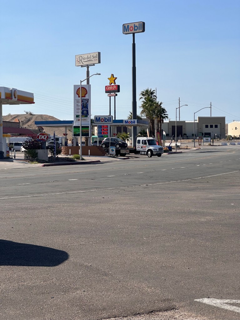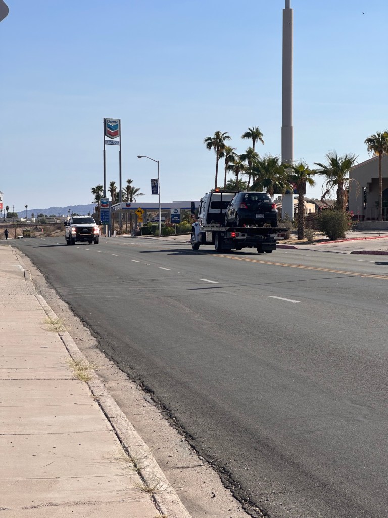 Unfortunately, my car battery died right before the CA-AZ border. Luckily, it happened at a gas station located across from an auto shop, and not along the Mojave Desert or at the remote trailhead, where there is no cell service whatsoever.My trusty little Yaris loaded on a flatbed making its way to A+ AutoCare in Needles, CA. The owner, Dave, and his mechanic, Sonny, got me back on the road 3 hours later, and I made it to the Grand Canyon Caverns Inn for check in with 20 minutes to spare.