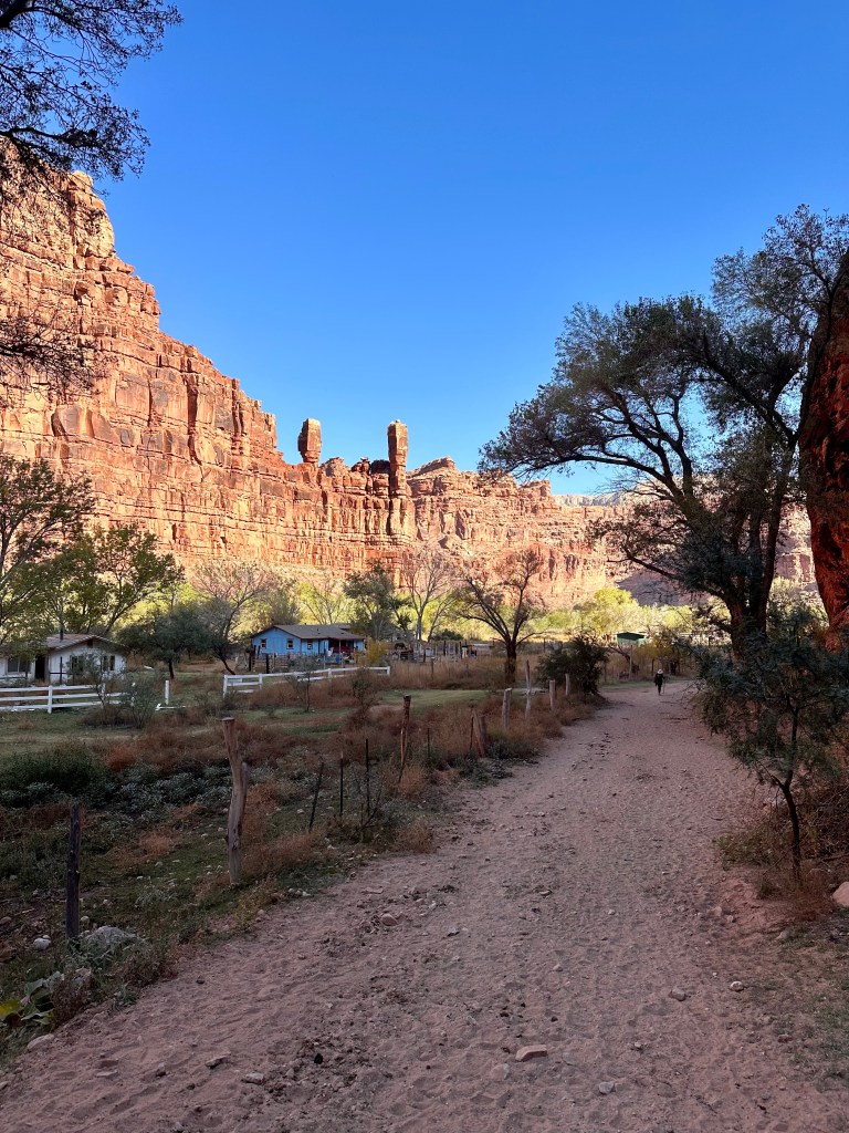This is the view I didn’t get to see while hiking in the dark 7 weeks ago.The canyon closes in at around mile 5, and for someone who is partial to red rocks this is a real treat.The first glimpse of the Supai village at mile 7.Havasu Falls comes into view shortly before mile 10.