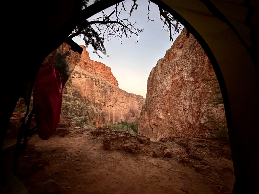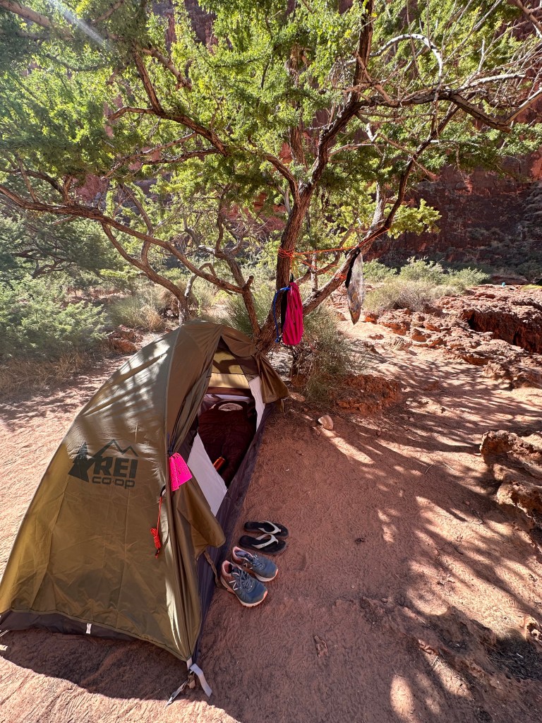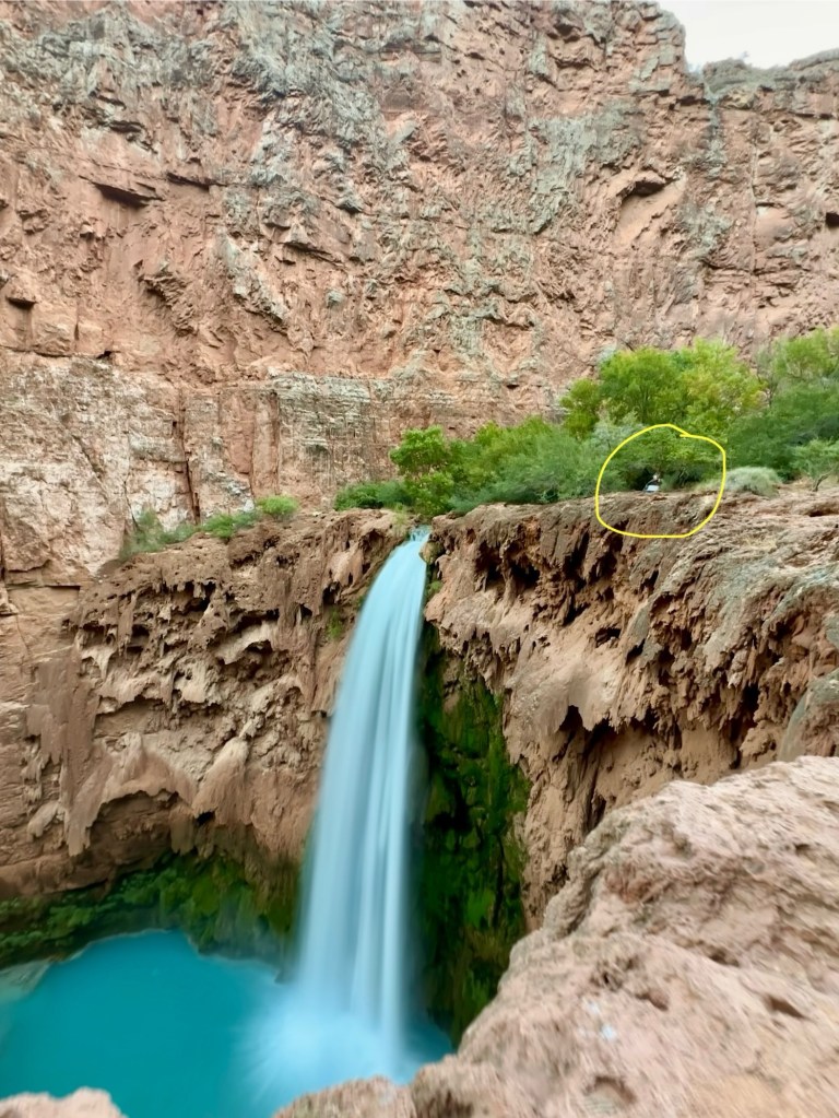 Being one of the first hikers to reach campground, I made a beeline for the coveted spot.And set up my tent (circled in yellow) at the edge of Mooney Falls.Home sweet home for the next 4 days.This stunning canyon view greeted me every morning as I unzipped my tent.Peering over the edge netted a view of the turquoise water.A few steps behind my tent is this series of cascades before the water drops down 200ft.