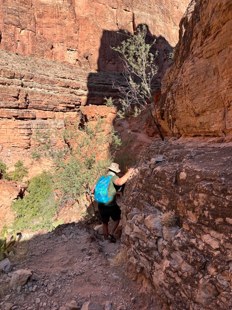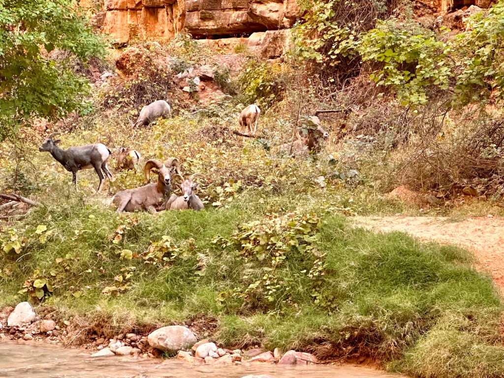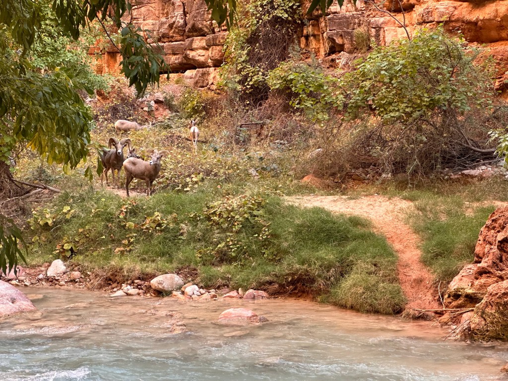 Two miles in from Mooney is where the trail forks. Beaver falls is down to the left, and the Confluence continues on up to the right.Beaver falls. This is where Lori stayed behind since she had already done the Confluence, and I tagged along with a young couple from San Diego to hike onward to the Confluence.About 100 ft from the split you leave Havasupai tribal land and enter Grand Canyon National Park. This is looking at the sign from the other direction. Some Colorado rafting outfitters will bring people to the Confluence and have them hike up to this point. This signage is to warn them not to proceed further as they would be entering private land.Parts of the trail were a bit sketchy.First water crossing starts after scrambling down this cliff.At the second water crossing we saw that our path was blocked by a flock of big horned sheep.Rutting season runs from July through December, and the males get extra aggressive during this time. So our onward path was essentially blocked, especially when the three big ones laid down and showed no signs of moving anytime soon. I wasn’t planning on getting rammed by 1000-lbs of force so we decided that it was best to take our retreat.