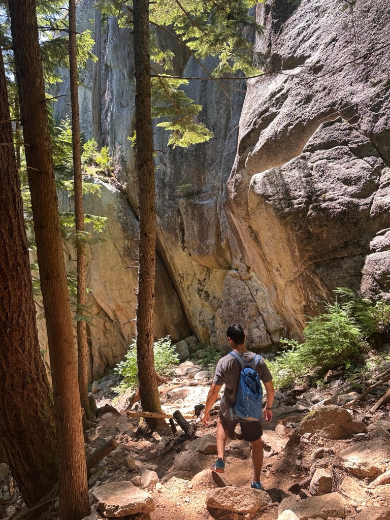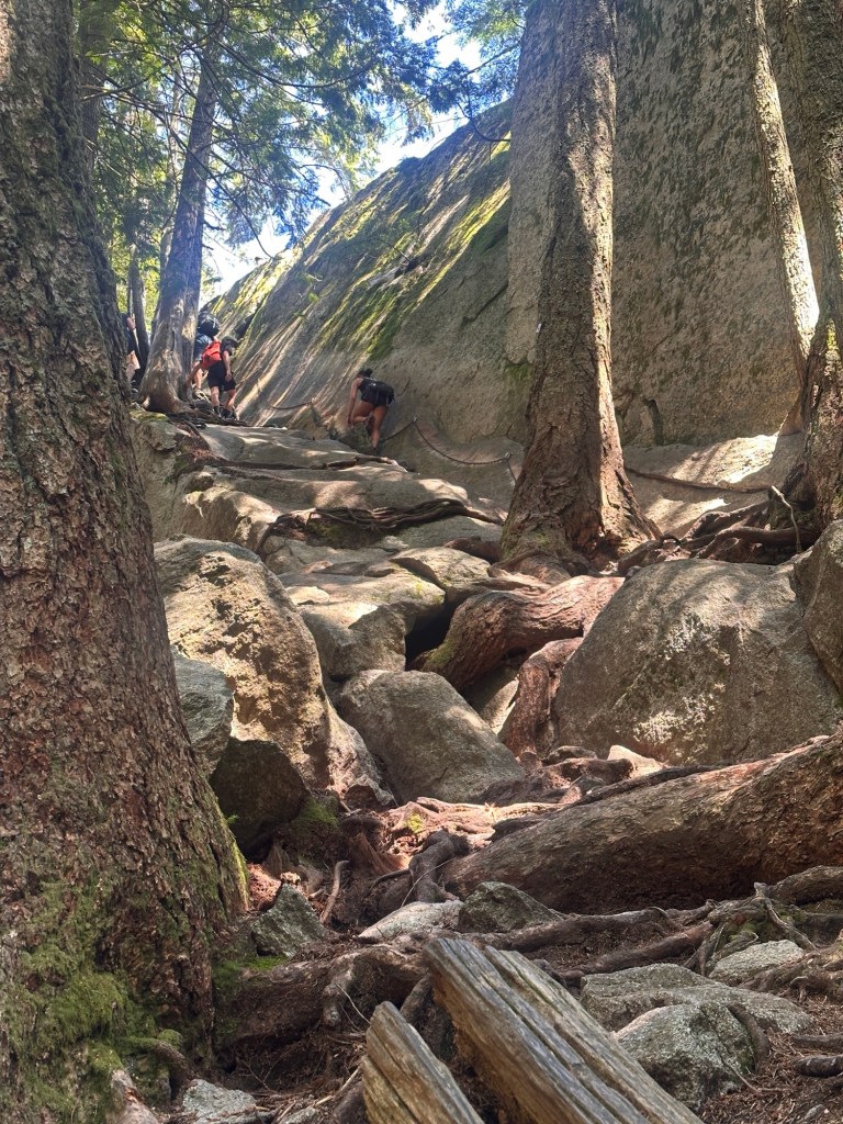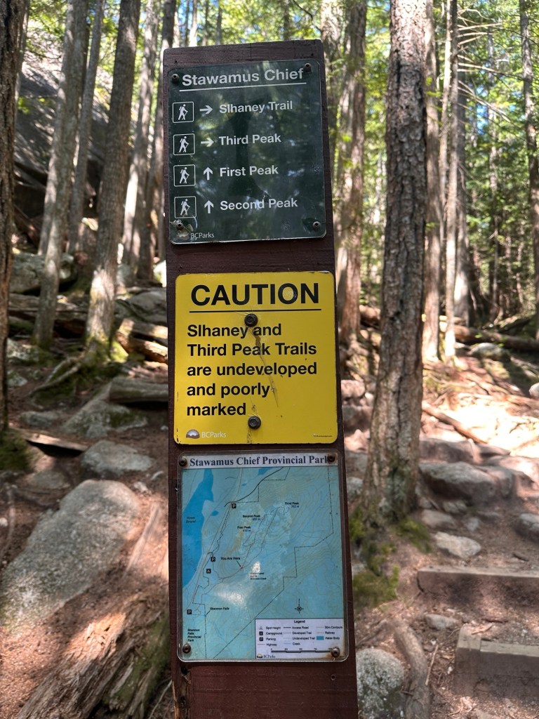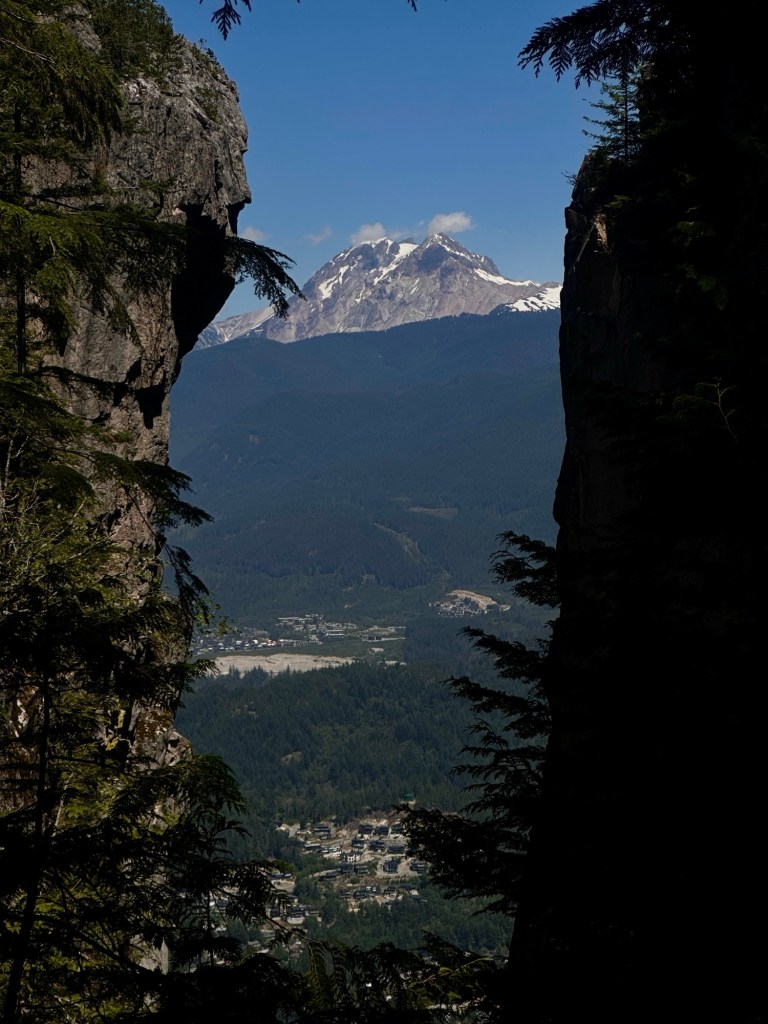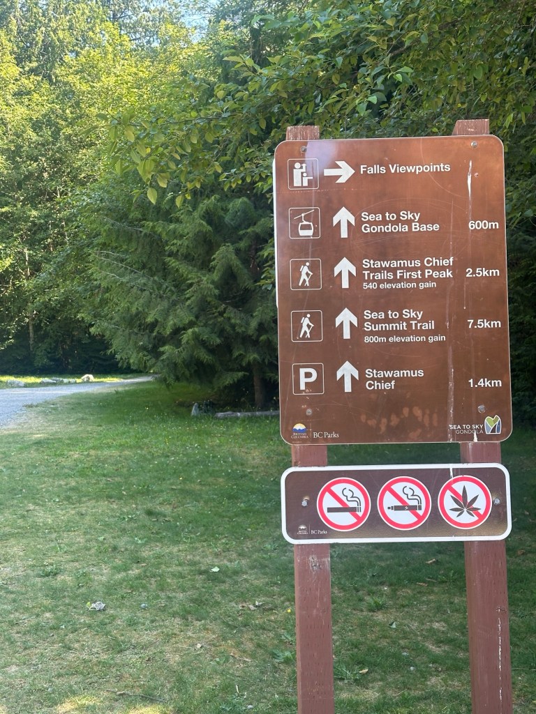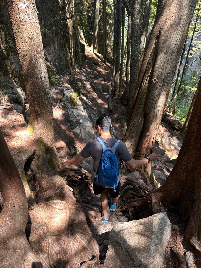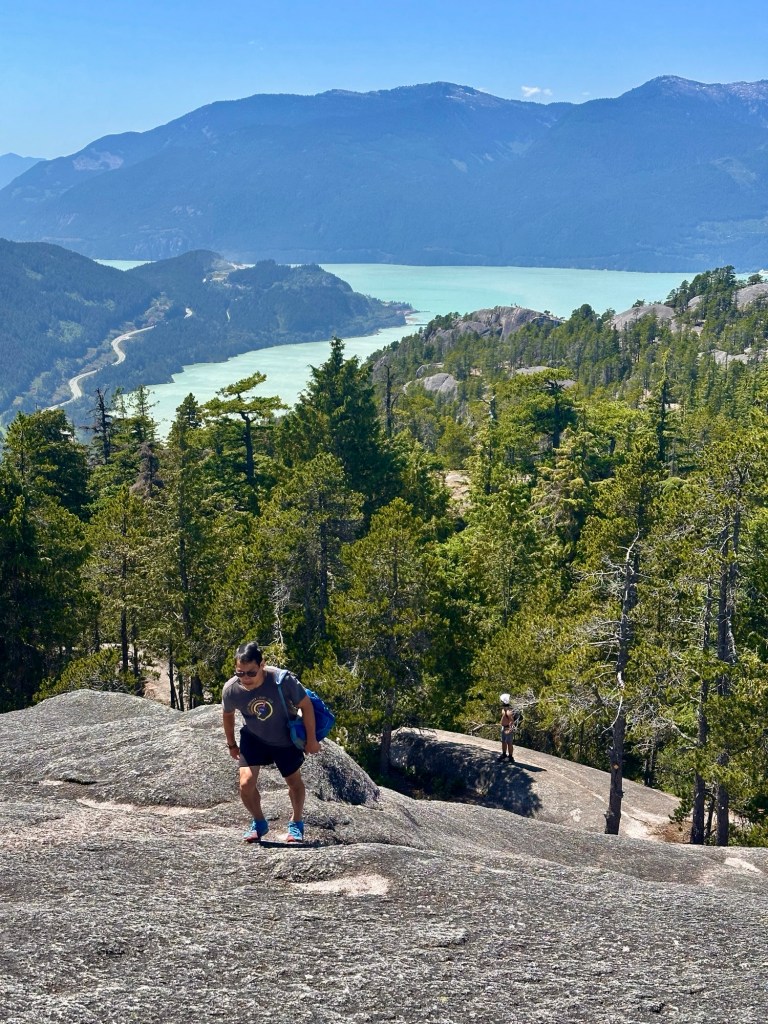 Seen from the lower viewpoint Closer look from the upper viewing platform.Conveniently located next to Shannon falls is the Stawamus Chief trail.The short 3.6-mile loop is nothing short of fun. There are 3 peaks offering slightly different views, and hikers can tailor their hike accordingly. AllTrails recommends hiking counter clockwise, hitting peak 3 first. We went in blind and did it clockwise.The initial section is what I like to call “Stair Master” hikes involving wooden stairsAnd granite steps.Trail is pretty developed until you get to the chain sections And this is when it gets funWith a ladder thrown inEasy on a dry sunny day, but likely not so when the rocks are wet and slick.View of Howe Sound from the top of the second peak. We skipped the first peak, but you can spot all the people on the first peak in the distance.Hiked up a couple of Mello donuts to enjoy at the top.The trail onward to the third peak with clear route markers is pretty easy to follow.Mount Garibaldi towering over Squamish townsite.Attempting a daring shot.Last push to the topThird peak offers an unobstructed view of the snow capped Mamquam Mountain.We had missed this sign on the main trail when we hiked up, and this was the trail we took coming back down.It looked deceivingly easy in the beginning But gradually became more challenging.Scrambling down large boulders was fun, but proved to be a bit much for Joe’s ankles.The bright yellow route markers were a nice touch I’m personally partial to this type of rugged trail, but kudos to the parks people for building steps in the other sections.
