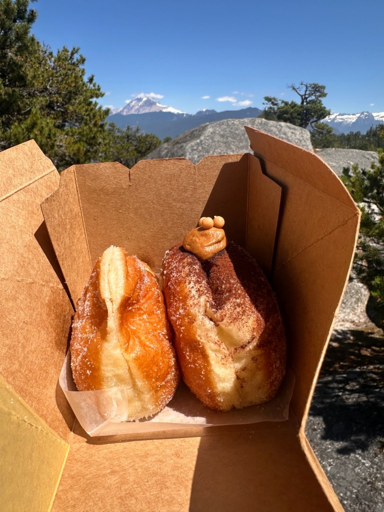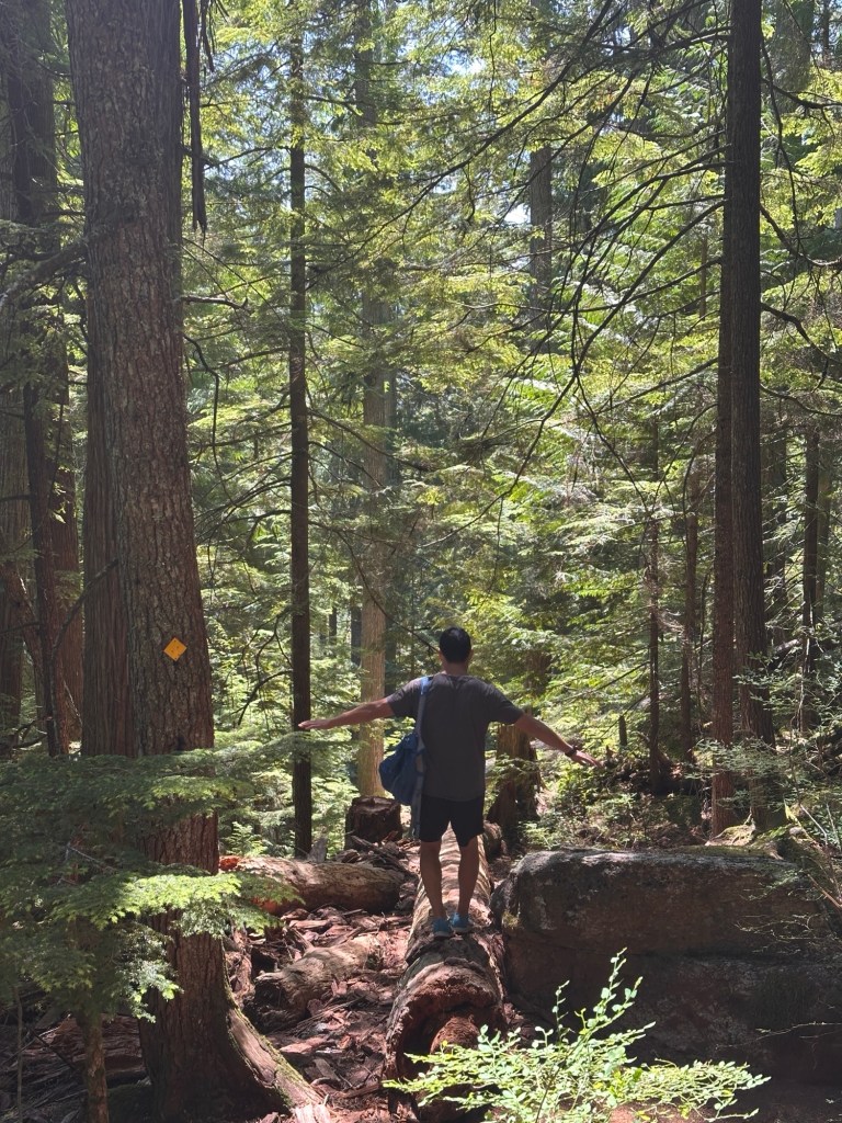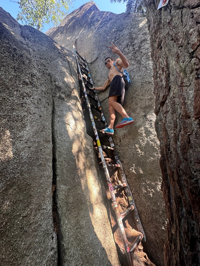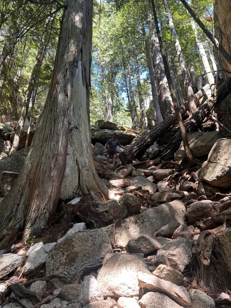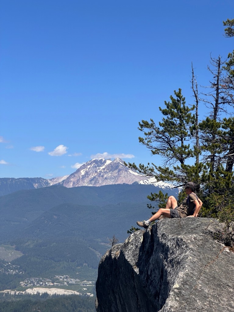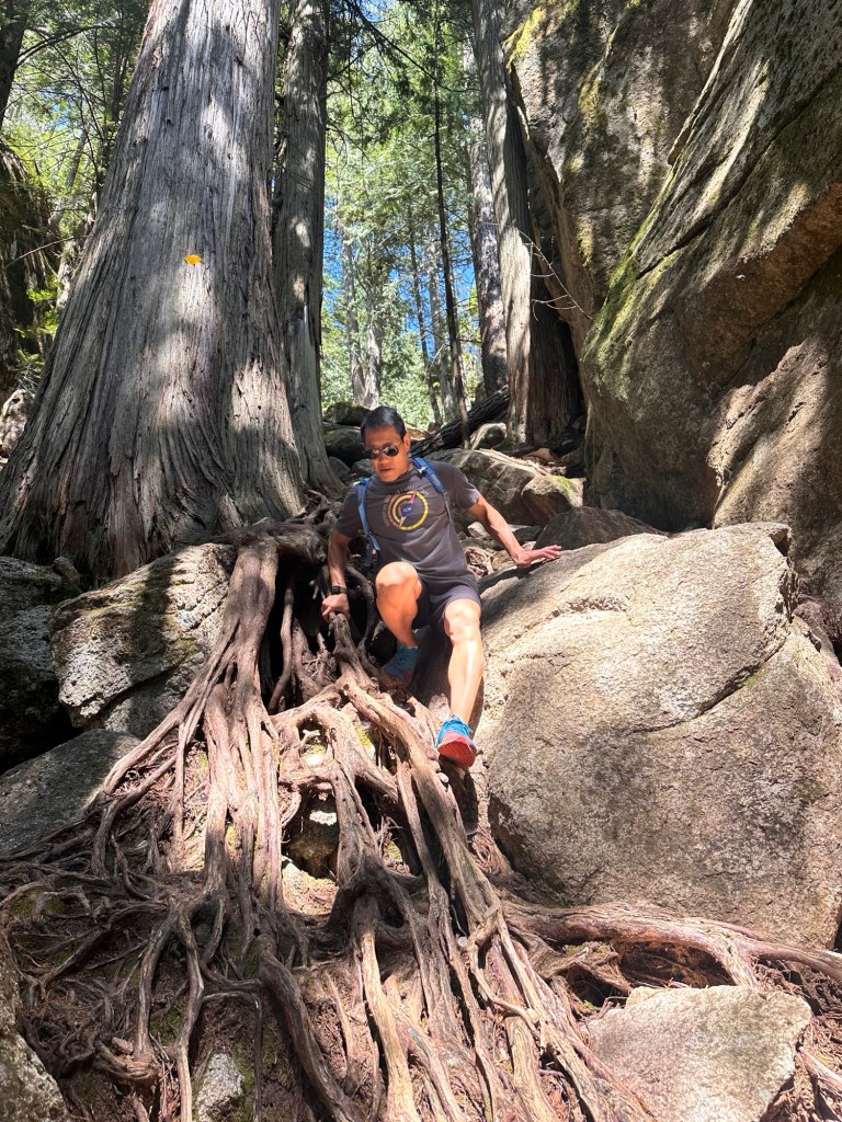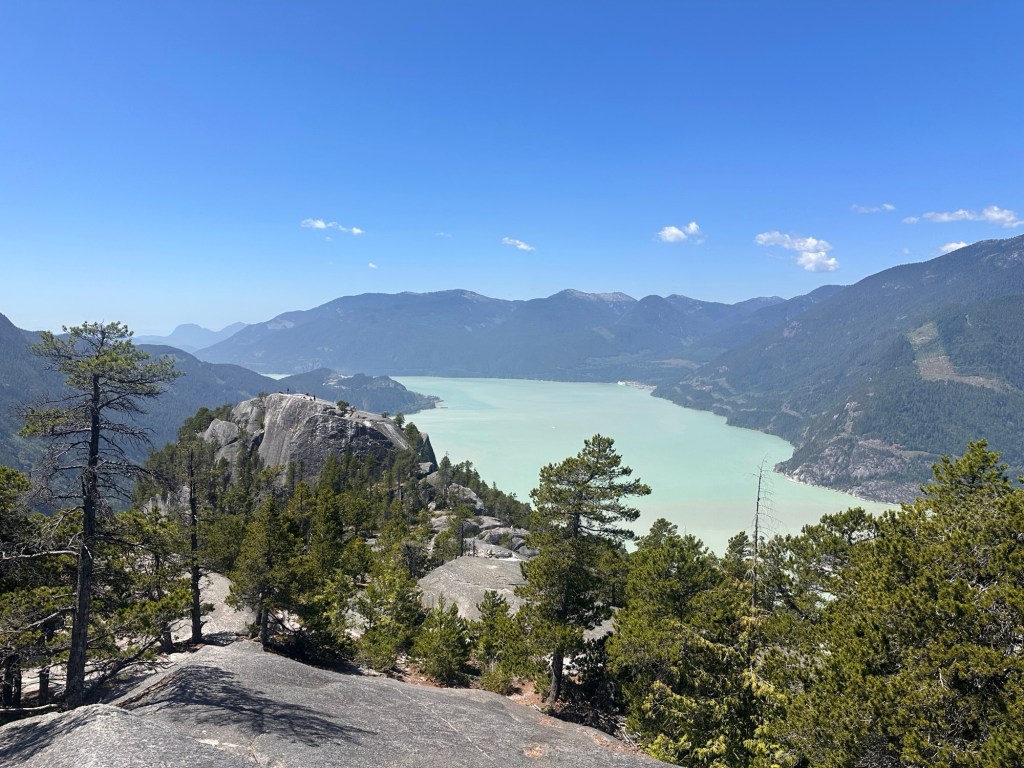 Seen from the lower viewpoint Closer look from the upper viewing platform.Conveniently located next to Shannon falls is the Stawamus Chief trail.The short 3.6-mile loop is nothing short of fun. There are 3 peaks offering slightly different views, and hikers can tailor their hike accordingly. AllTrails recommends hiking counter clockwise, hitting peak 3 first. We went in blind and did it clockwise.The initial section is what I like to call “Stair Master” hikes involving wooden stairsAnd granite steps.Trail is pretty developed until you get to the chain sections And this is when it gets funWith a ladder thrown inEasy on a dry sunny day, but likely not so when the rocks are wet and slick.View of Howe Sound from the top of the second peak. We skipped the first peak, but you can spot all the people on the first peak in the distance.Hiked up a couple of Mello donuts to enjoy at the top.The trail onward to the third peak with clear route markers is pretty easy to follow.Mount Garibaldi towering over Squamish townsite.Attempting a daring shot.Last push to the topThird peak offers an unobstructed view of the snow capped Mamquam Mountain.We had missed this sign on the main trail when we hiked up, and this was the trail we took coming back down.It looked deceivingly easy in the beginning But gradually became more challenging.Scrambling down large boulders was fun, but proved to be a bit much for Joe’s ankles.The bright yellow route markers were a nice touch I’m personally partial to this type of rugged trail, but kudos to the parks people for building steps in the other sections.