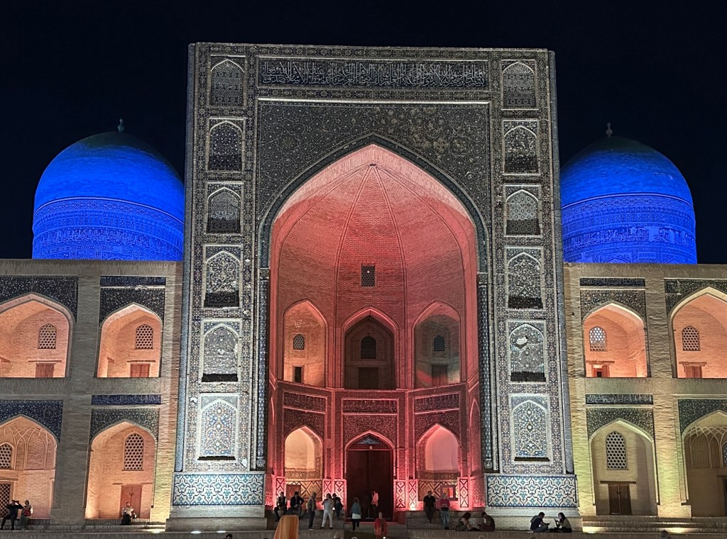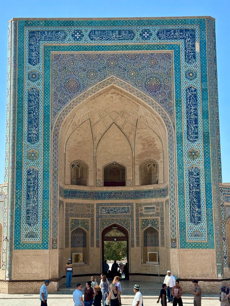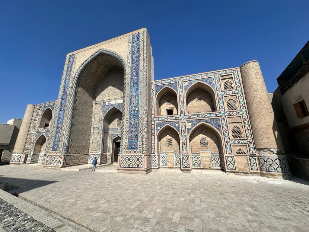 Abdul Aziz Khan madrasa on the left and Ulugbek madrasa on the right.Built in 1417, the Ulugbek madrasa is one of 3 built by the astronomer and is the oldest in Central Asia.The relatively simple blue and white façade.Inner courtyard It currently houses a small calligraphy museum displaying Arabic calligraphy on all sorts of items.