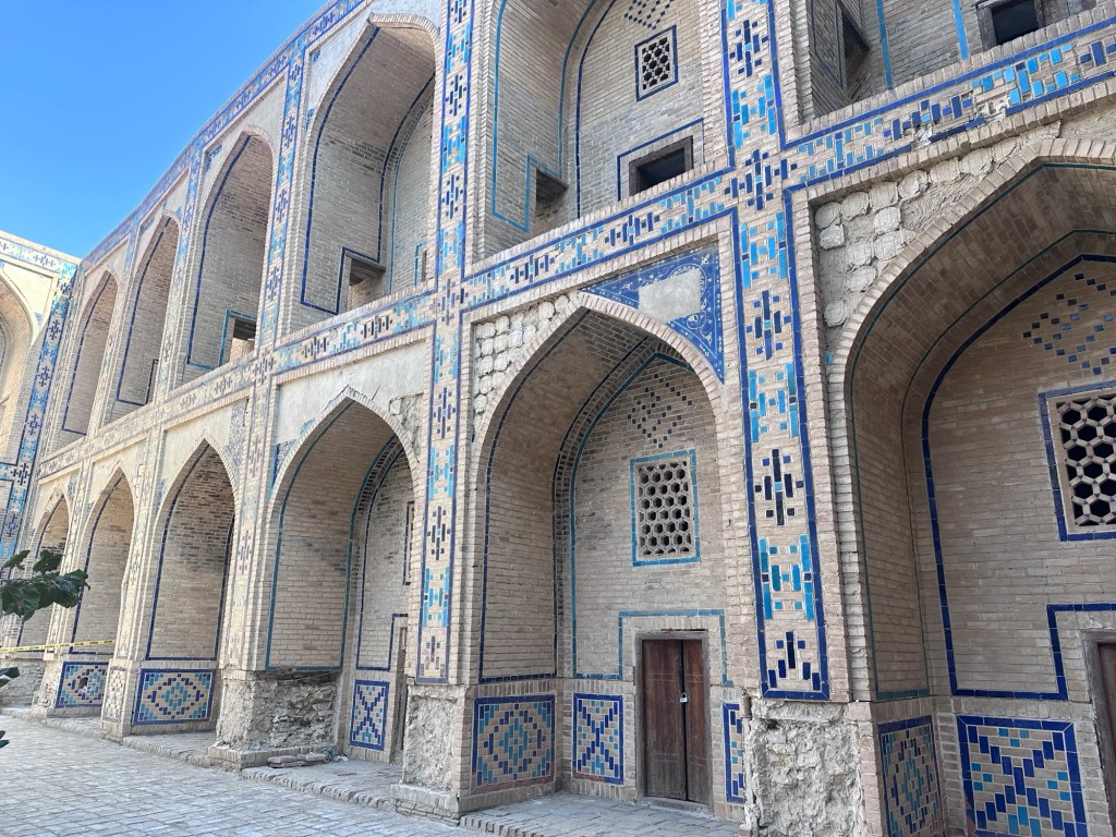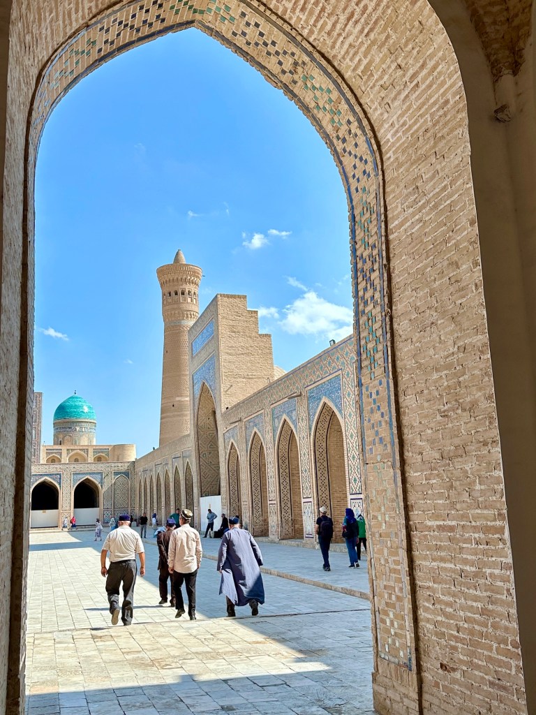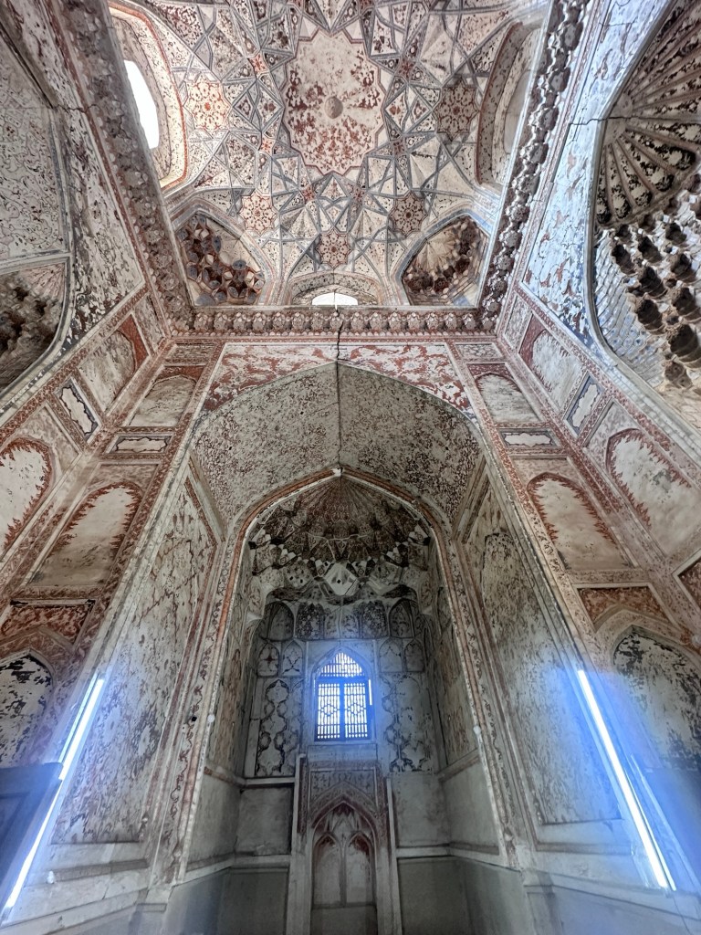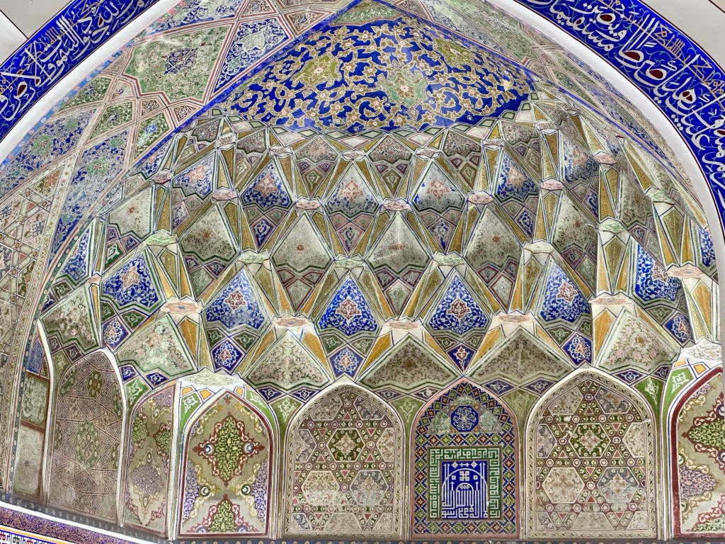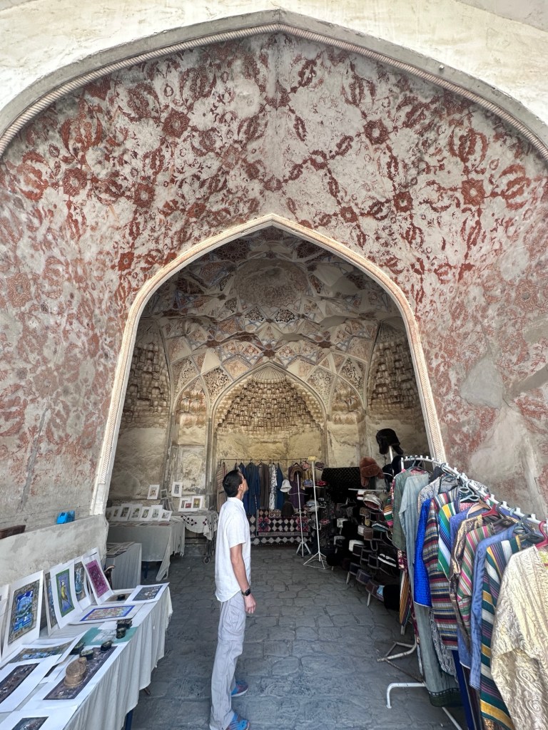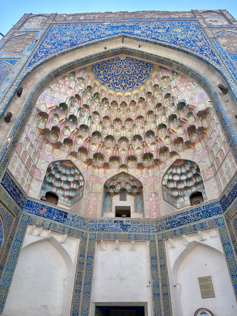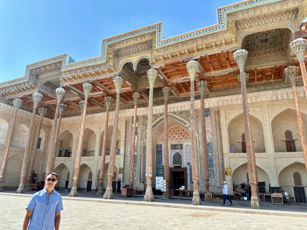 A video walkthrough of a room.Abdul Aziz Khan decided to build a more elaborate one across the way in 1652.With beautiful stalactites entryway.Can’t get more stunning than this.One of the living quarters still has its original wall paintings and fireplace.Stalactite ceiling FireplaceThe prayer room houses the woodcarving museum. The mihrab is said to have Abdul Aziz’s image embedded (bottom center) despite Islamic traditions forbidding such practice.Joe next to the Abdul Aziz imageThe working Mir-I-Arab madrasa sits across from the Kalon Mosque. Under the left dome is a burial vault, and under the right one is a small mosque.Entryway to the Kalon mosque.Peaking into the courtyard.WorshippersA view of one of the Mir-I-Arab domes and the Kalon minaret from the courtyard.Standing at 155ft the Kalon minaret, built in 1127, was so impressive that Genghis Khan ordered his men to spare the tower when they laid waste to the rest of the town in 1220.The backside of the mosque.