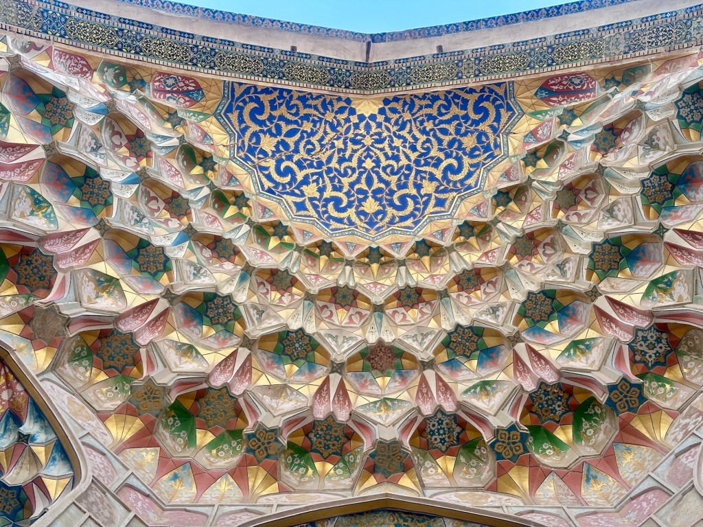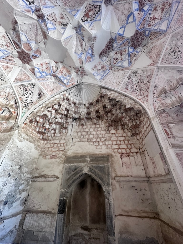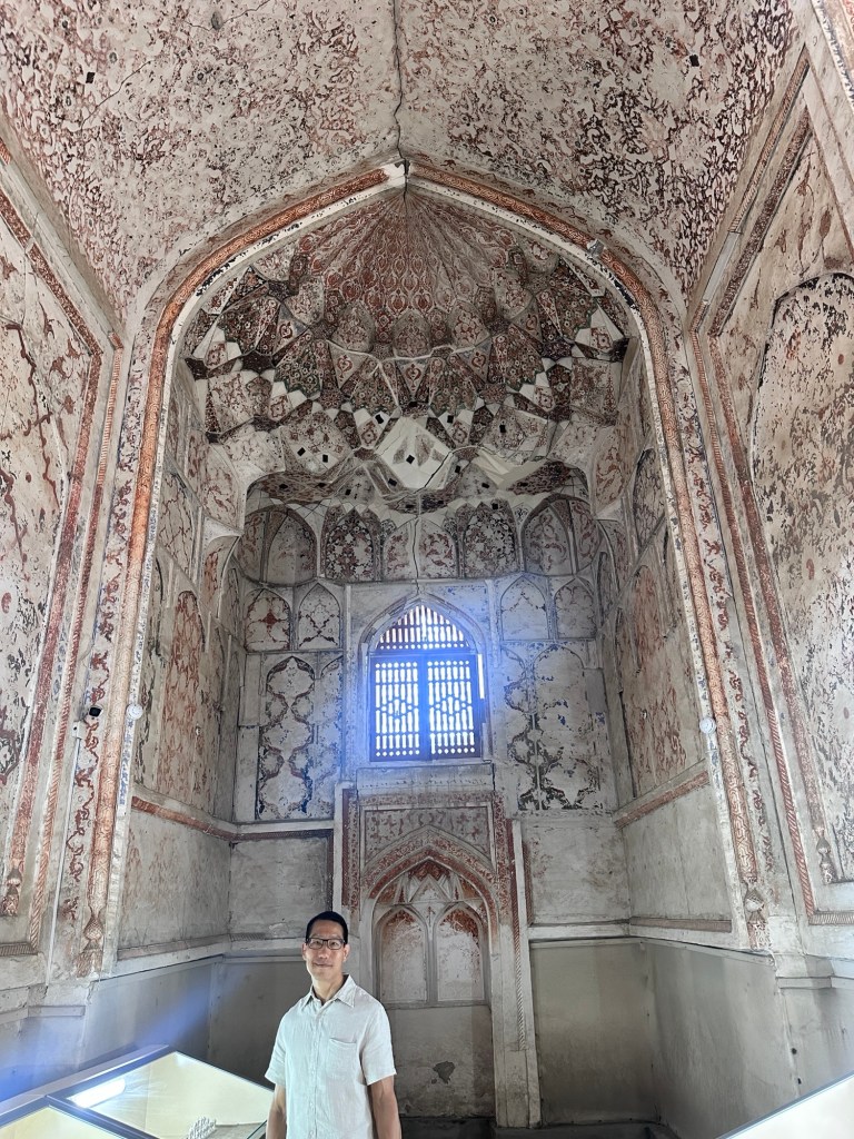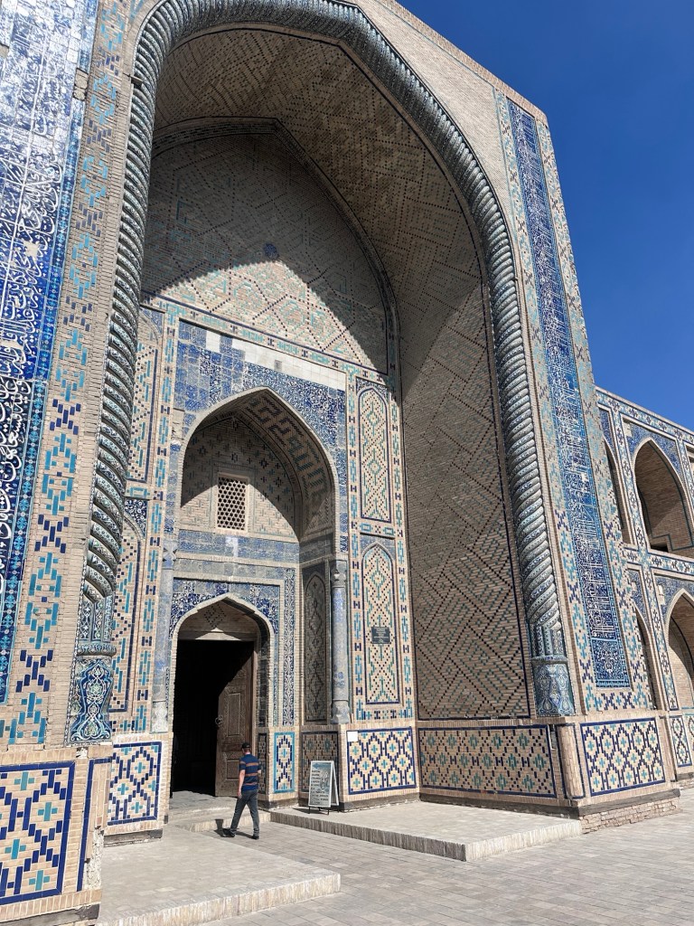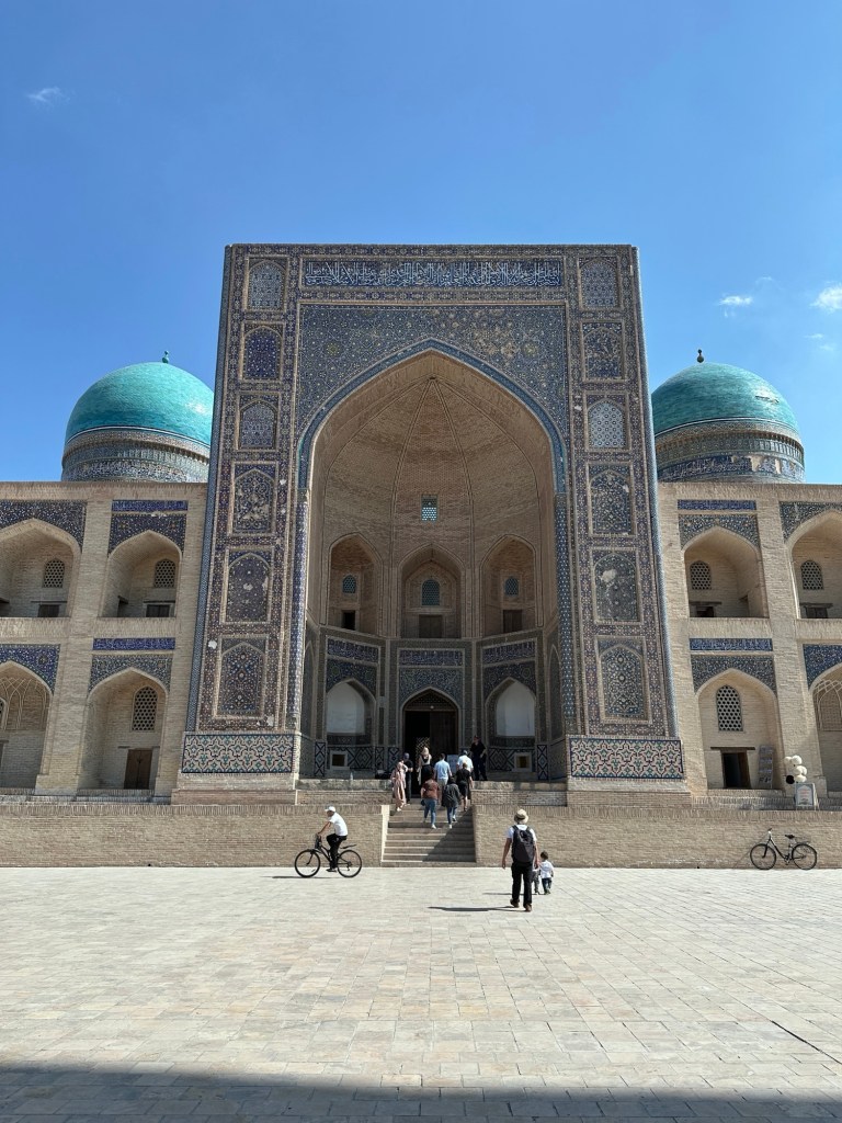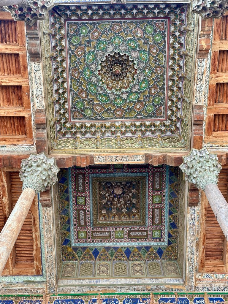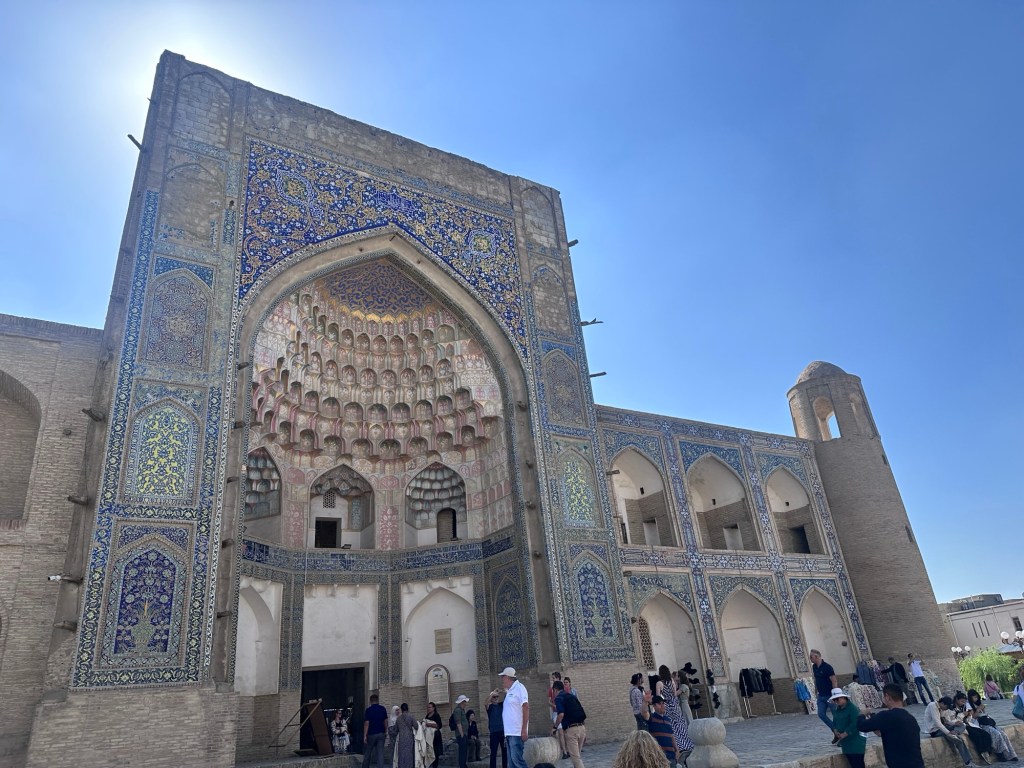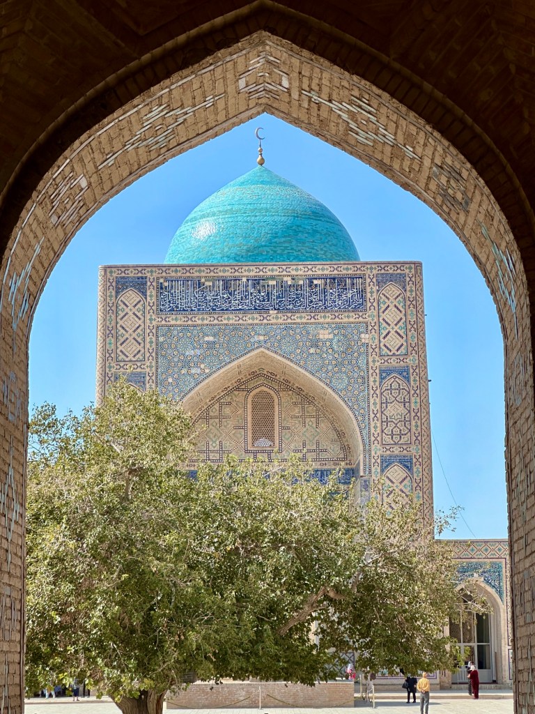 A video walkthrough of a room.Abdul Aziz Khan decided to build a more elaborate one across the way in 1652.With beautiful stalactites entryway.Can’t get more stunning than this.One of the living quarters still has its original wall paintings and fireplace.Stalactite ceiling FireplaceThe prayer room houses the woodcarving museum. The mihrab is said to have Abdul Aziz’s image embedded (bottom center) despite Islamic traditions forbidding such practice.Joe next to the Abdul Aziz imageThe working Mir-I-Arab madrasa sits across from the Kalon Mosque. Under the left dome is a burial vault, and under the right one is a small mosque.Entryway to the Kalon mosque.Peaking into the courtyard.WorshippersA view of one of the Mir-I-Arab domes and the Kalon minaret from the courtyard.Standing at 155ft the Kalon minaret, built in 1127, was so impressive that Genghis Khan ordered his men to spare the tower when they laid waste to the rest of the town in 1220.The backside of the mosque.