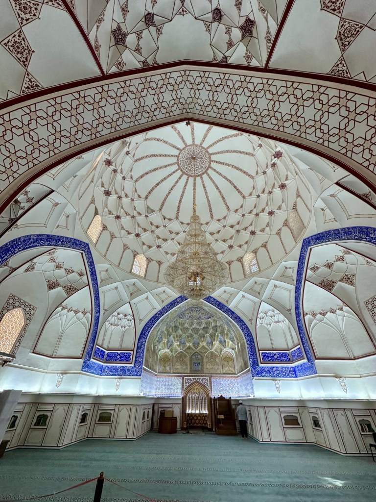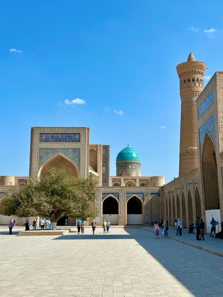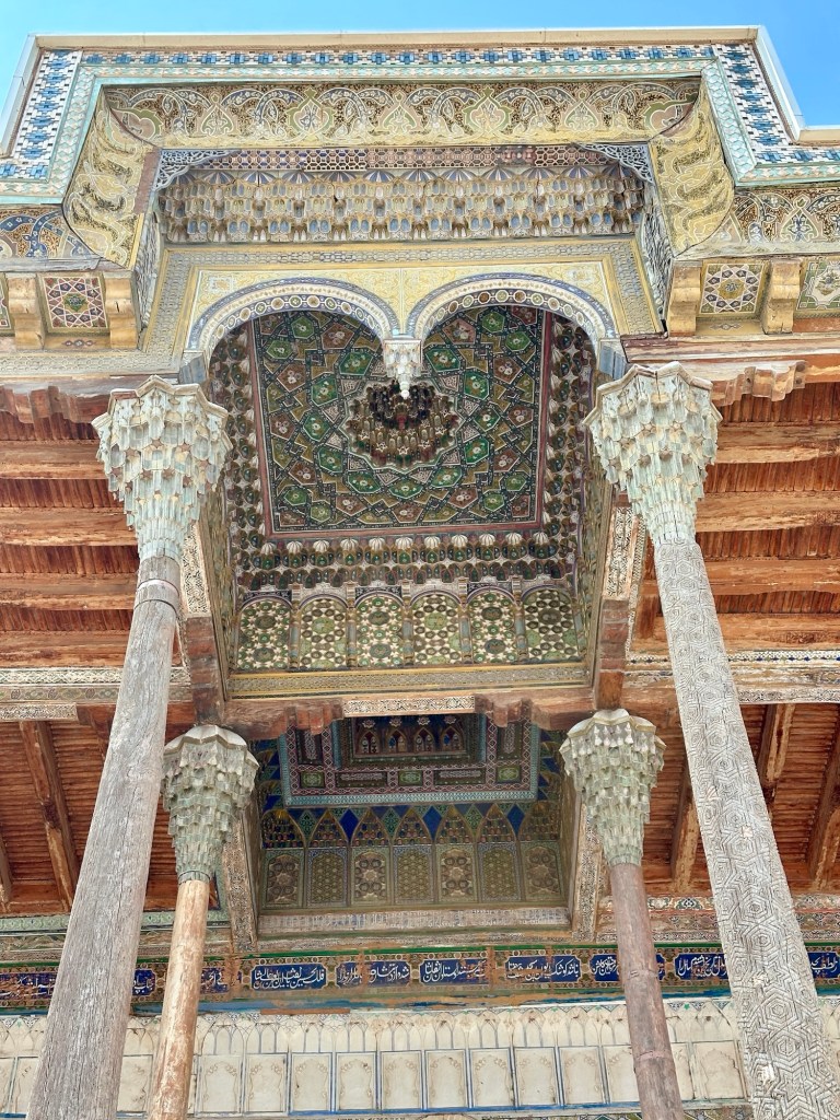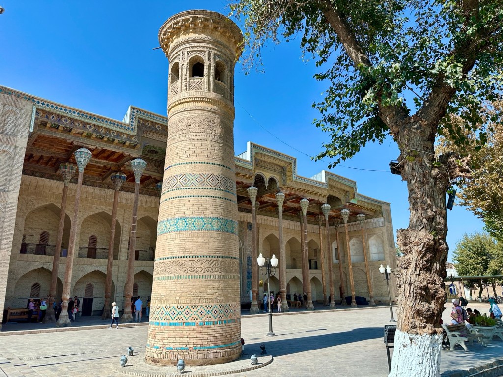 Built in 1718, the Bolo-Hauz Mosque was the emir’s official worship site.The wood columns (each sculpted a different pattern) and carvings stand in contrast to the styles we’ve seen in the town center.But it is no less beautiful.The white interior lends an airy feel despite it being much smaller than a lot of the more modern mosques we’ve been in so far.Close upMinaret in front of the mosque